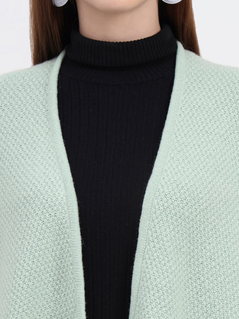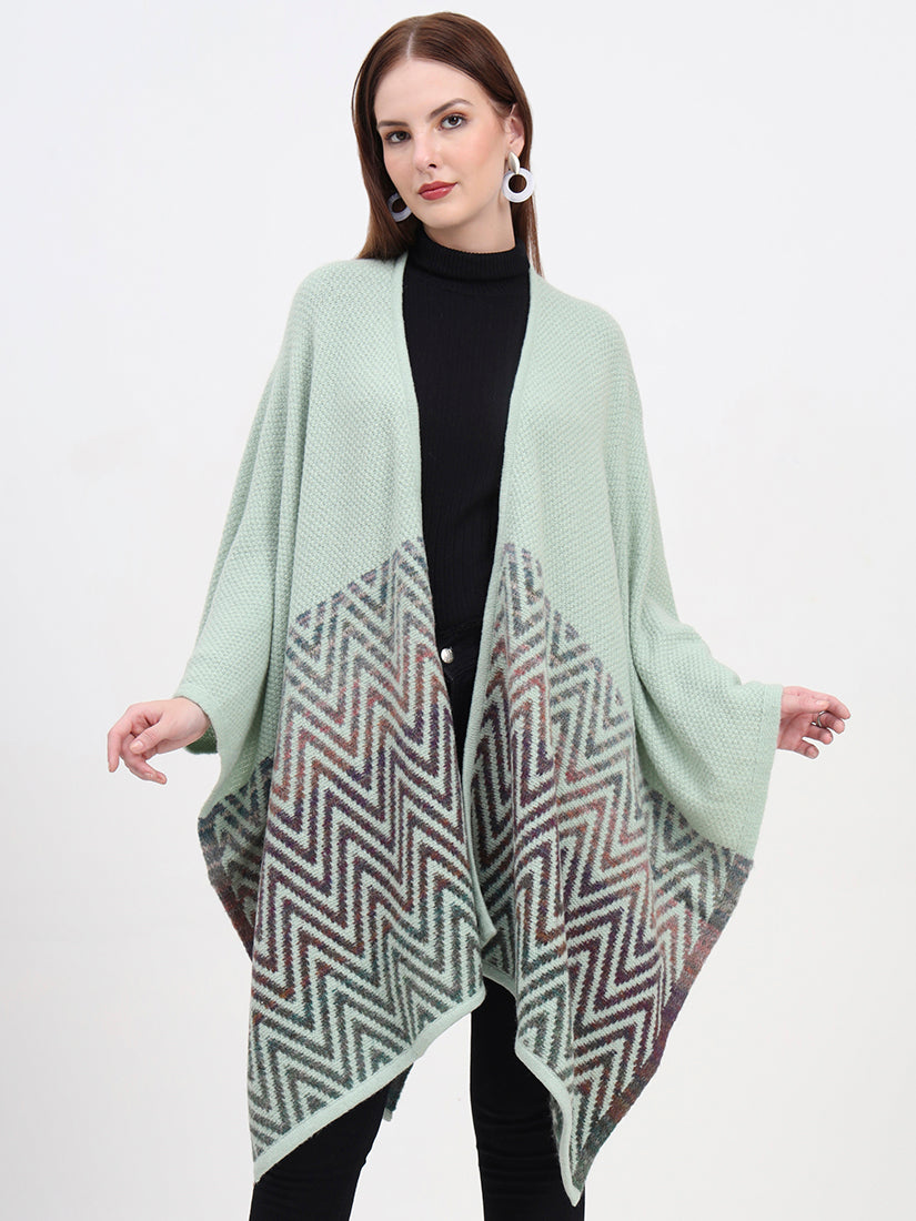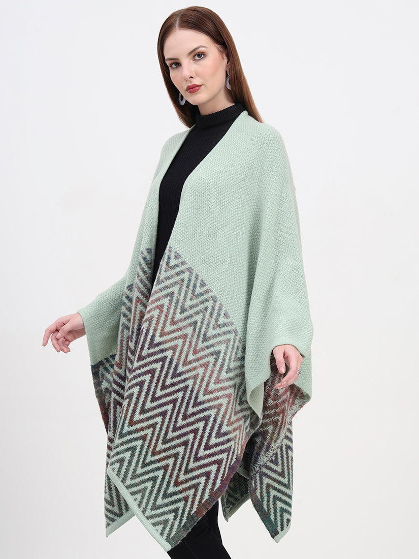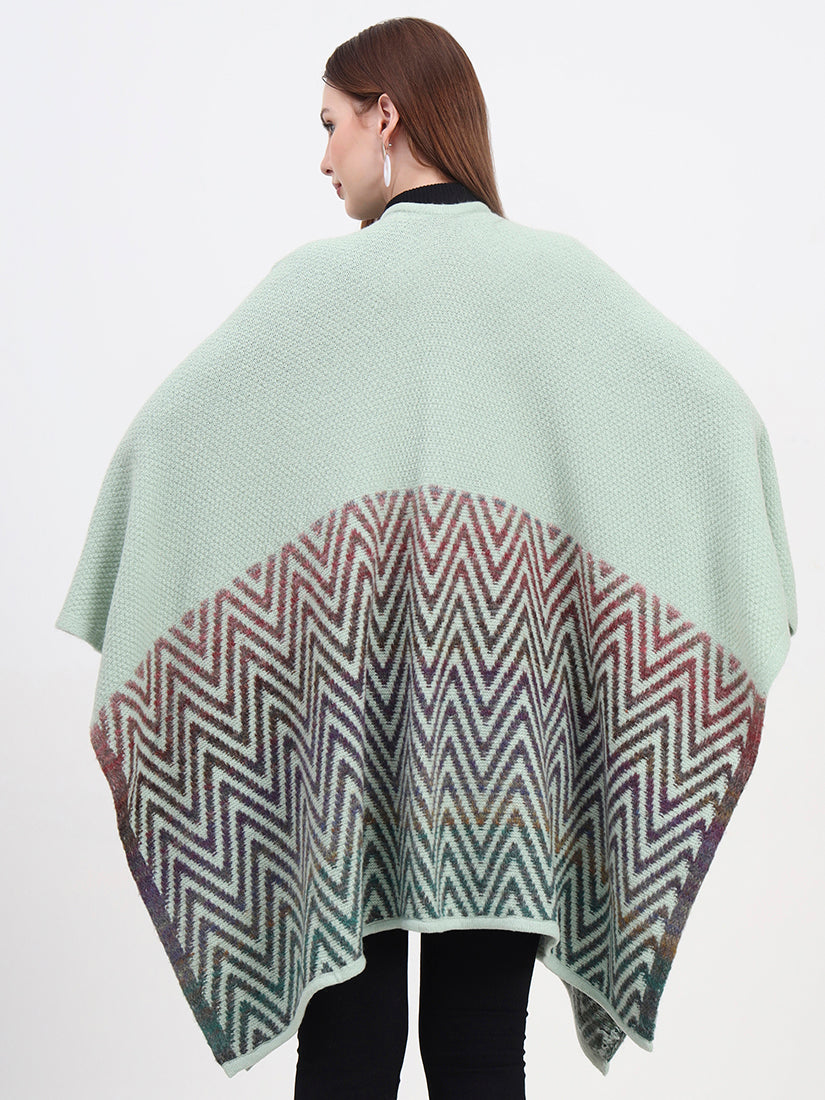 Elevate your wardrobe with the Mint Dawn Chevron Cape. Crafted in luxurious wool blends, its refreshing mint hue flows into intricate multitone chevron patterns, a statement of refined artistry and modern elegance.
