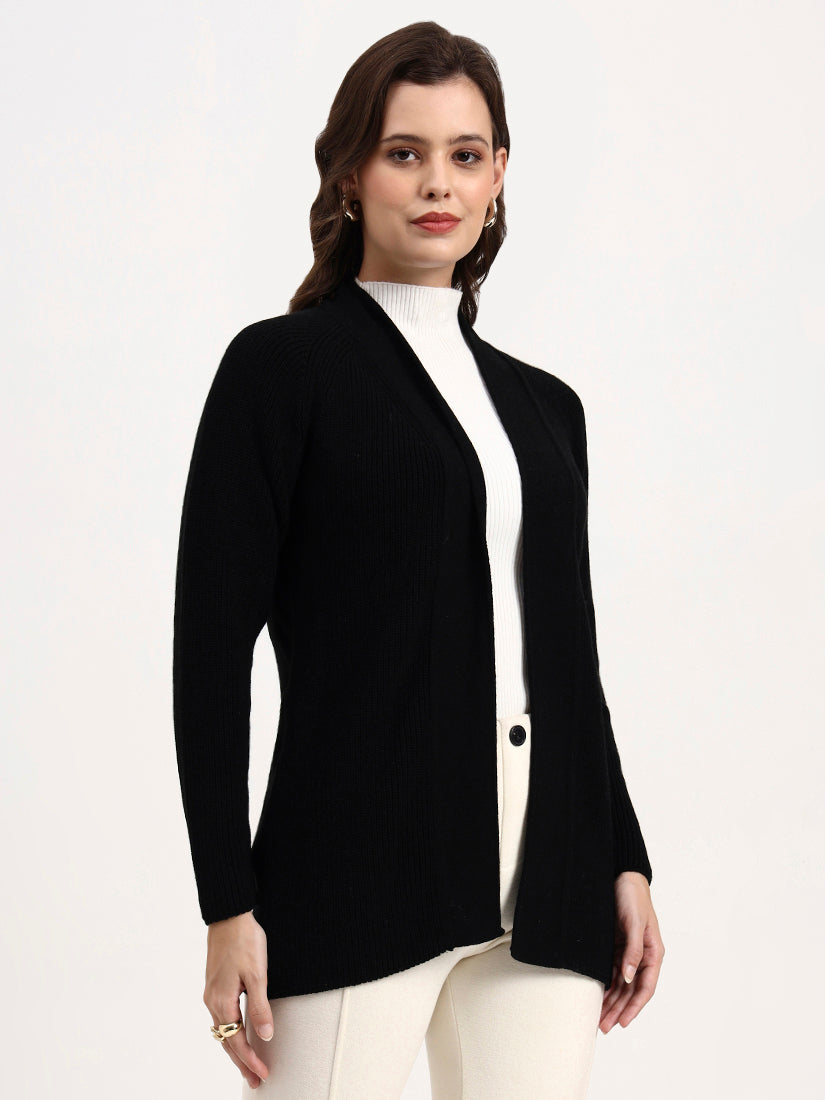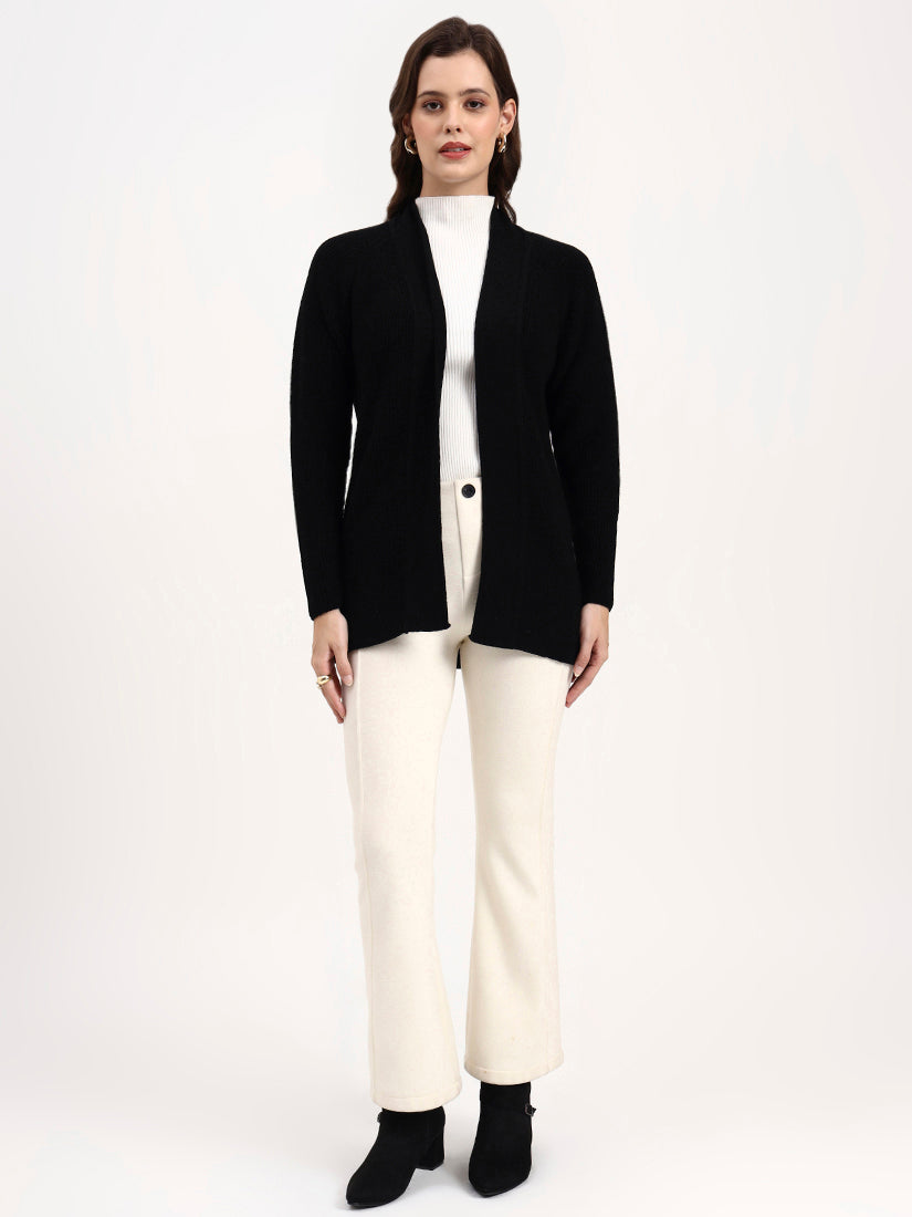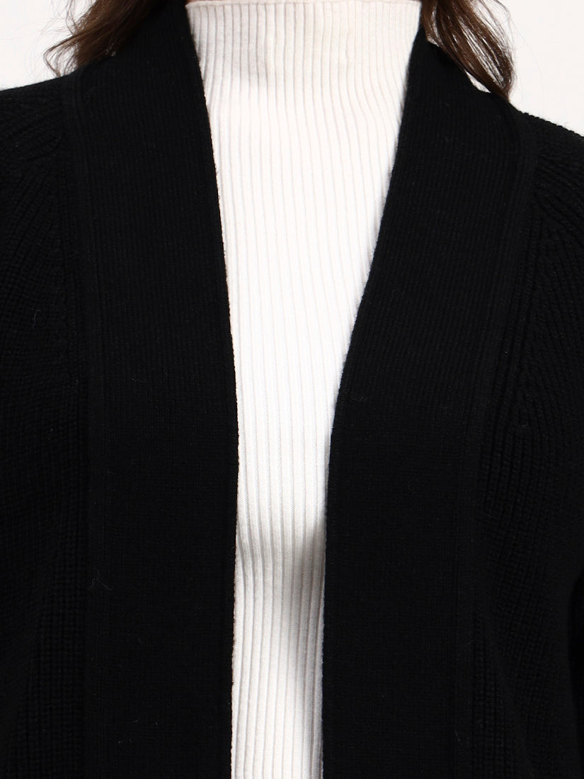 A deep, inky black that drapes effortlessly with fluid lines and subtle ribbed detailing. Timeless and versatile, it anchors both casual denim and polished office looks with understated sophistication.