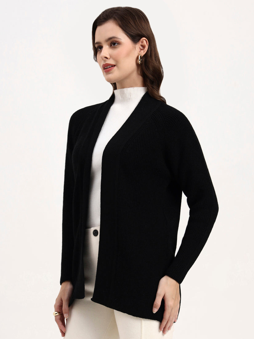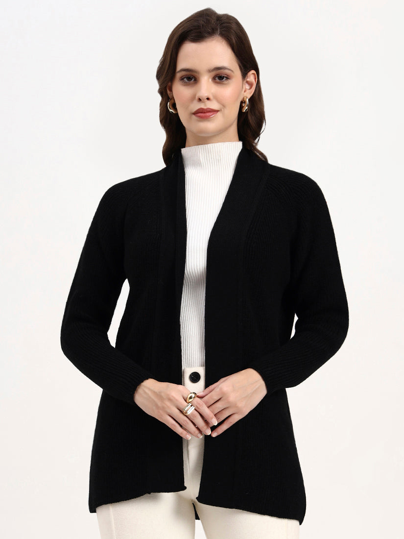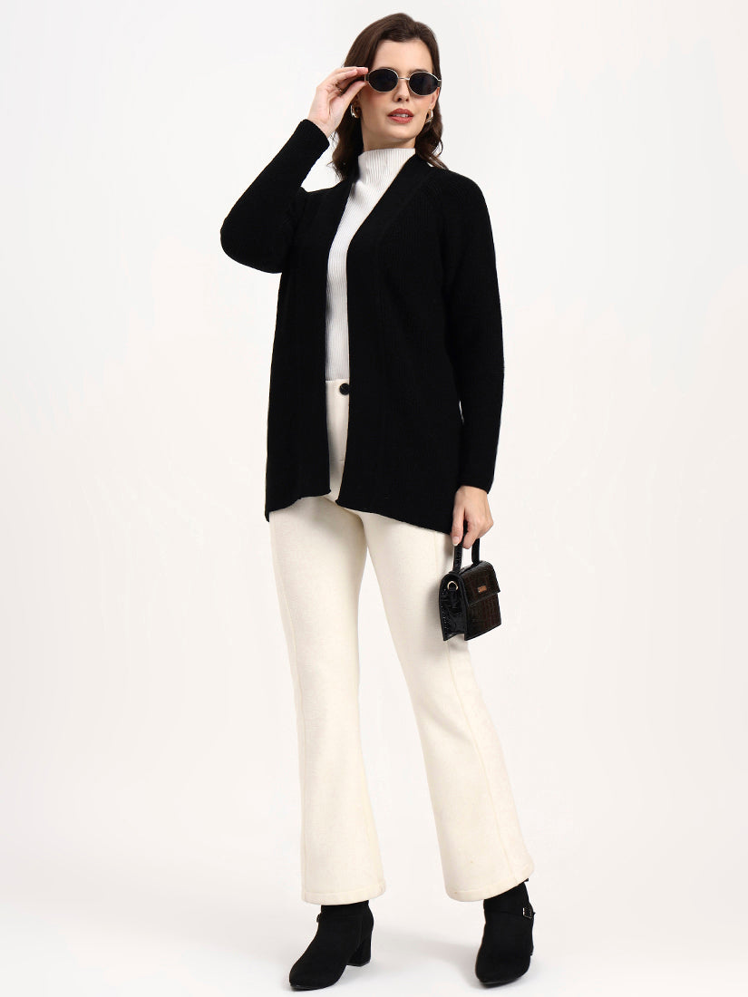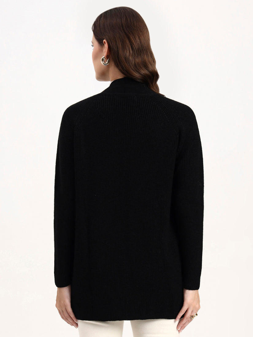 A deep, inky black that drapes effortlessly with fluid lines and subtle ribbed detailing. Timeless and versatile, it anchors both casual denim and polished office looks with understated sophistication.