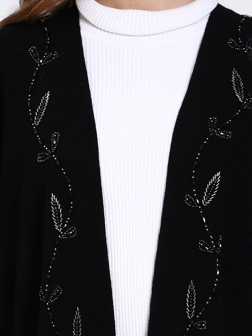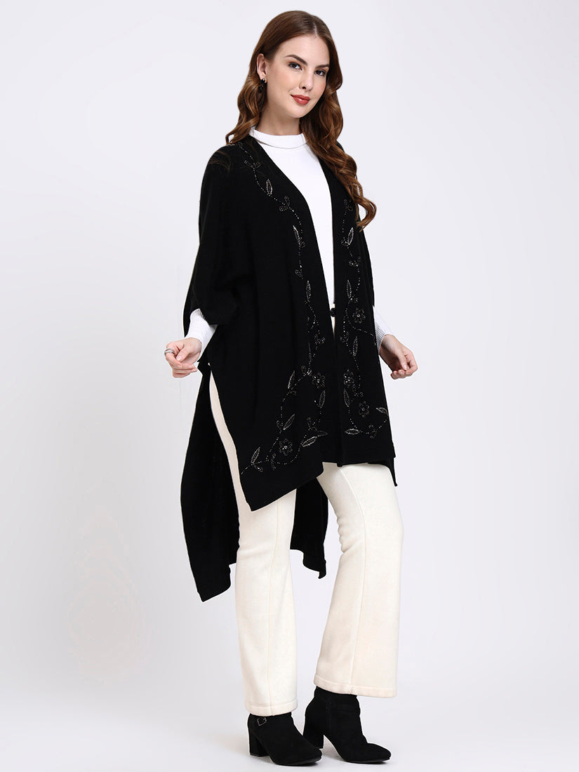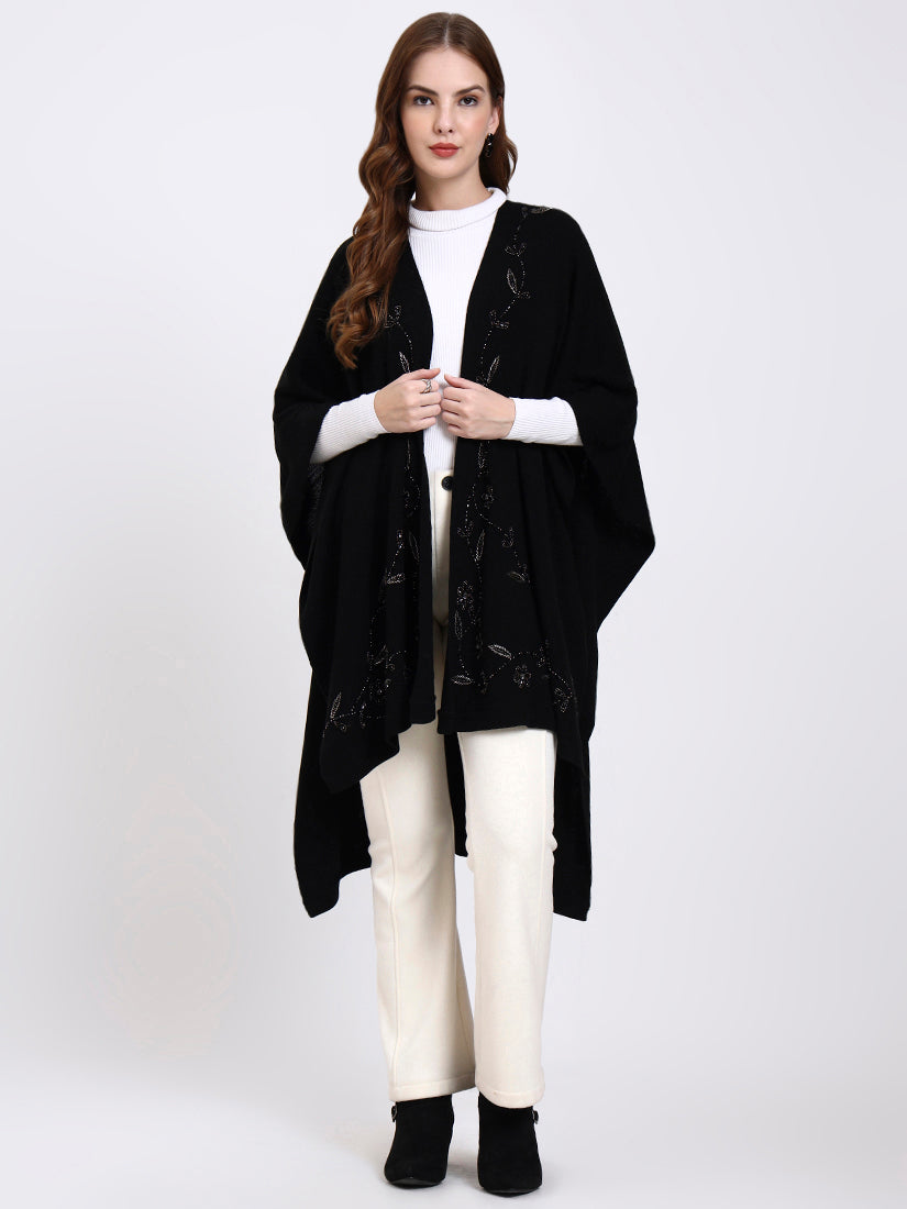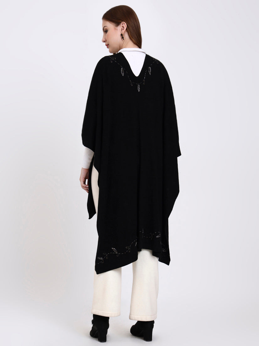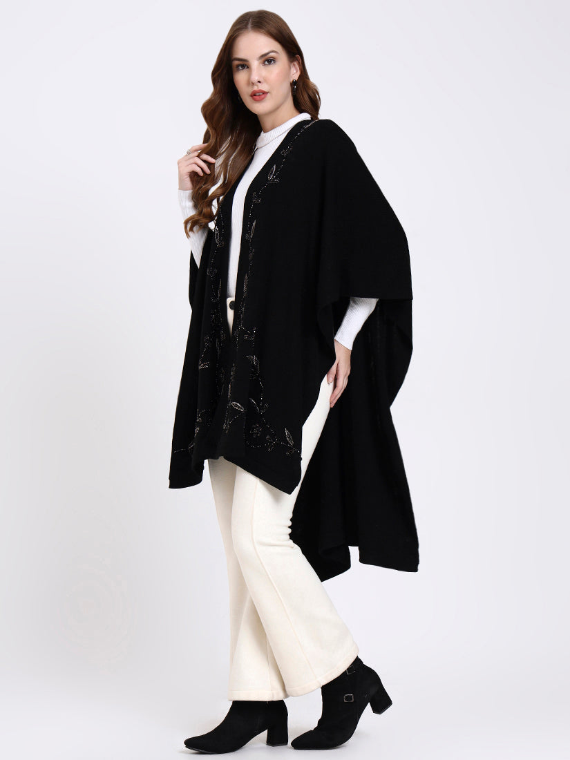 In deep black, this cape is illuminated by its refined leaf embroidery, lending an almost celestial shimmer. A versatile yet striking piece, it gracefully shifts from formal eveningwear to understated day luxury.
