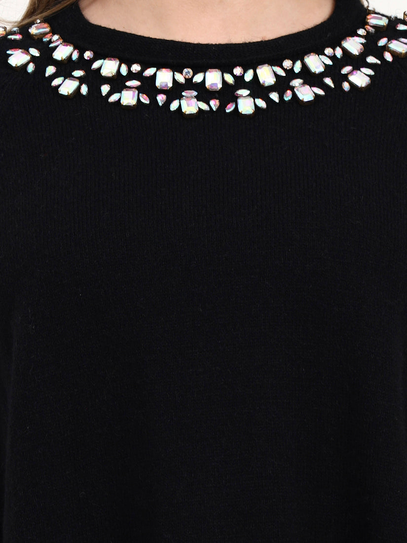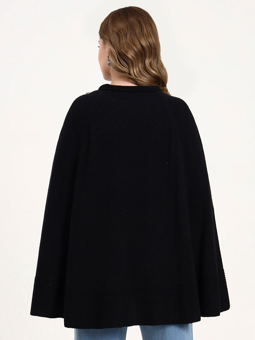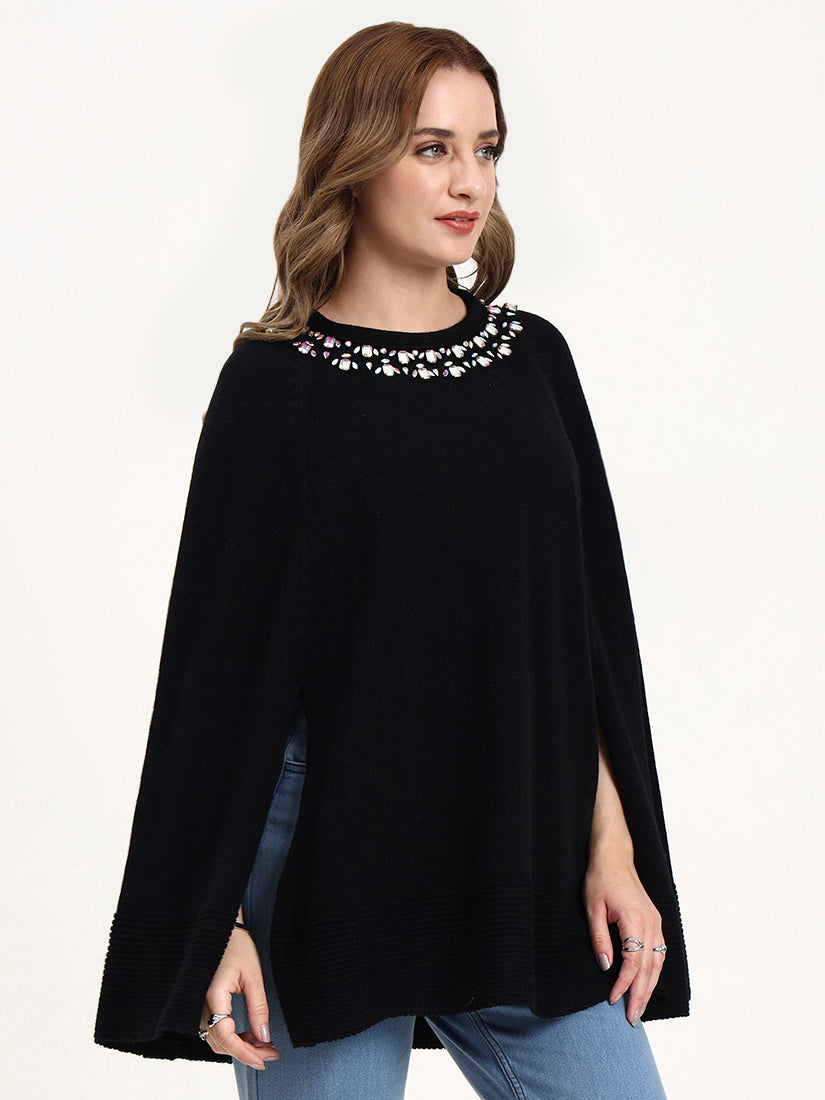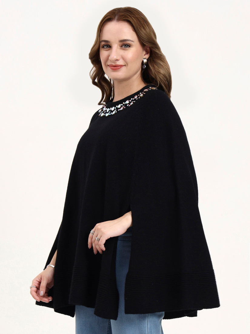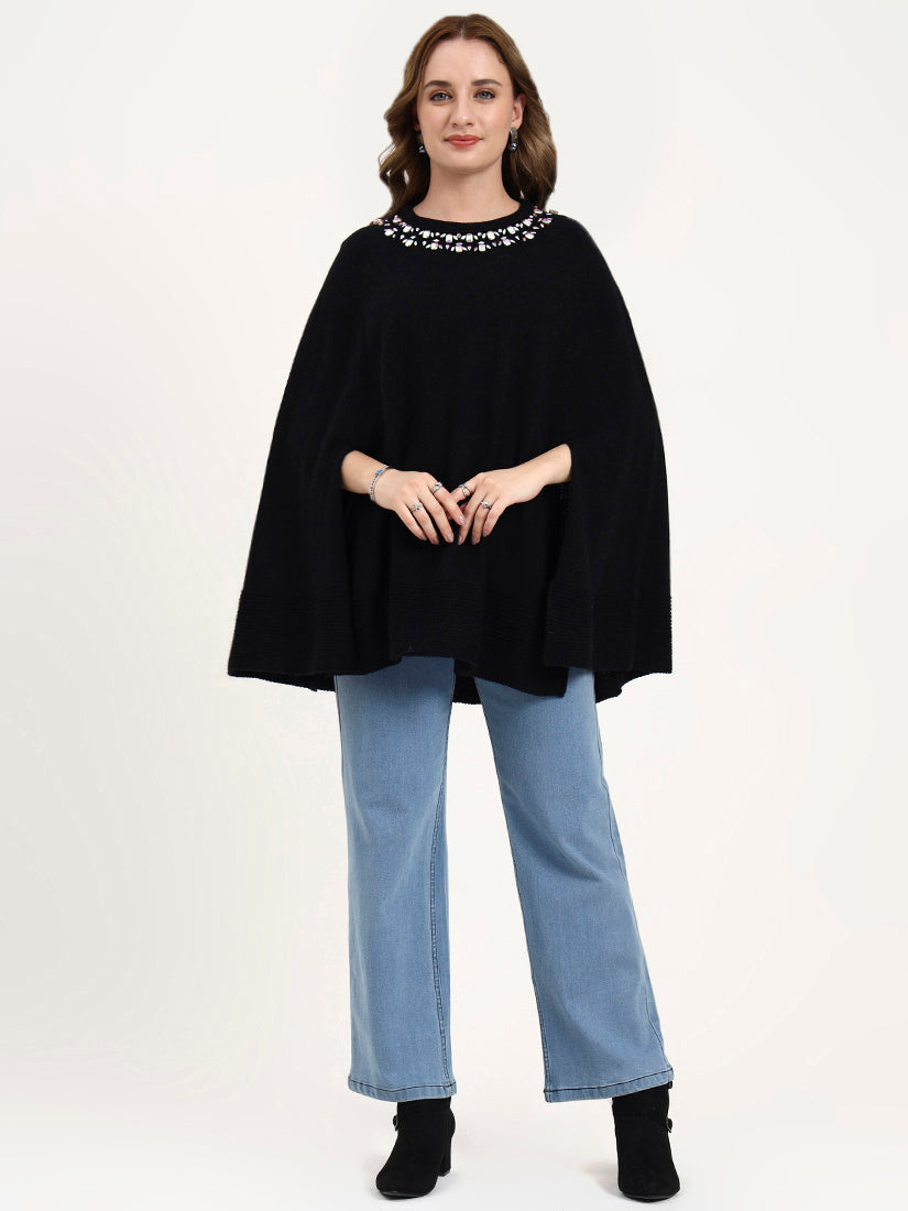 A deep black poncho elevated with jewel-like embroidery at the neckline, exuding modern evening elegance. The embellishment adds a subtle radiance, making it a refined companion for soirées and elevated city dressing.