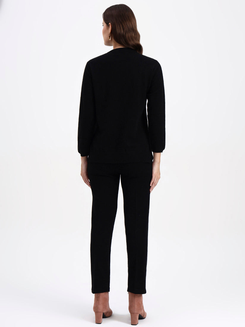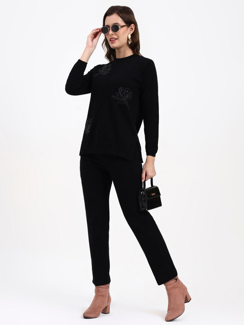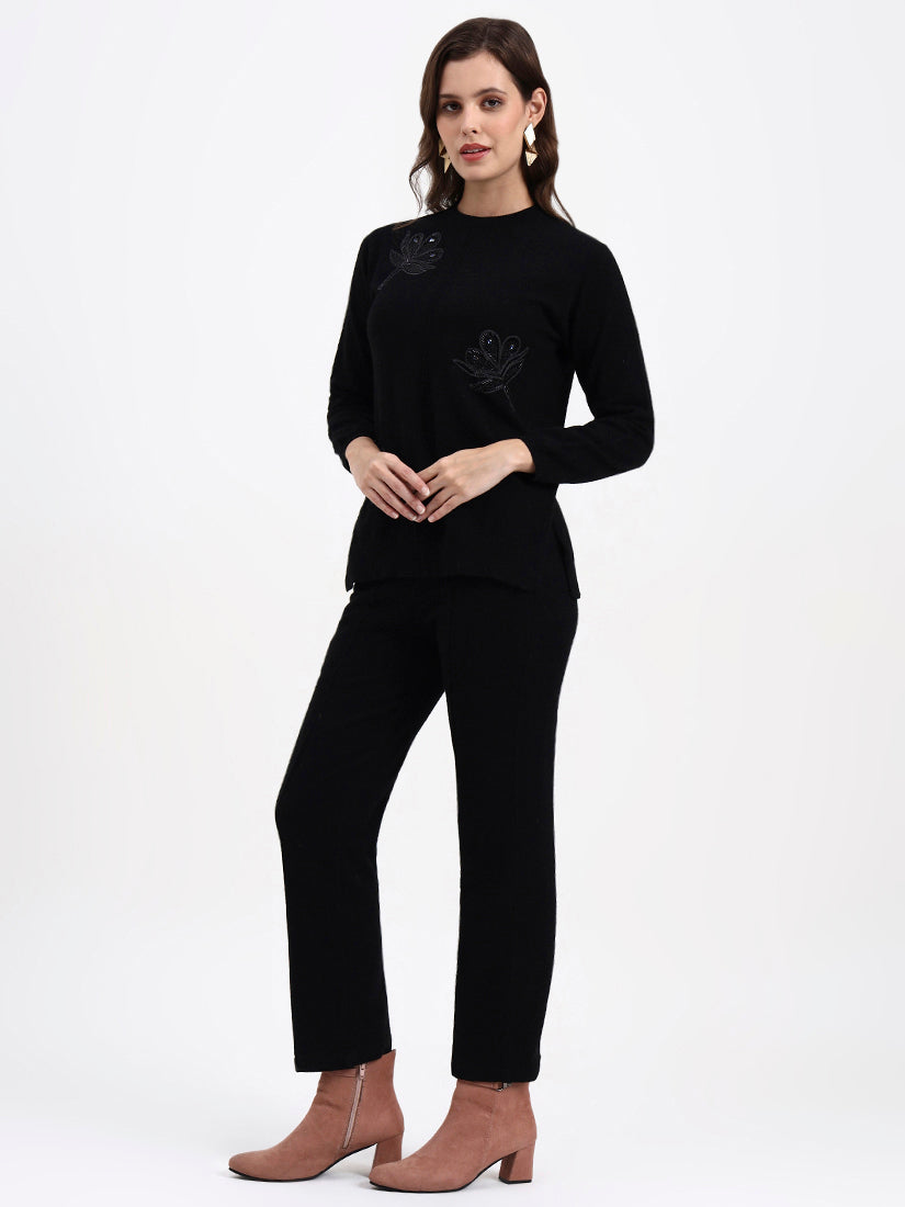 Shadowy sophistication meets feminine subtlety in this refined black ensemble. The delicate floral accents are quietly embroidered for an elegant tone-on-tone effect that adds depth without distraction. Designed for polished winter dressing, it moves effortlessly from refined lounge to discreet luxury travel.