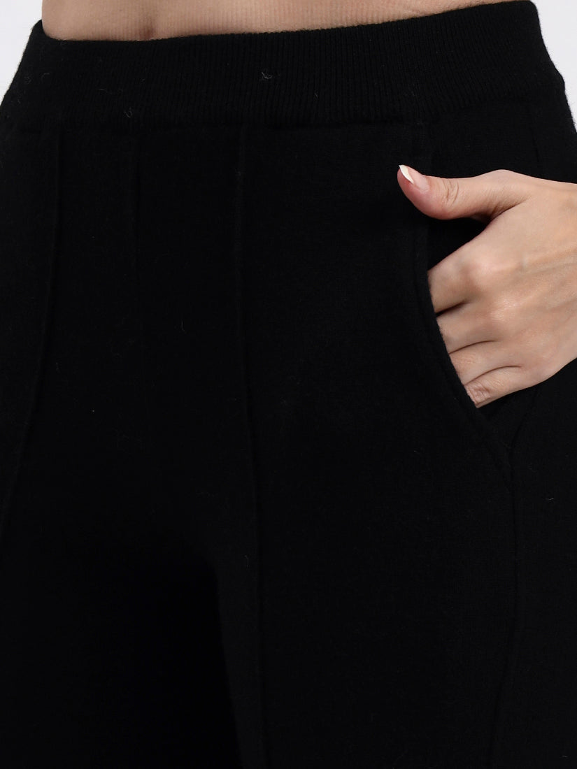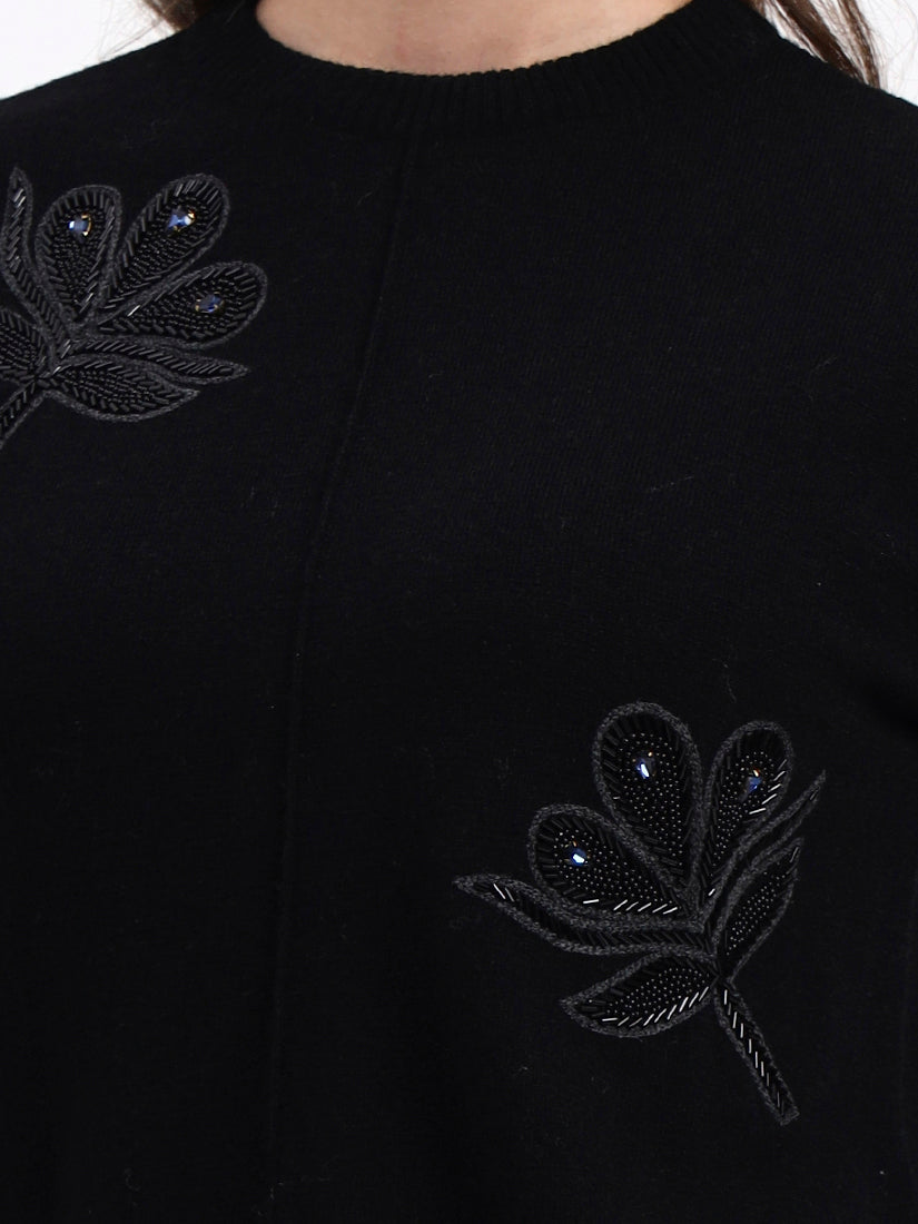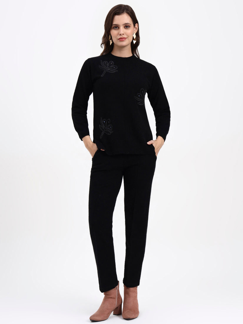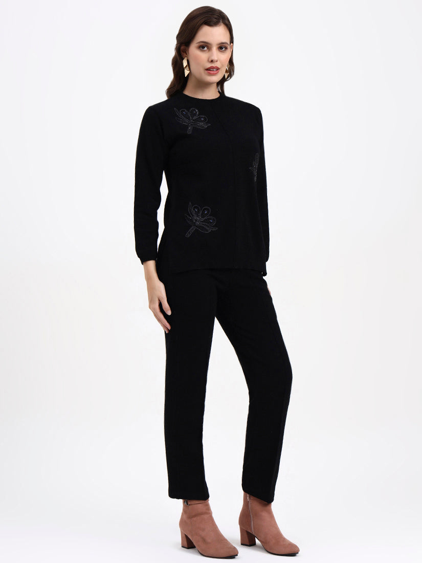 Shadowy sophistication meets feminine subtlety in this refined black ensemble. The delicate floral accents are quietly embroidered for an elegant tone-on-tone effect that adds depth without distraction. Designed for polished winter dressing, it moves effortlessly from refined lounge to discreet luxury travel.