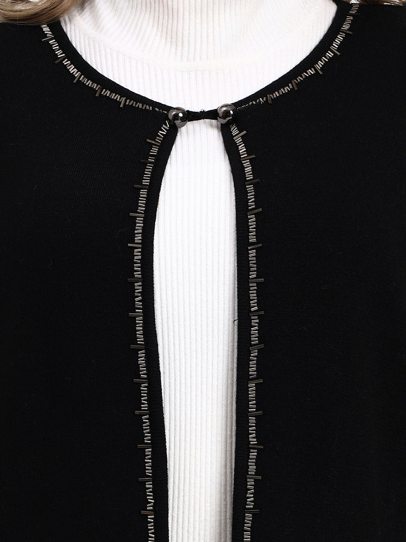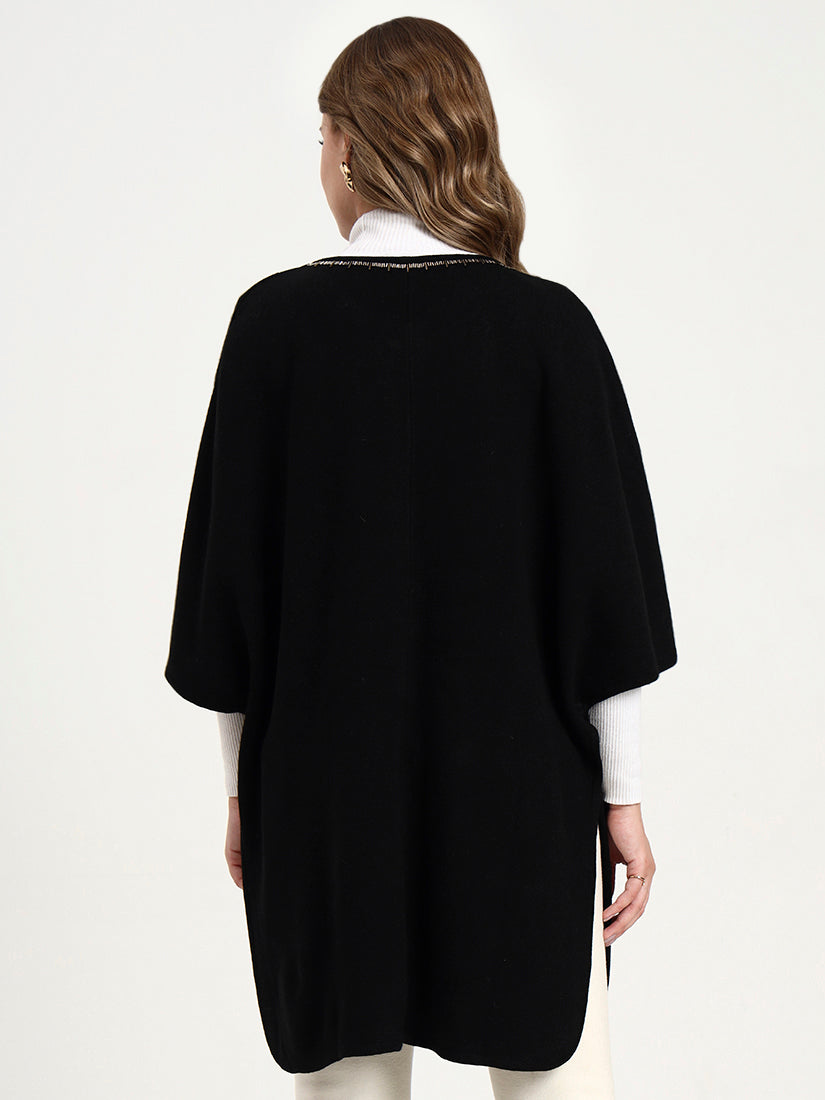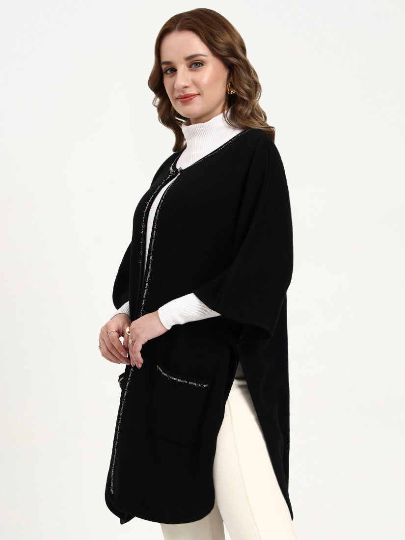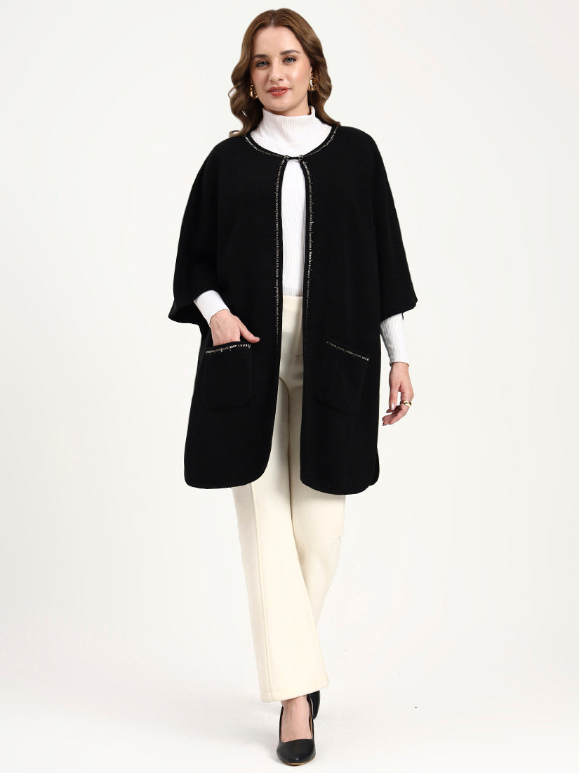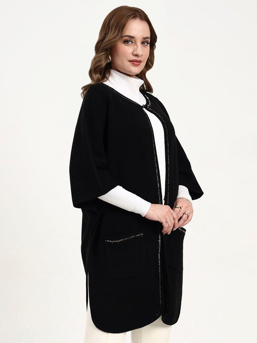 The Noir Crest Cape in deep black is enhanced with subtle, shimmering borders that frame its elegant drape. Discreet pocket details are finished with a refined touch, making it a timeless layer that exudes understated luxury.