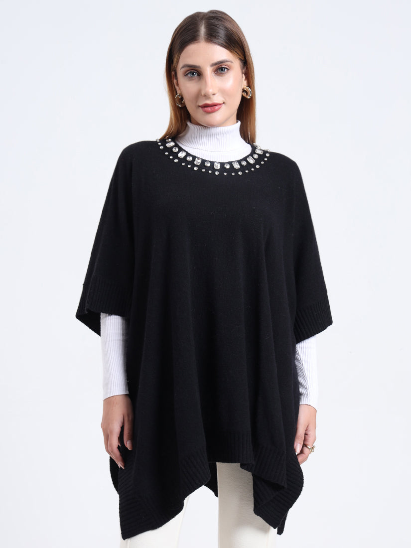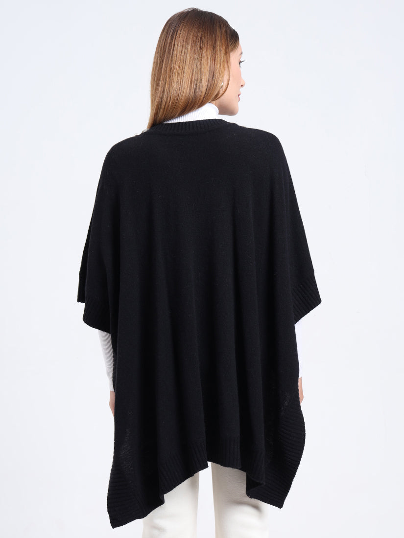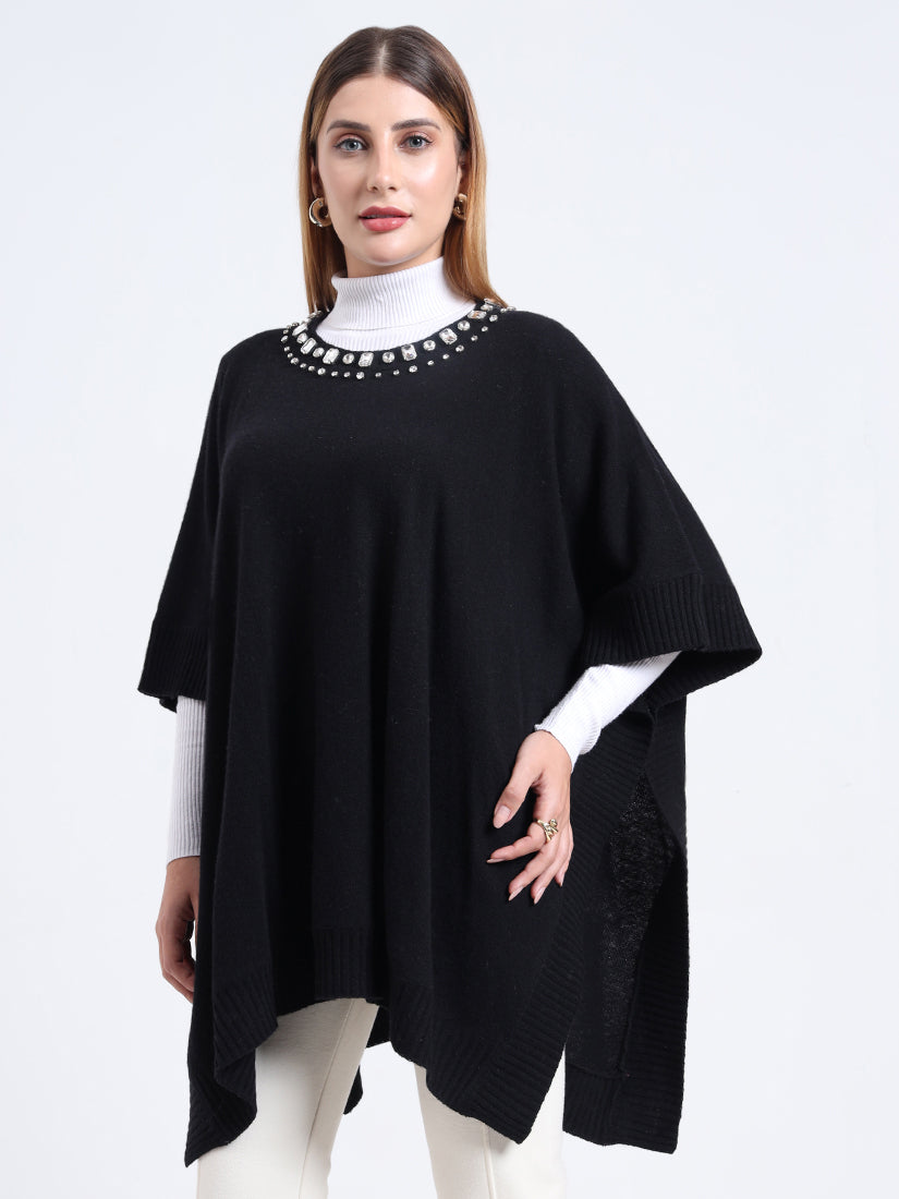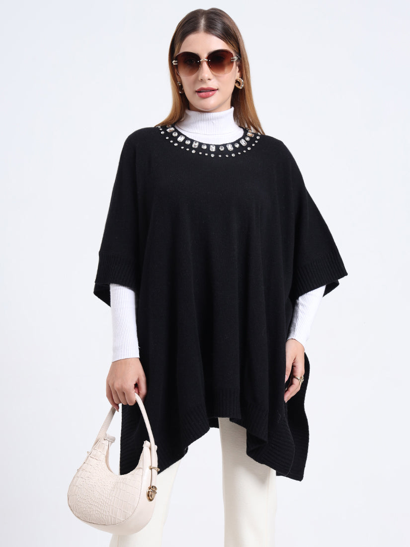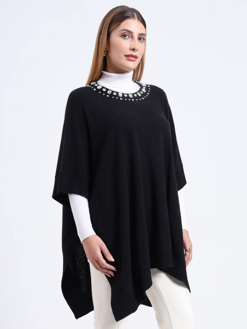 With subtle embellishment at the neckline, the Noir Éclat Poncho in soft wool blends delivers contemporary elegance, making black feel both classic and radiant.
