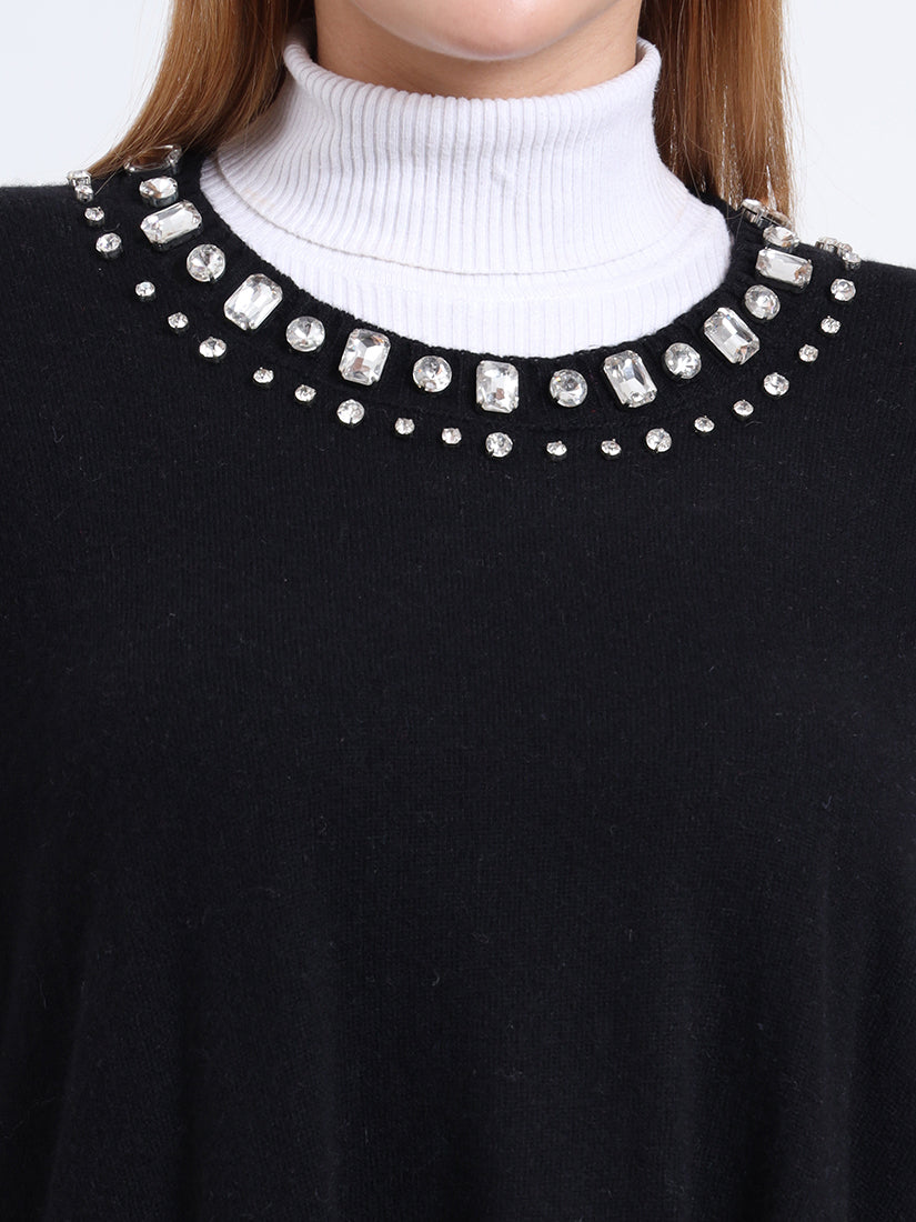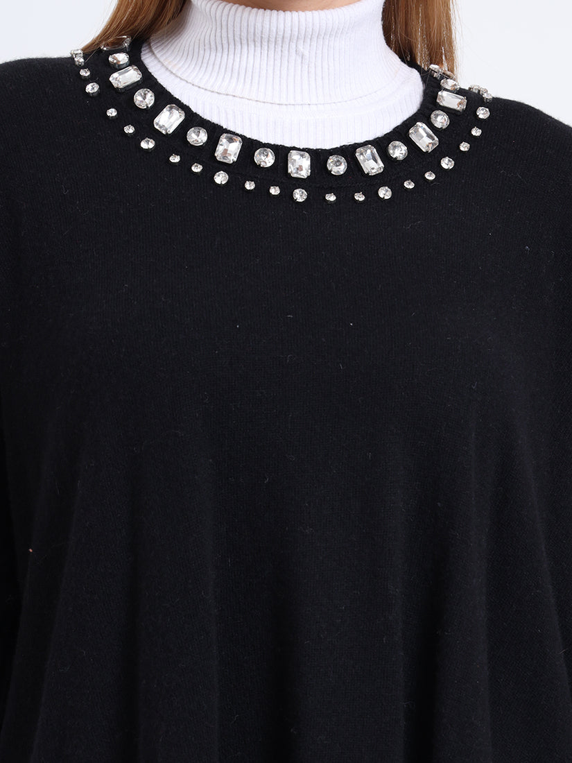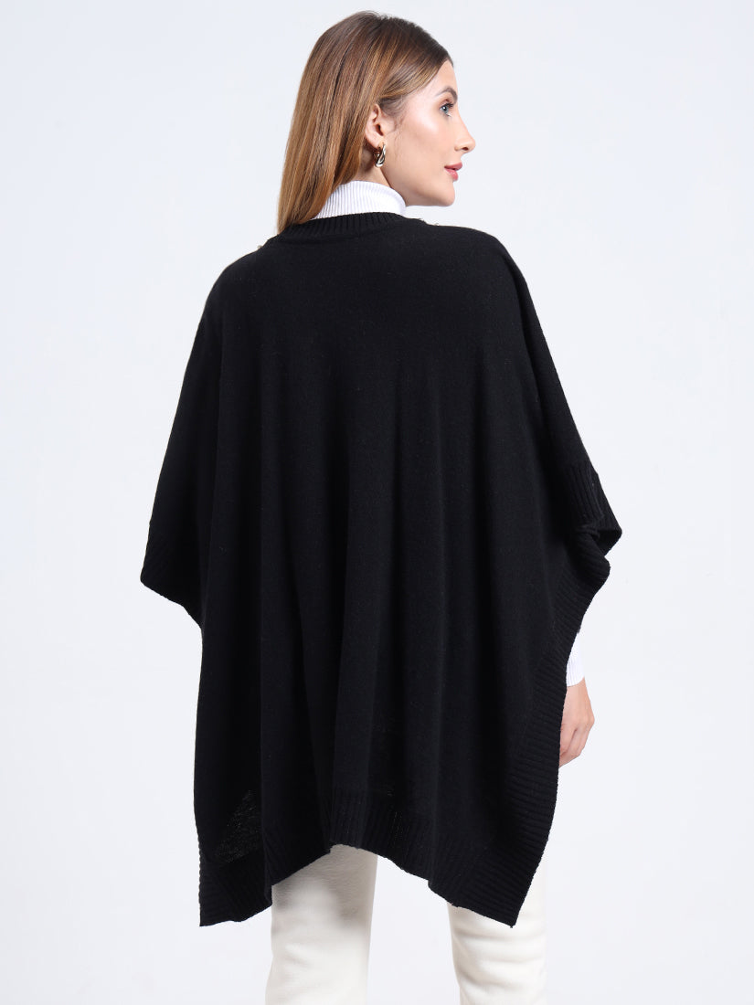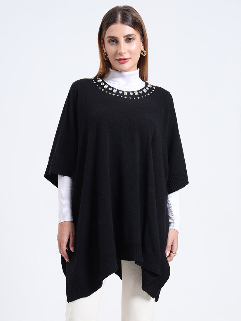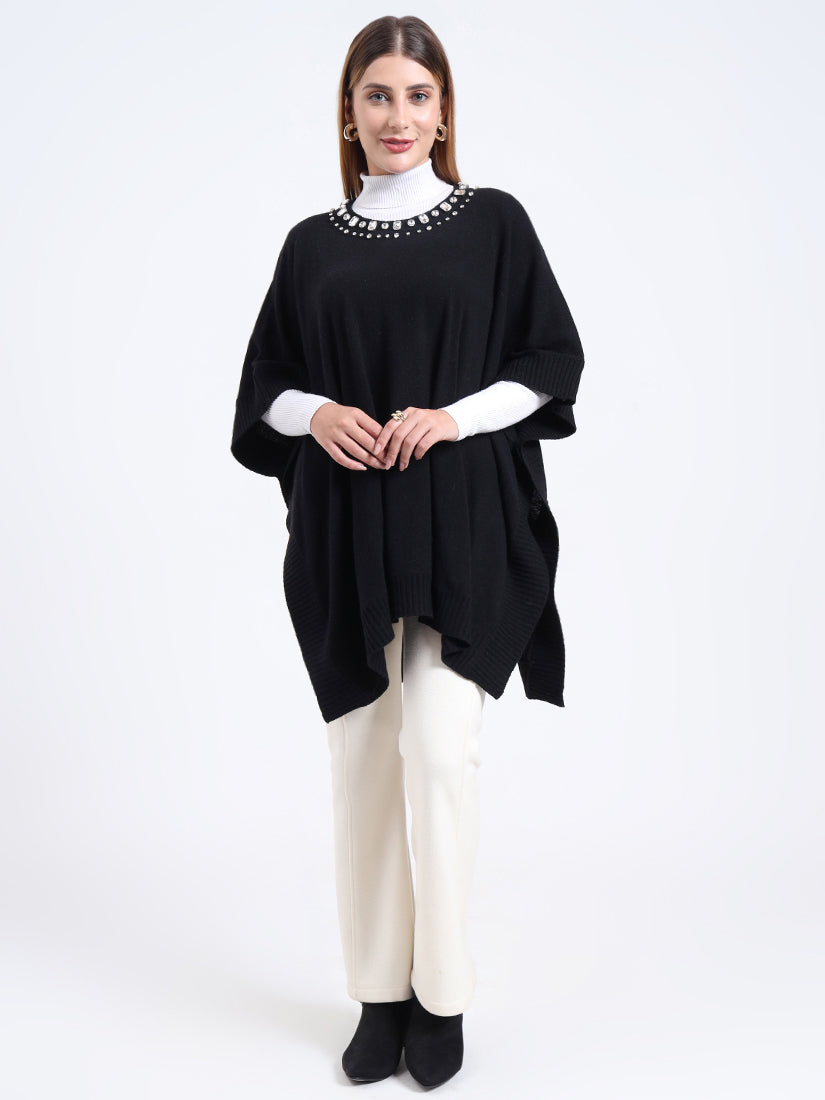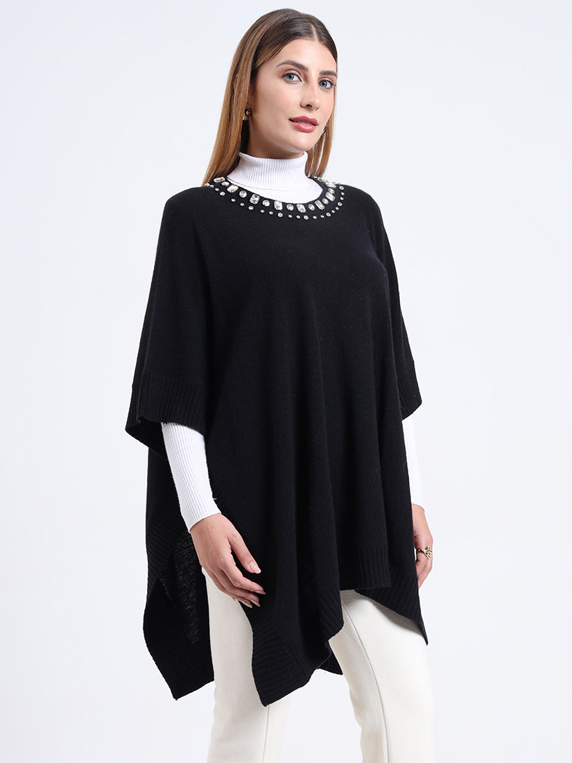 With subtle embellishment at the neckline, the Noir Éclat Poncho in soft wool blends delivers contemporary elegance, making black feel both classic and radiant.