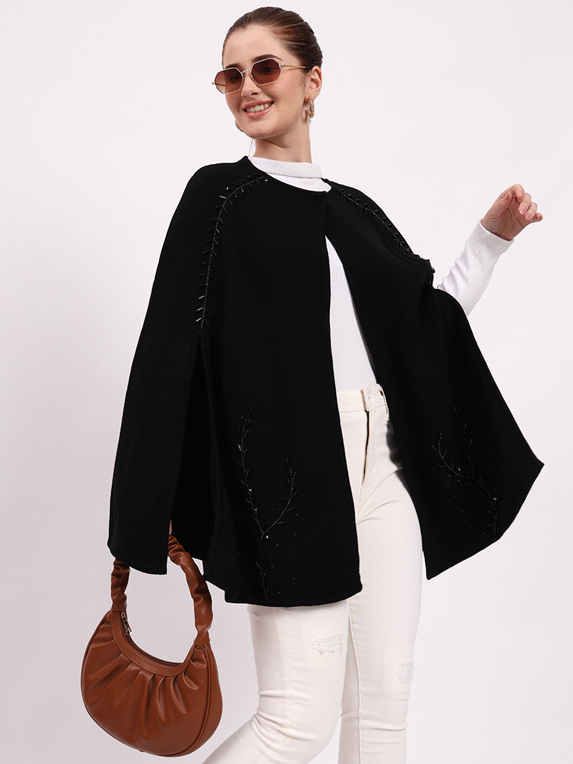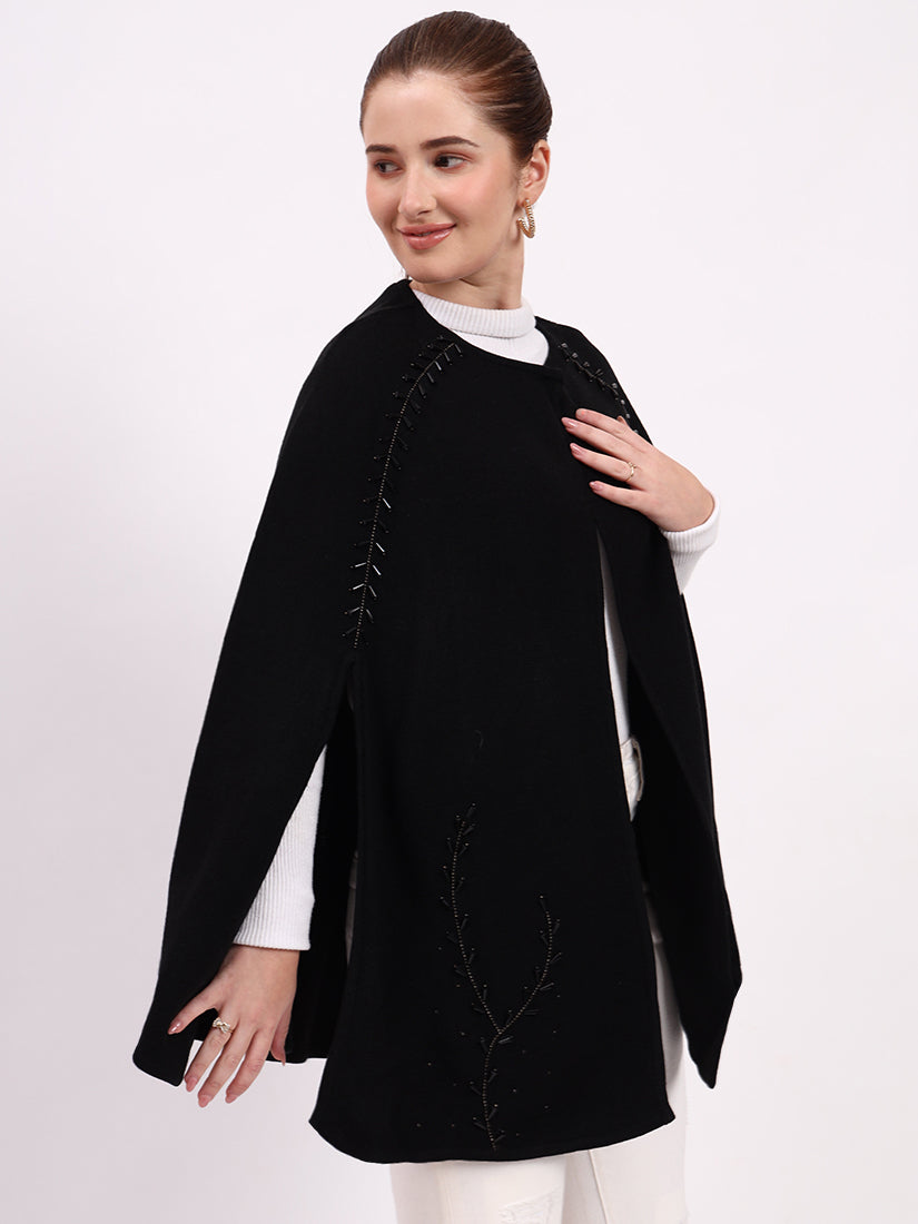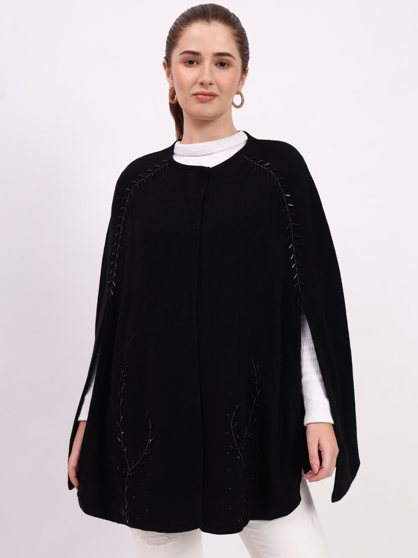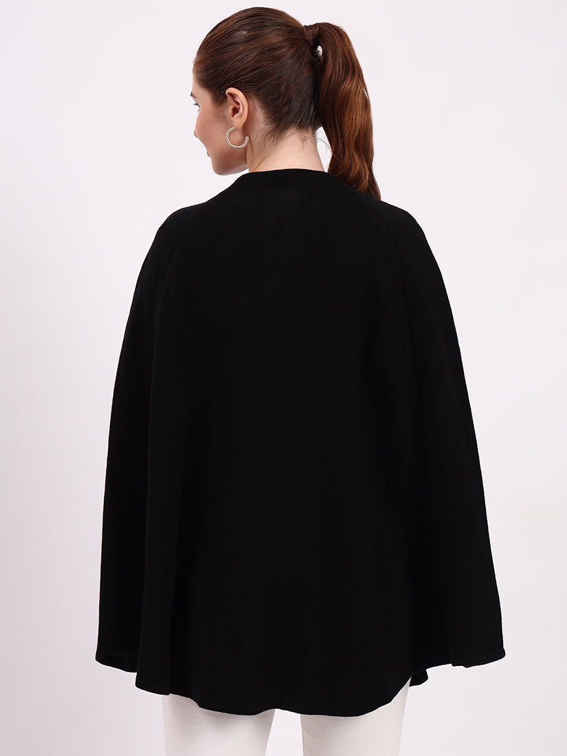 The Noir Élan Poncho, crafted in soft wool blends, embodies understated elegance. Its sleek black silhouette is elevated with delicate stitch detailing, making it a timeless wardrobe essential.