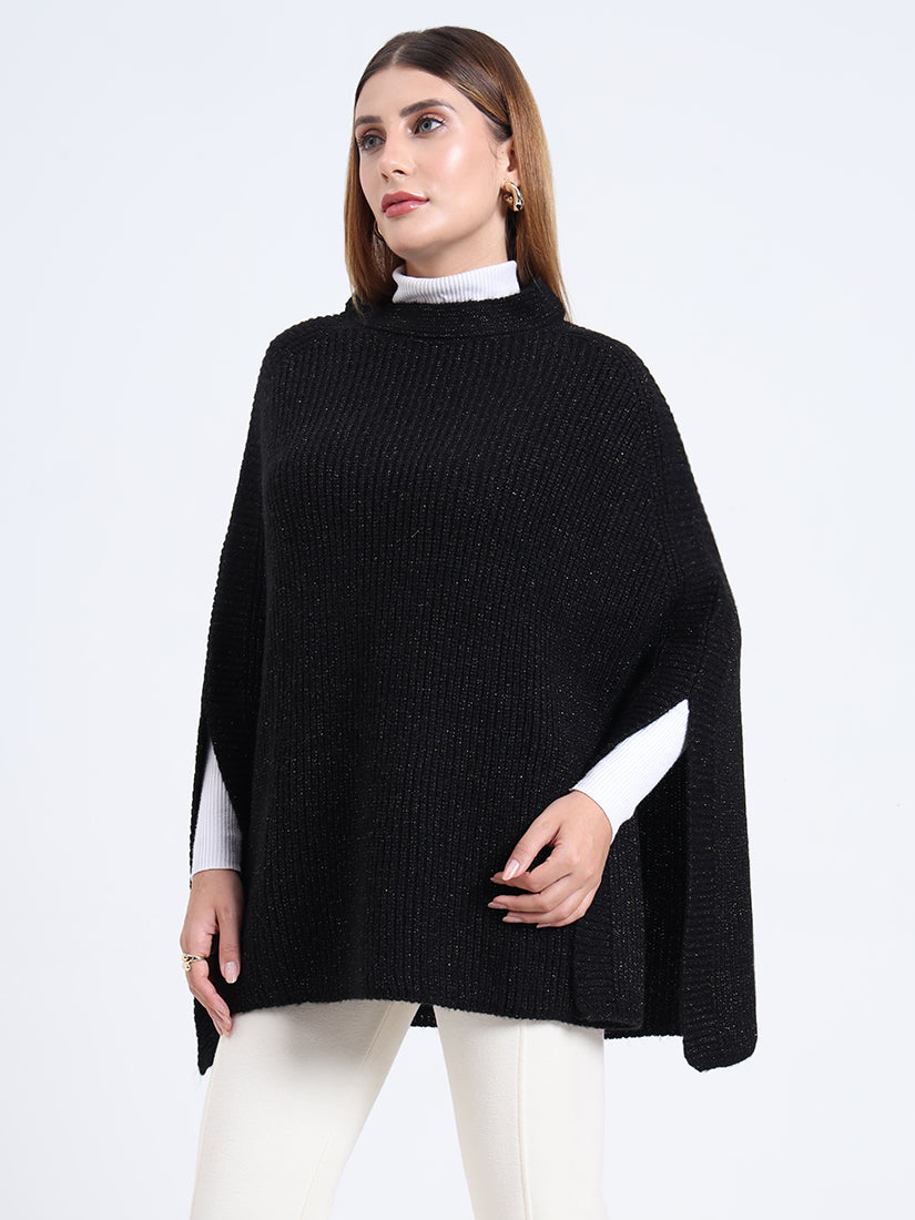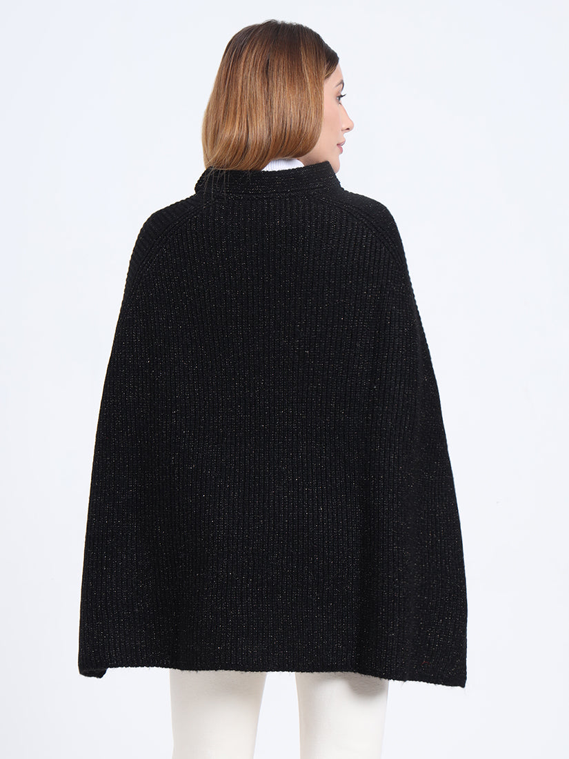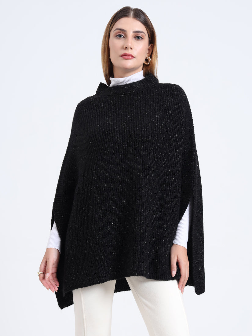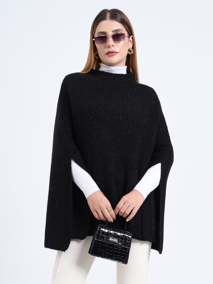 A timeless black cape touched with restrained shimmer. An elegant layer that whispers luxury, designed for both power and poise.
