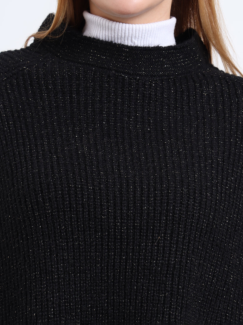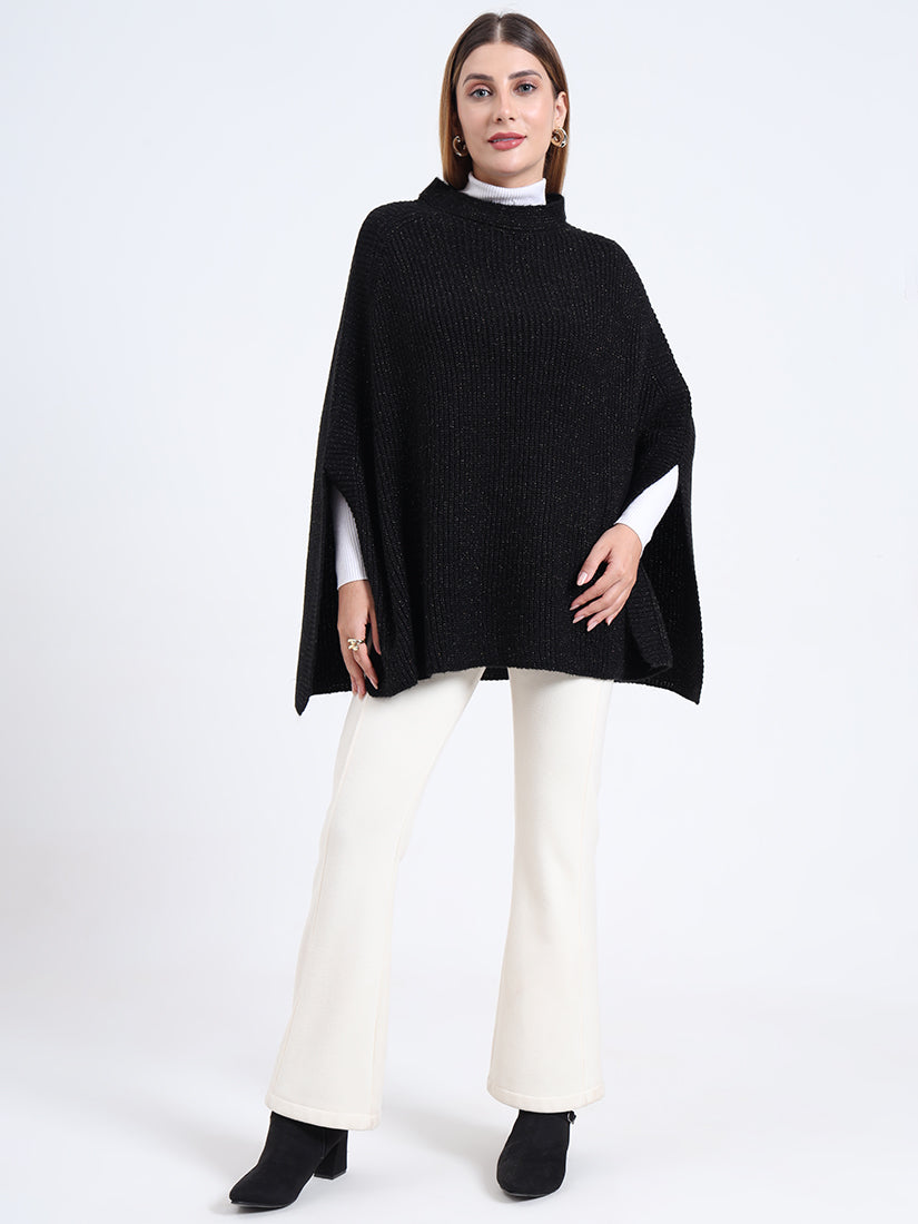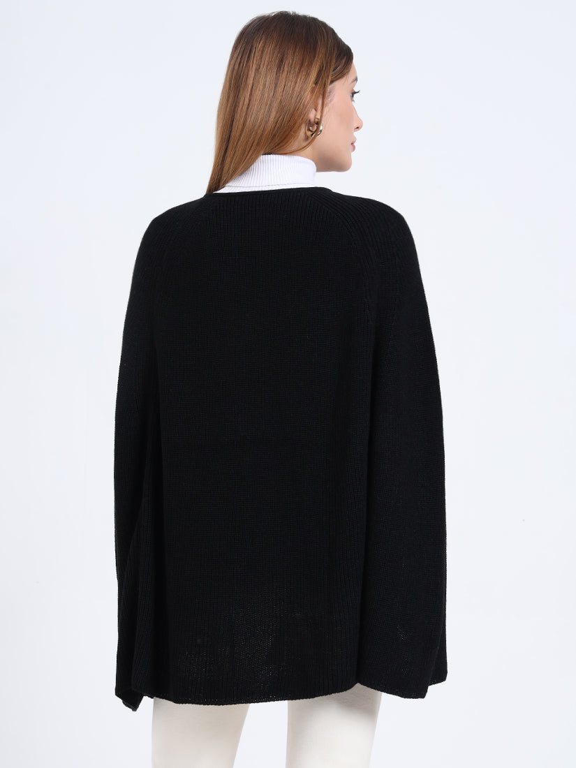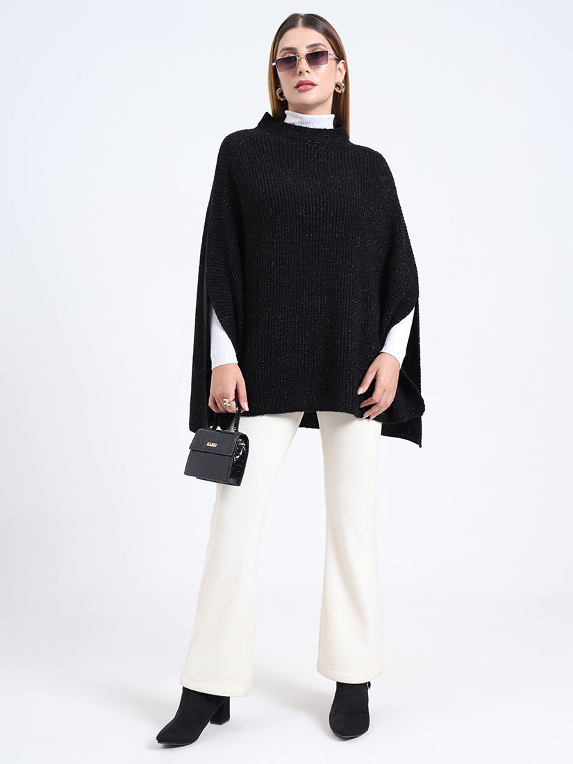 A timeless black cape touched with restrained shimmer. An elegant layer that whispers luxury, designed for both power and poise.