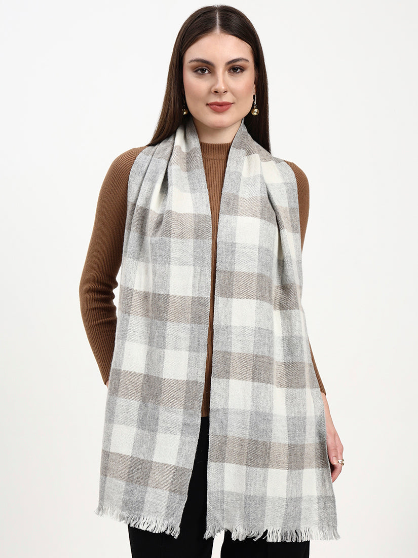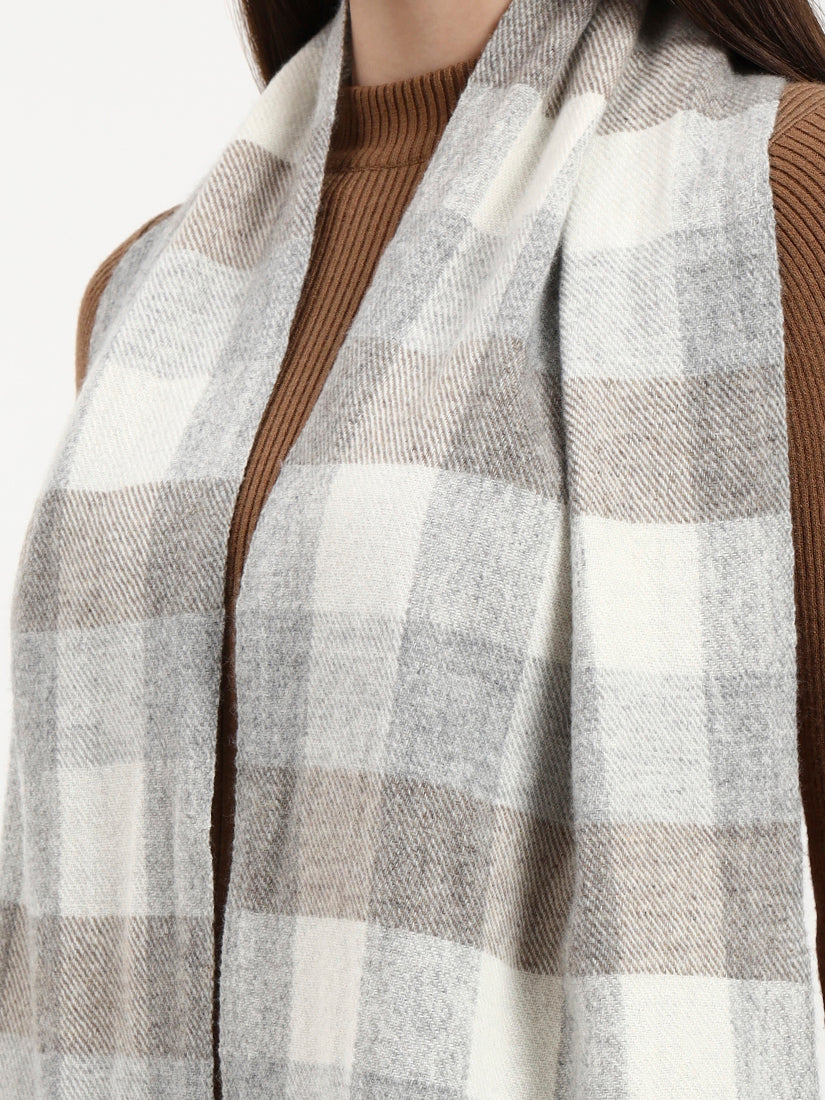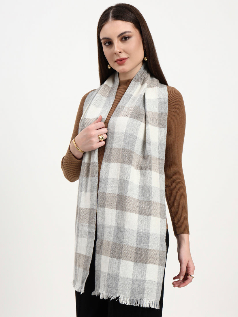 Soft and subtle, this beige and grey check scarf captures refined simplicity through its tonal palette and airy texture. Designed for modern layering, it adds quiet sophistication and warmth to every winter look.