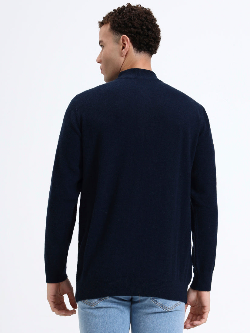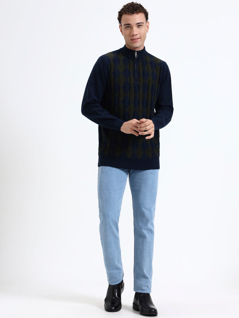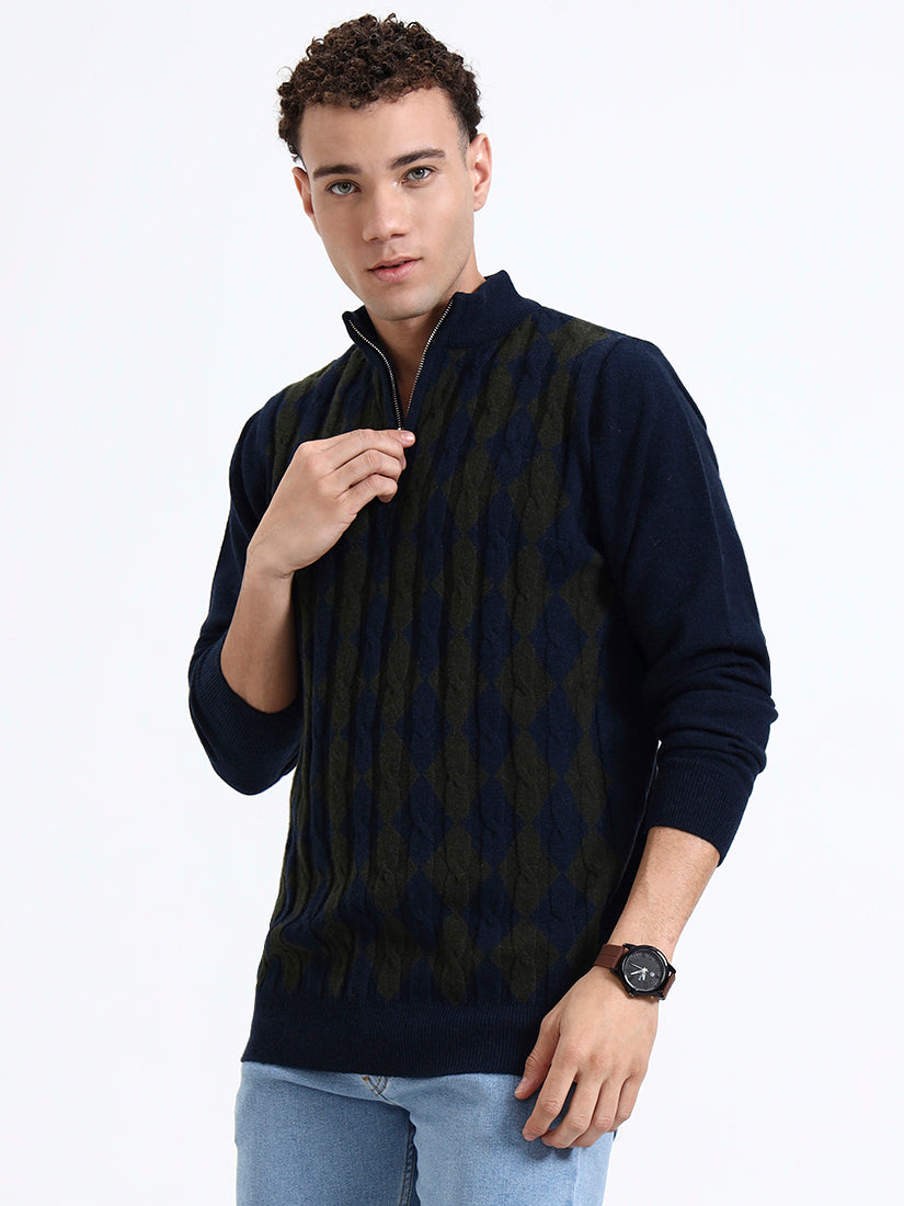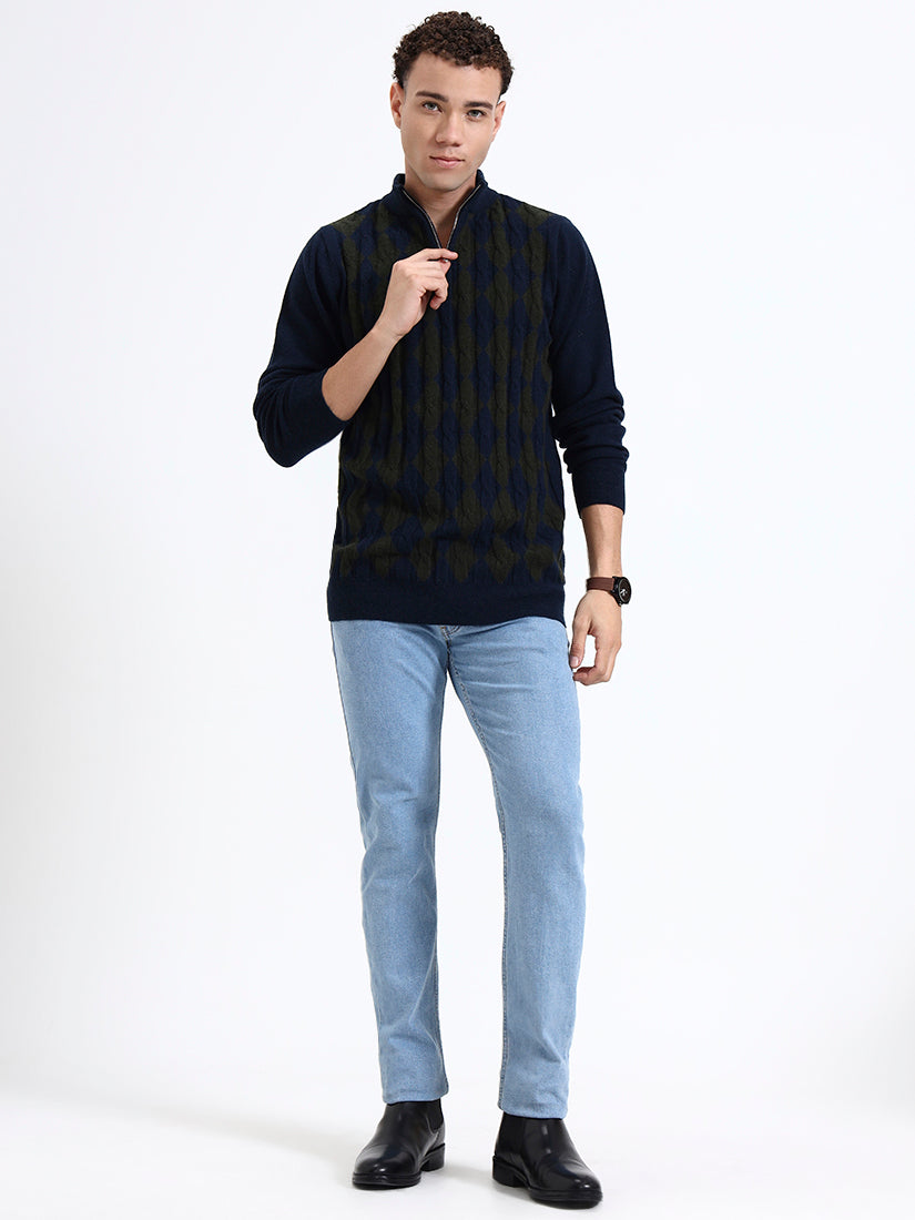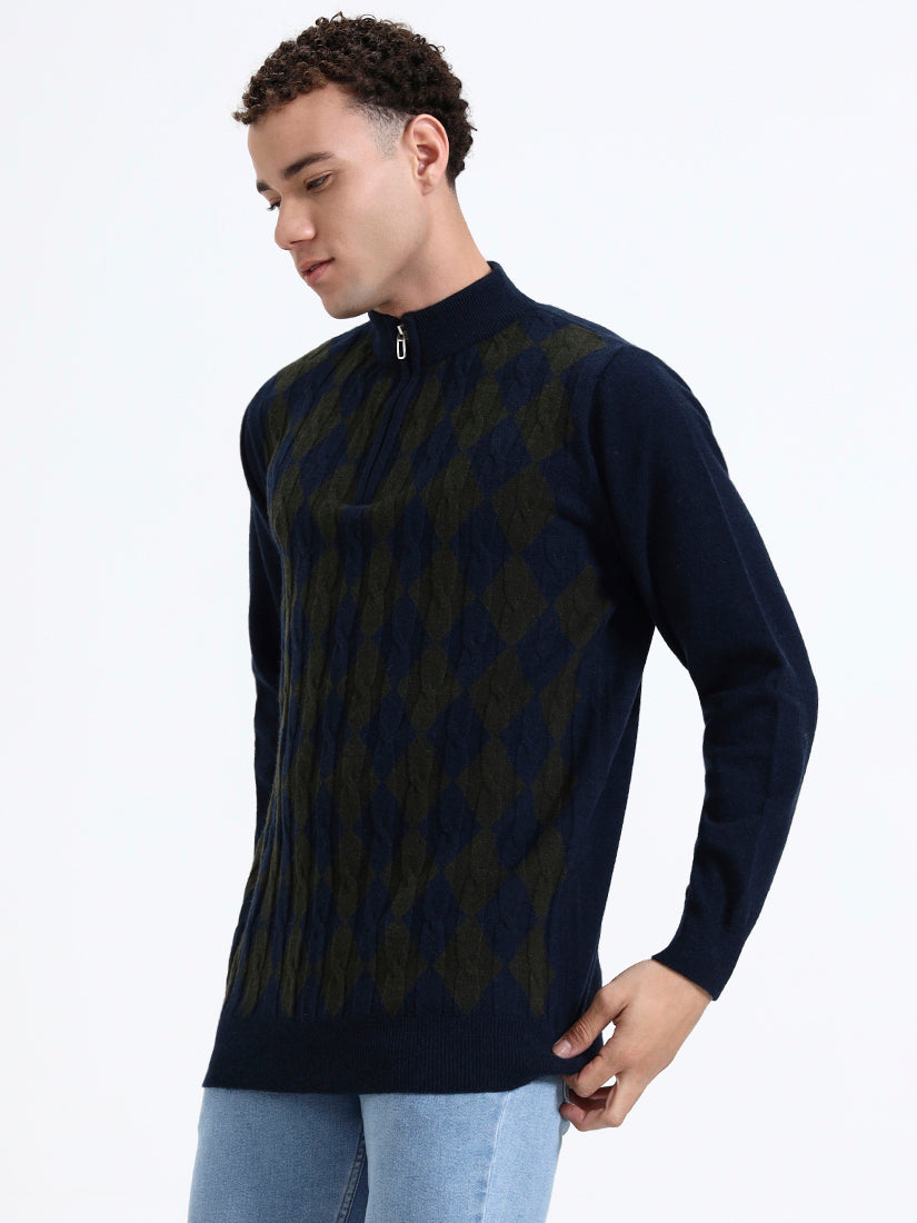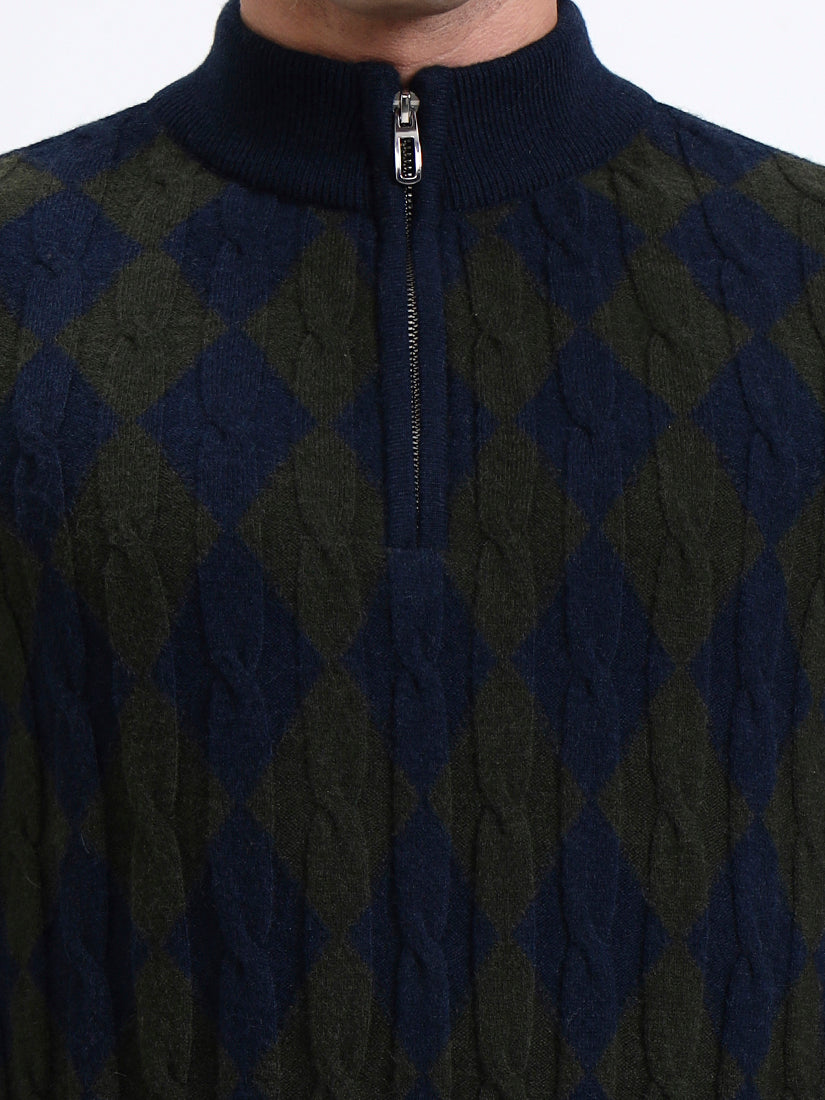 A refined nod to Scottish tradition, this quarter-zip pullover features a navy and olive Argyle pattern in a soft wool blend. It offers warmth and understated sophistication, with a sleek mock neck and zip detail, ideal for smart or casual layering.