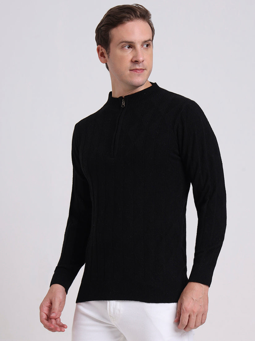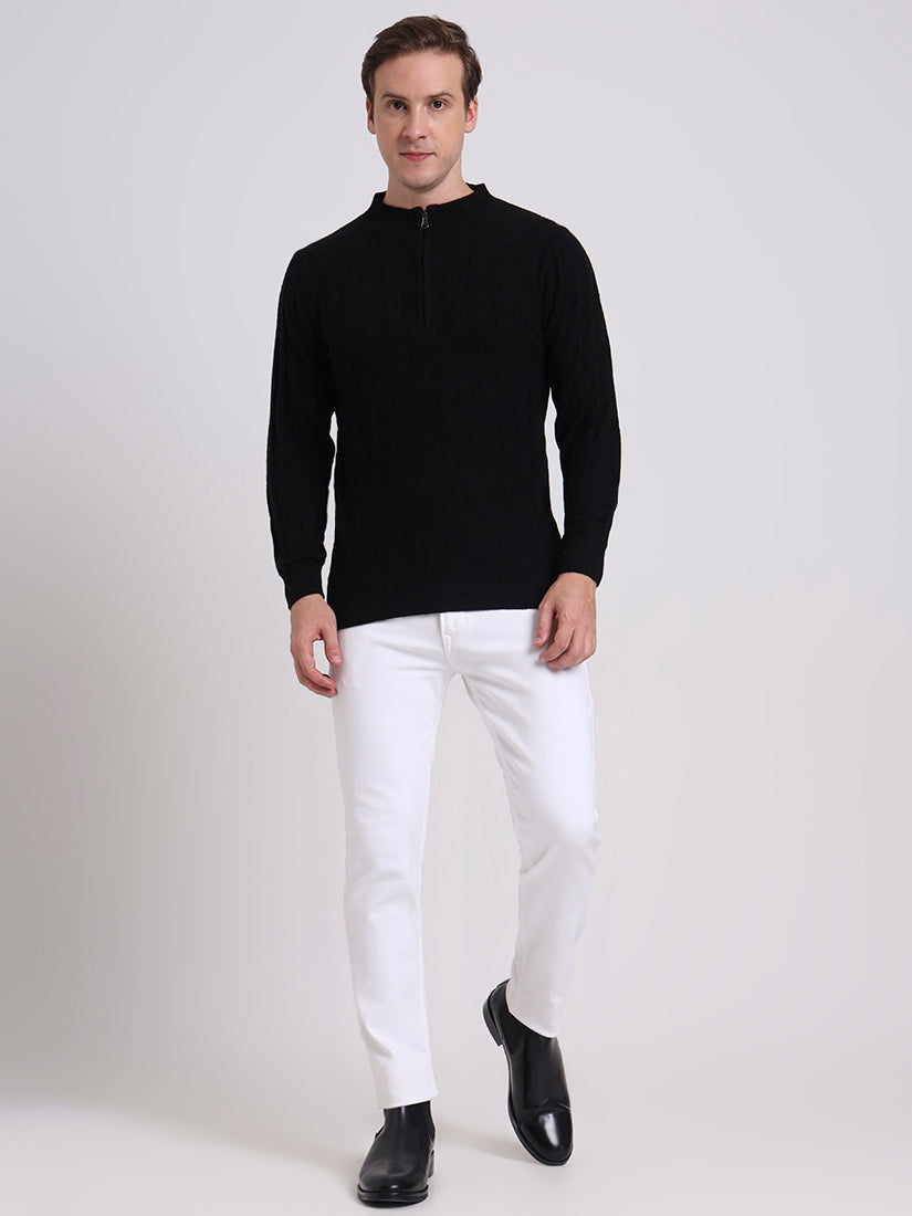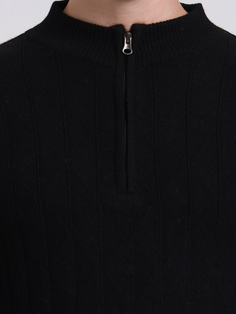Sharp and confident in pure black, this pullover is a study in understated luxury. The cable design softens the intensity with refined structure, while the full sleeves and zip neckline offer comfort and flexibility — a modern classic for the discerning wardrobe.