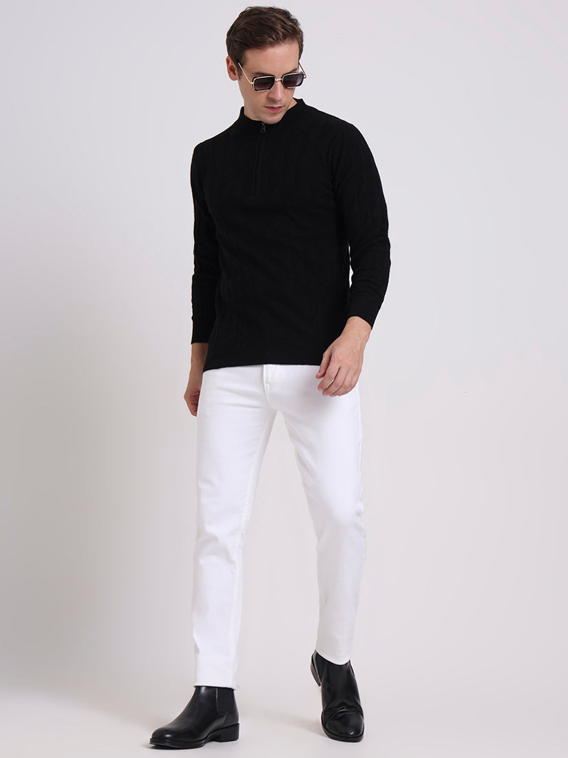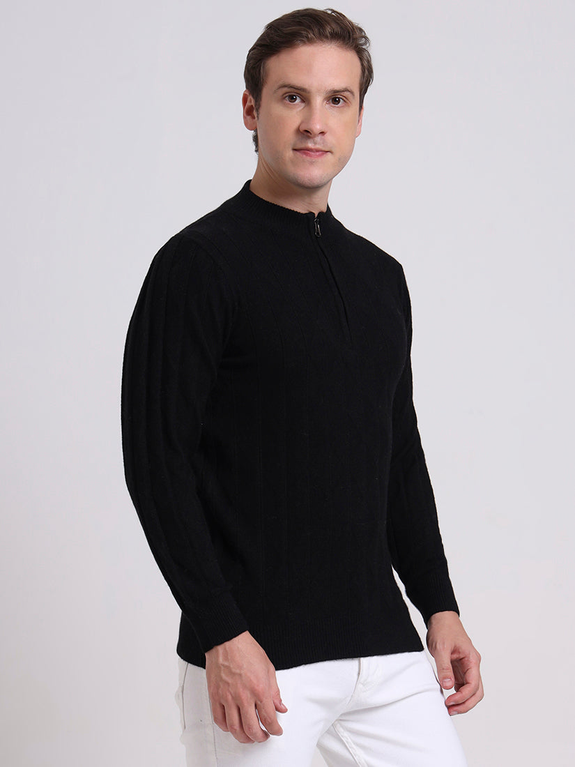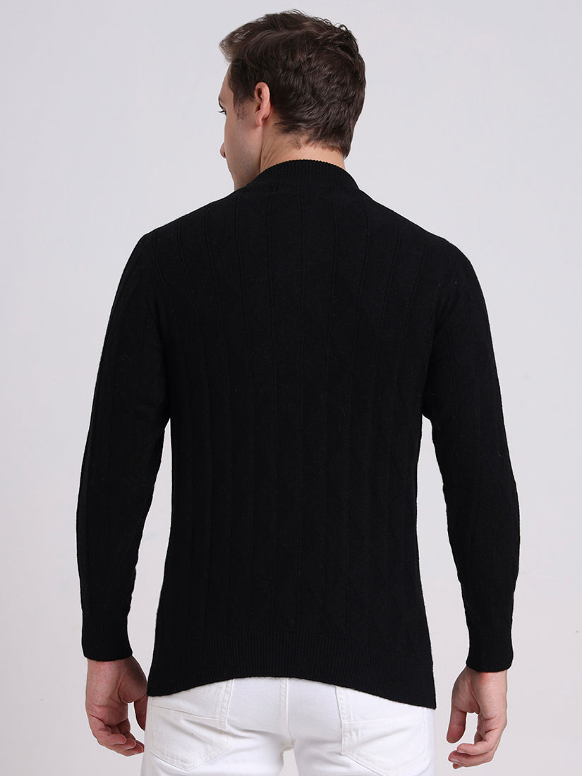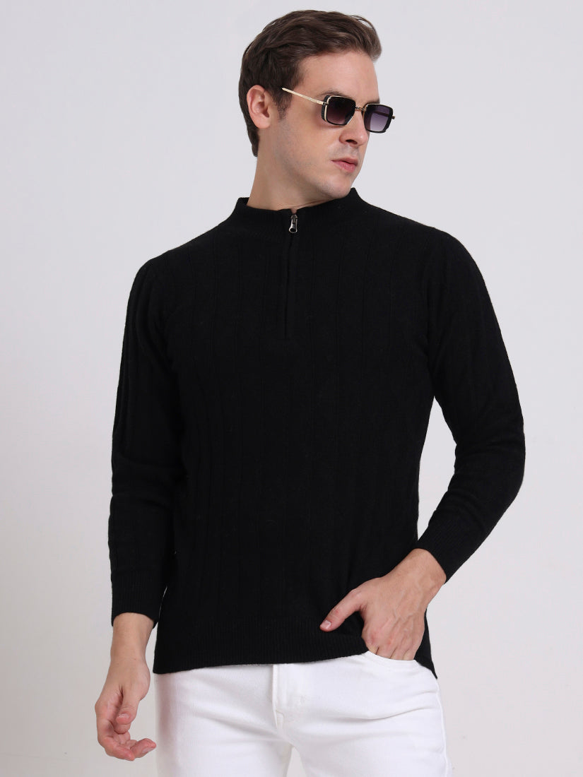 Sharp and confident in pure black, this pullover is a study in understated luxury. The cable design softens the intensity with refined structure, while the full sleeves and zip neckline offer comfort and flexibility — a modern classic for the discerning wardrobe.