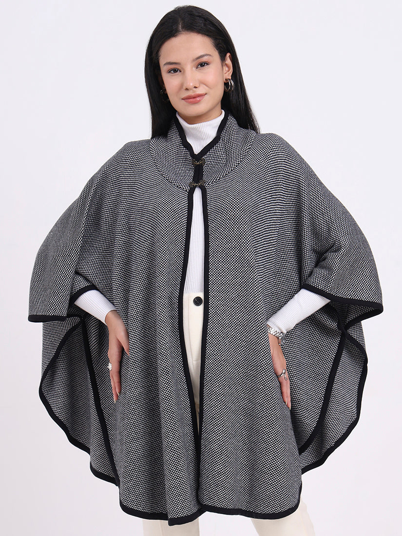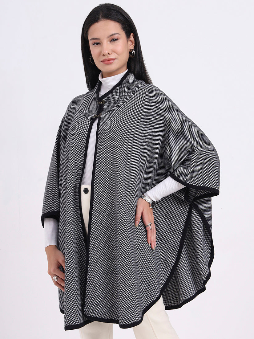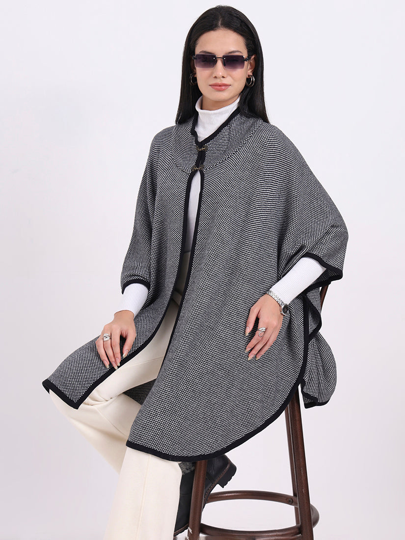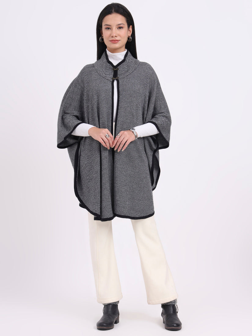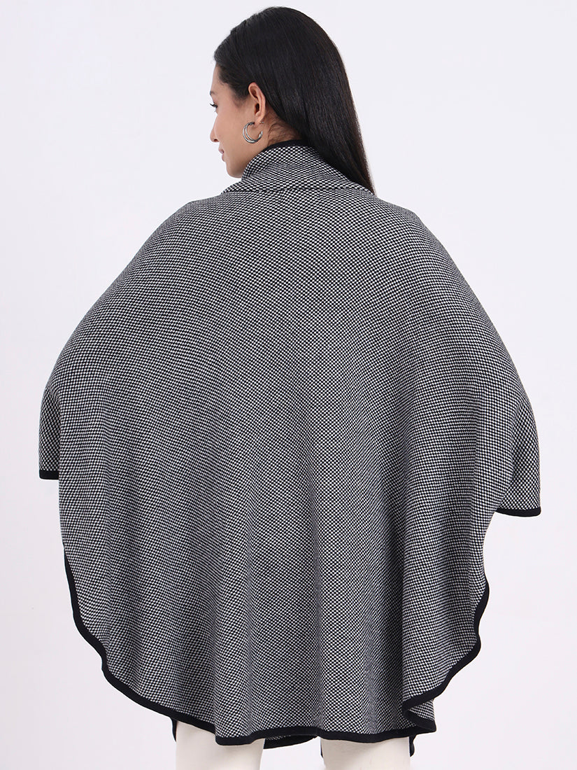 The Obsidian Weave Cape in black wool embodies modern minimalism with its fluid drape and refined finish. A versatile companion, it elevates both everyday style and formal layering.