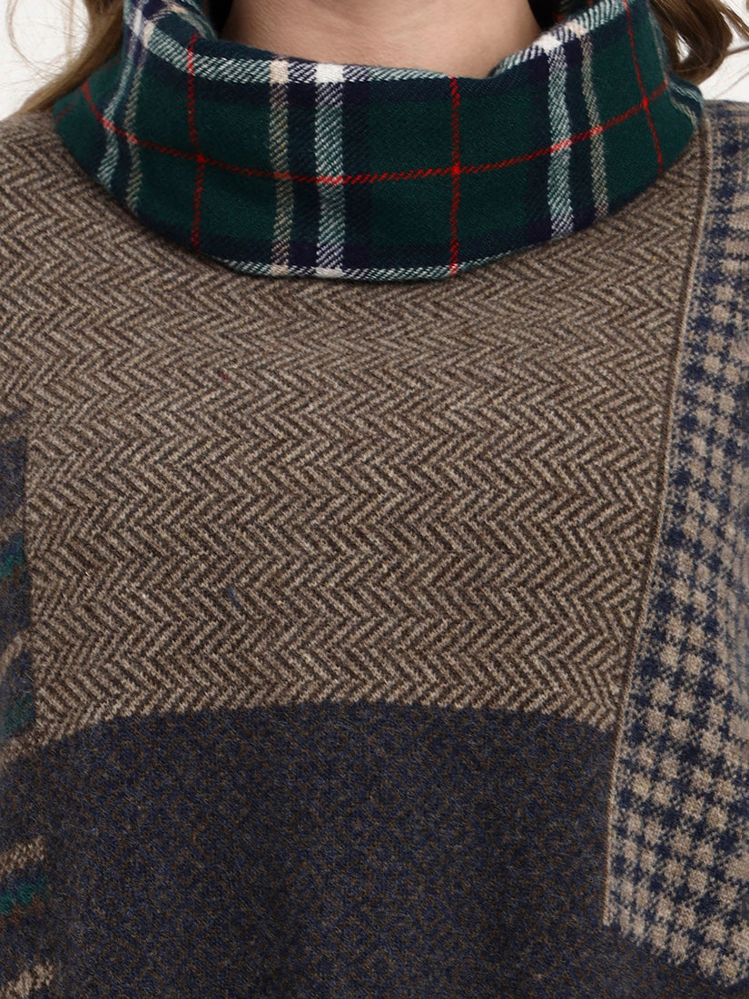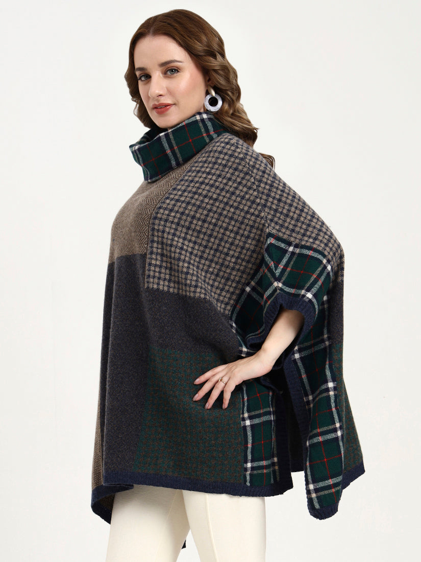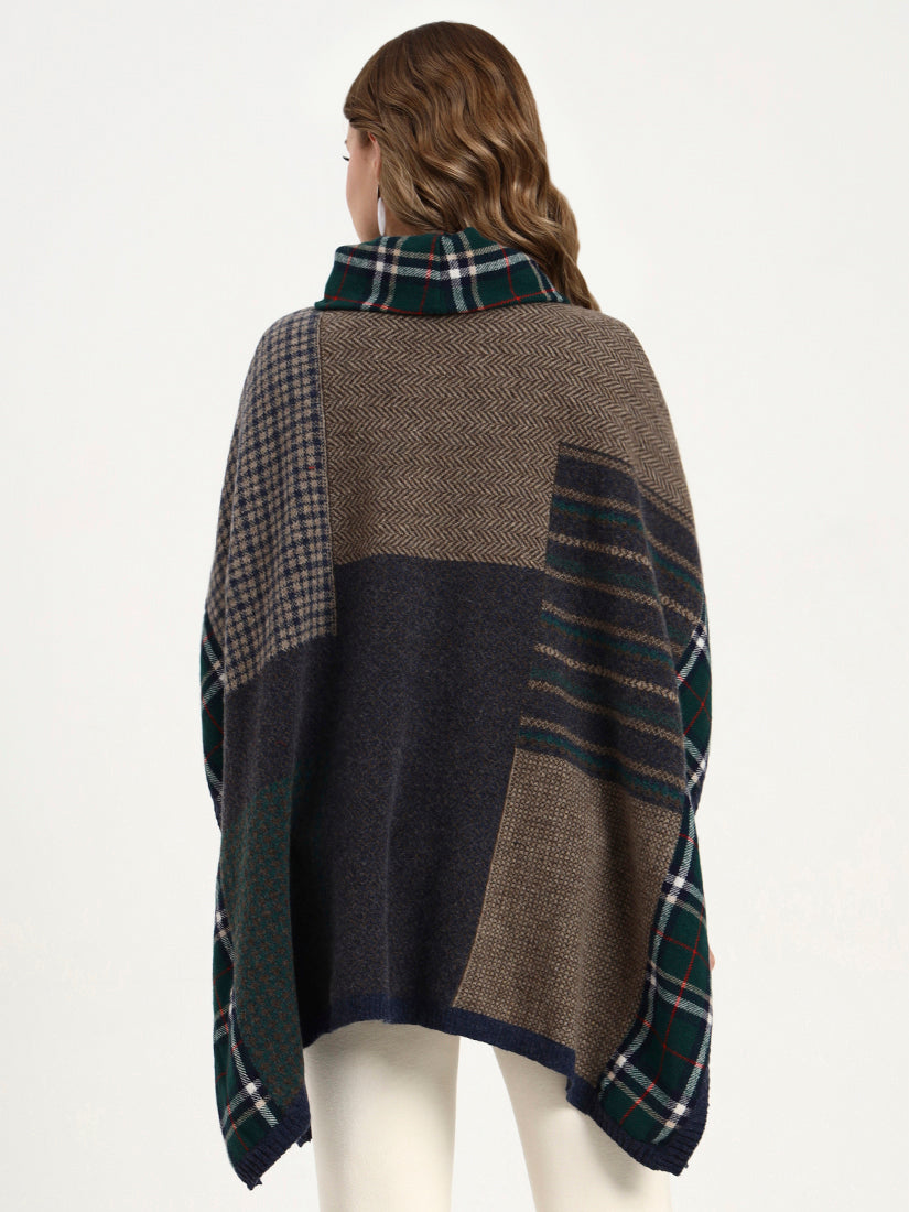 The Ocean Mosaic Poncho, in deep blue lambswool, features bold multi-color accents and a structured high neckline. Designed for warmth and distinction, it blends timeless knit artistry with a vibrant, contemporary spirit.