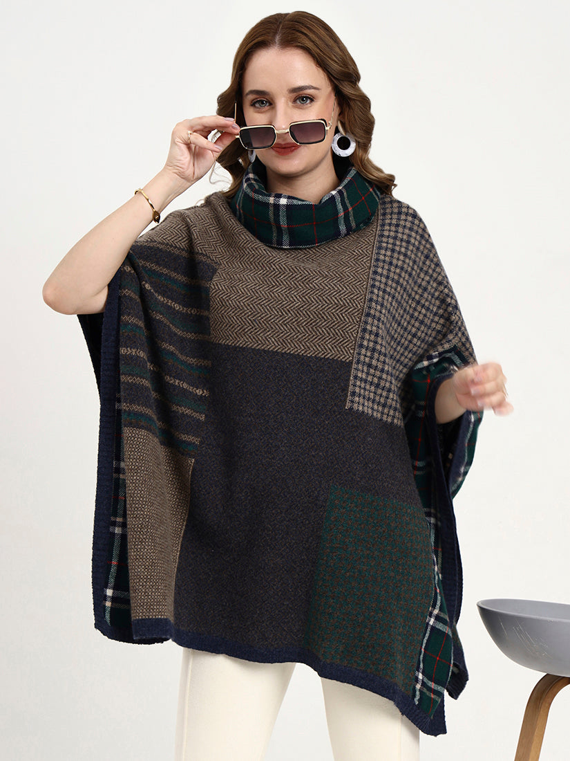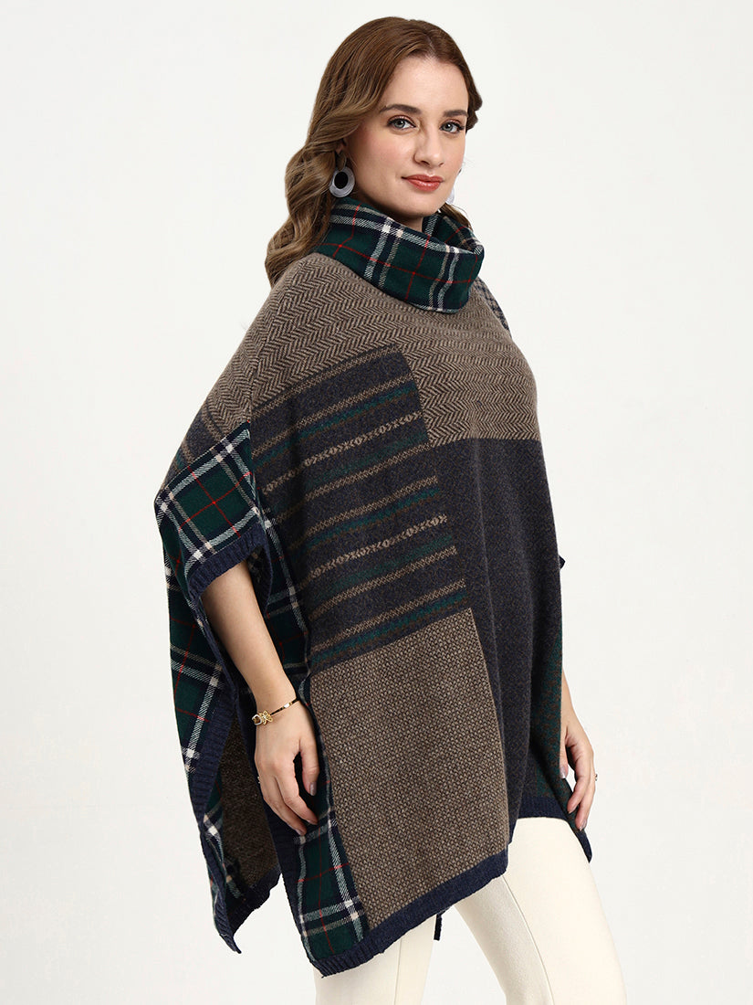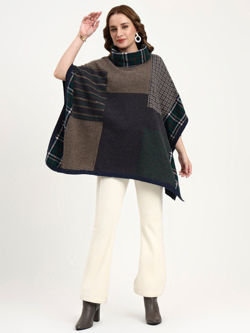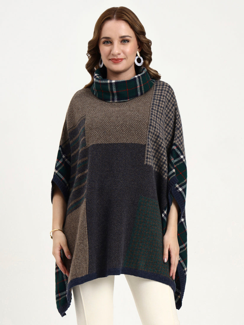 The Ocean Mosaic Poncho, in deep blue lambswool, features bold multi-color accents and a structured high neckline. Designed for warmth and distinction, it blends timeless knit artistry with a vibrant, contemporary spirit.