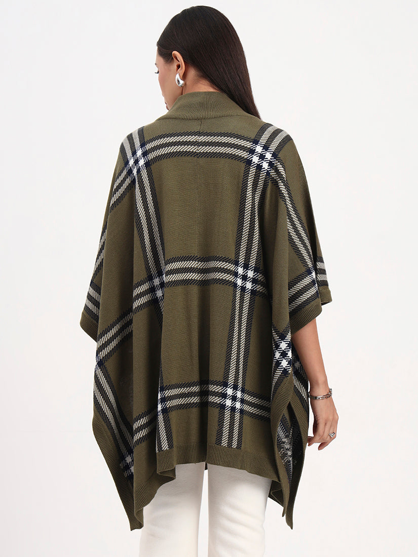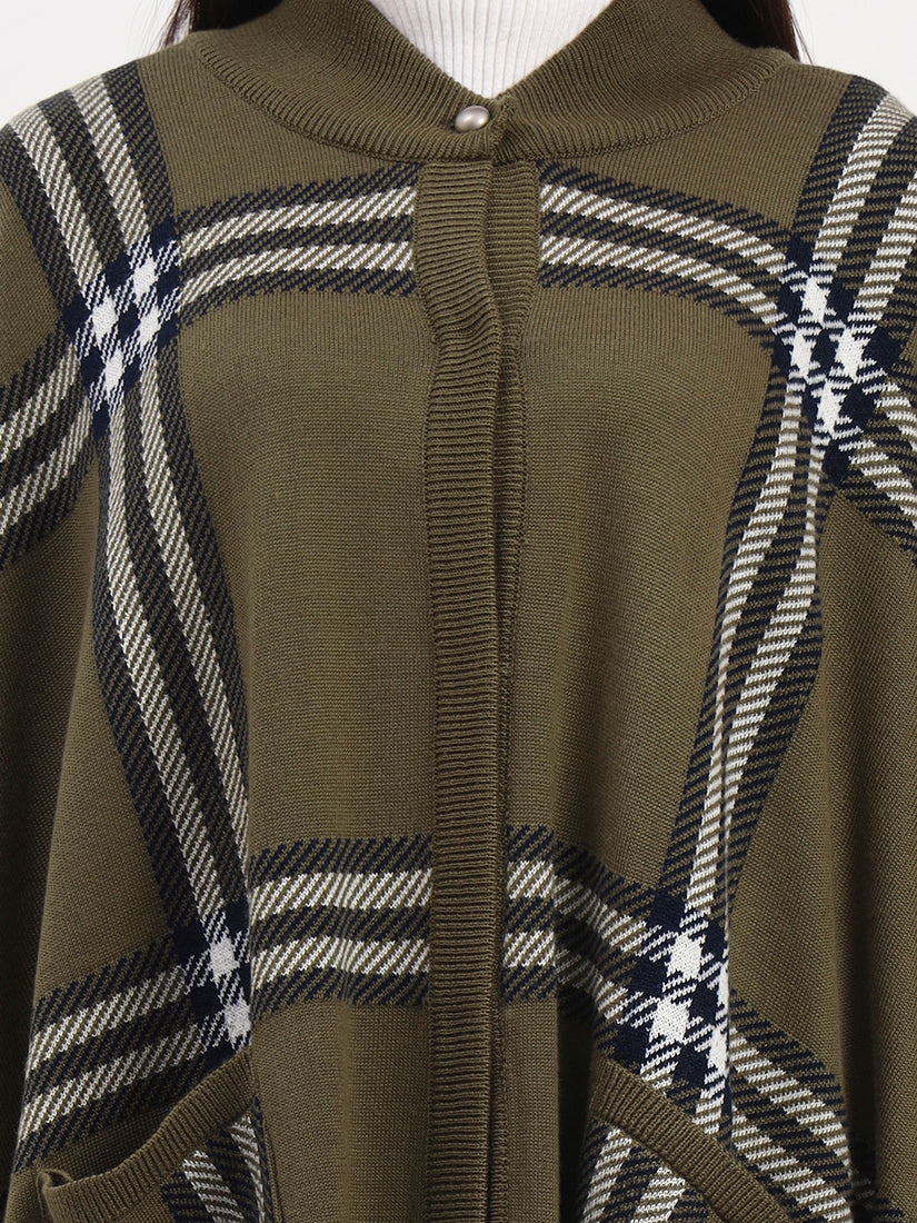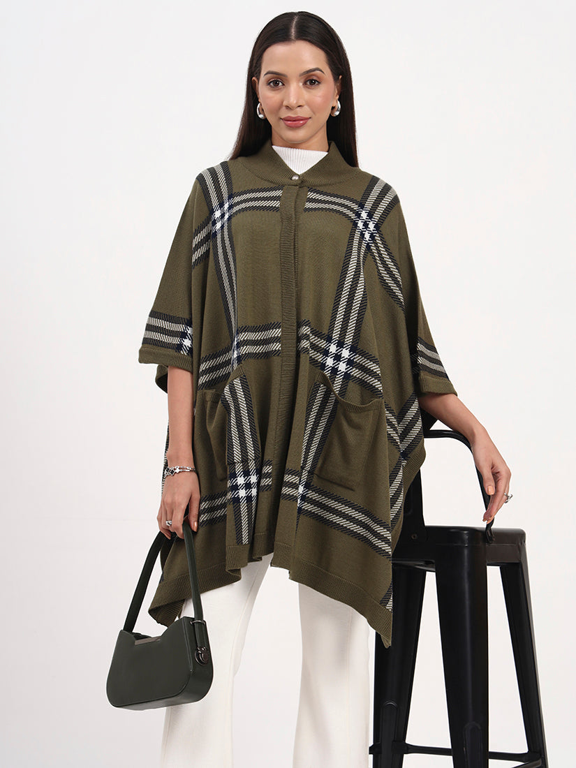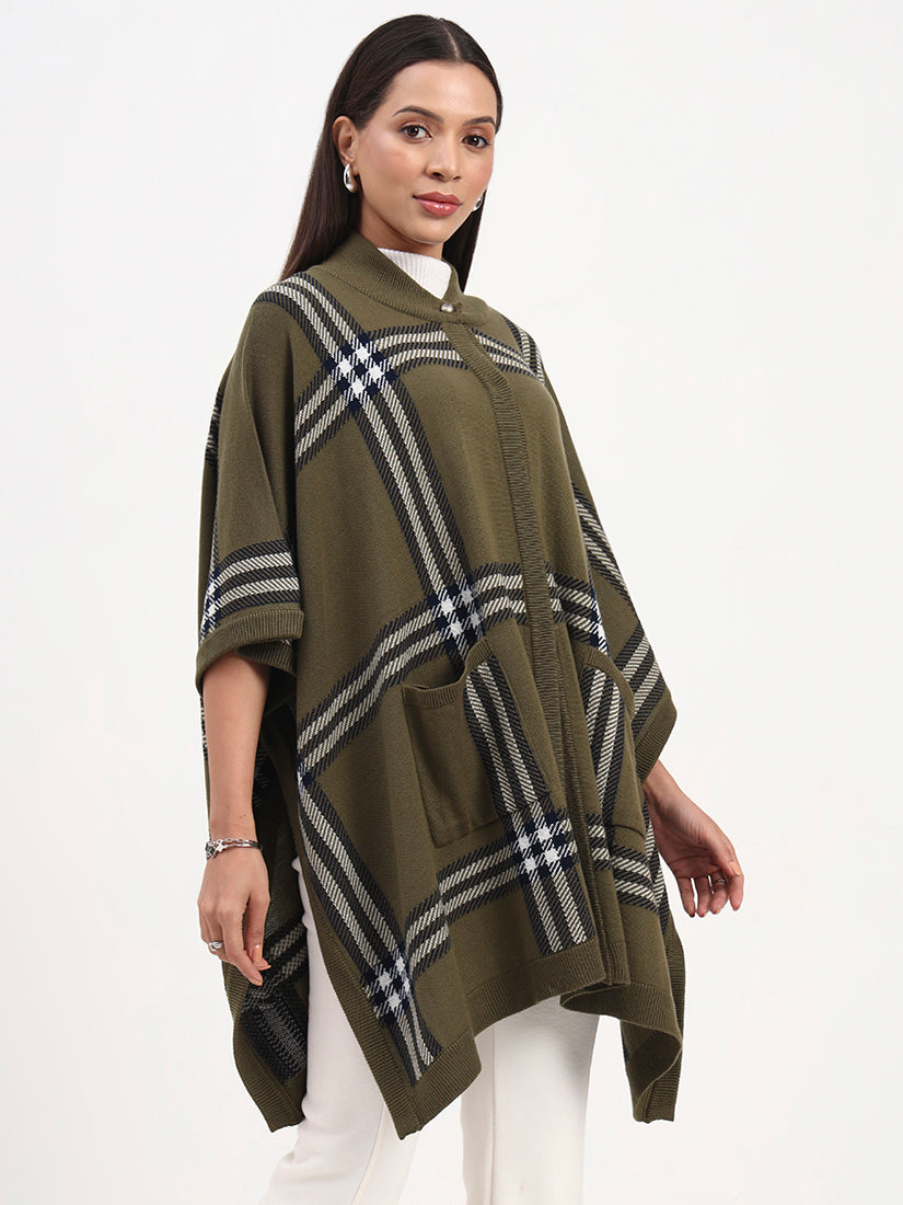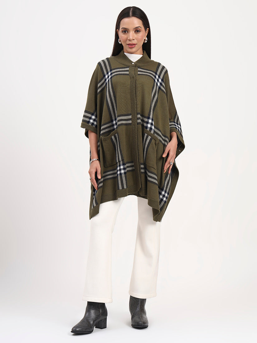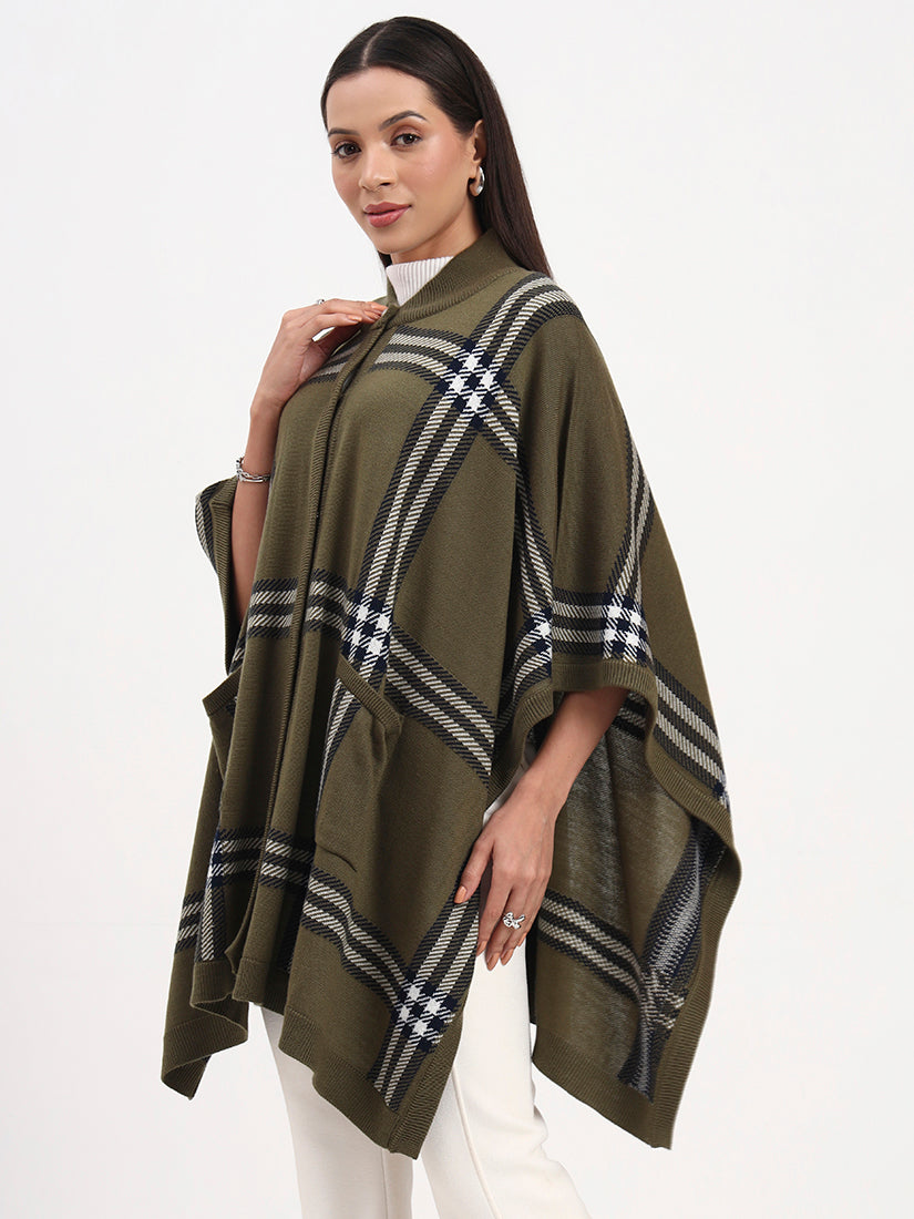 An olive-toned cape detailed with bold, heritage-inspired plaid lines, offering a perfect balance of warmth and elegance. The roomy, relaxed drape and practical front pockets add everyday ease, making it an effortlessly stylish layer for crisp, transitional days.