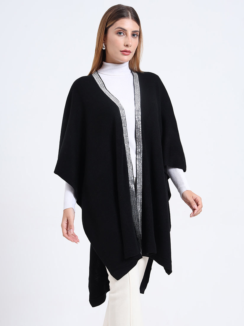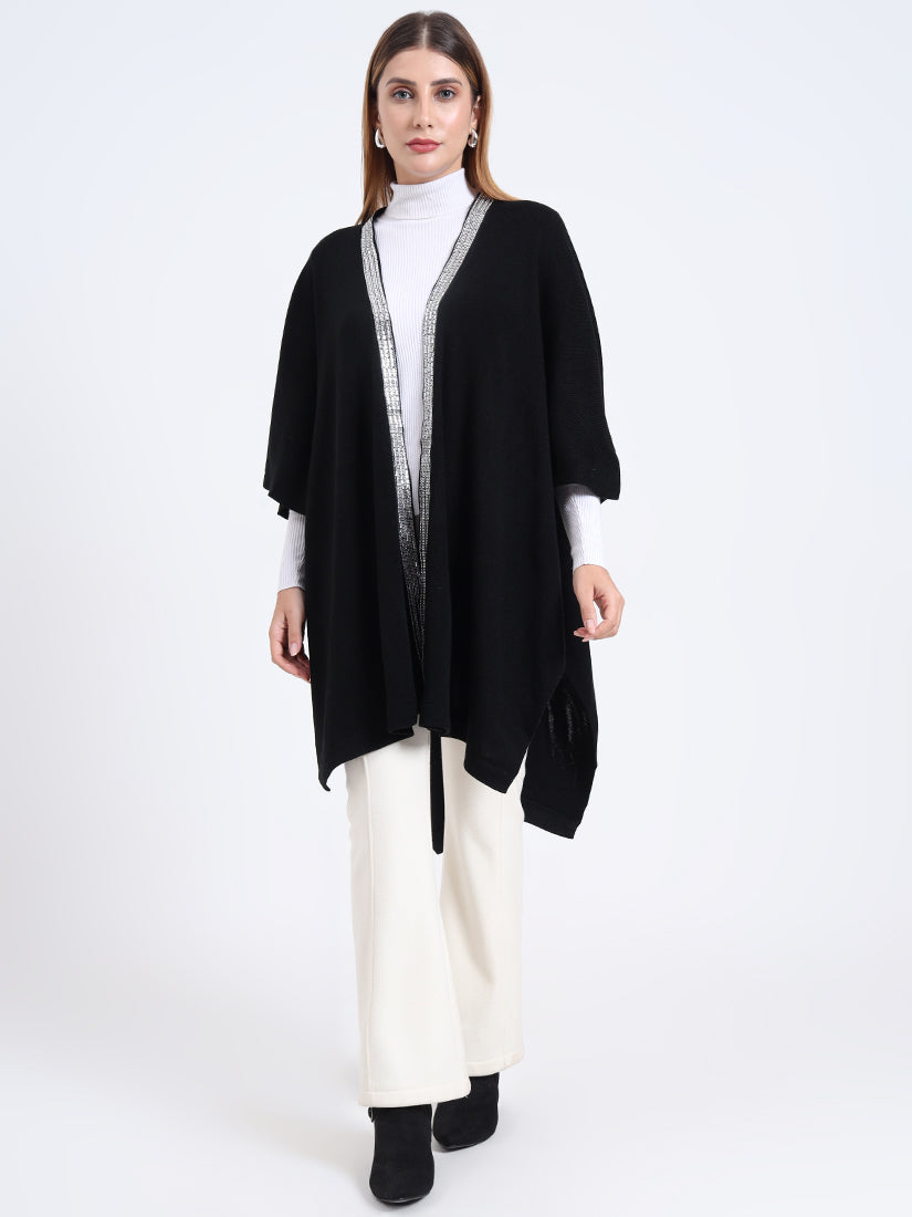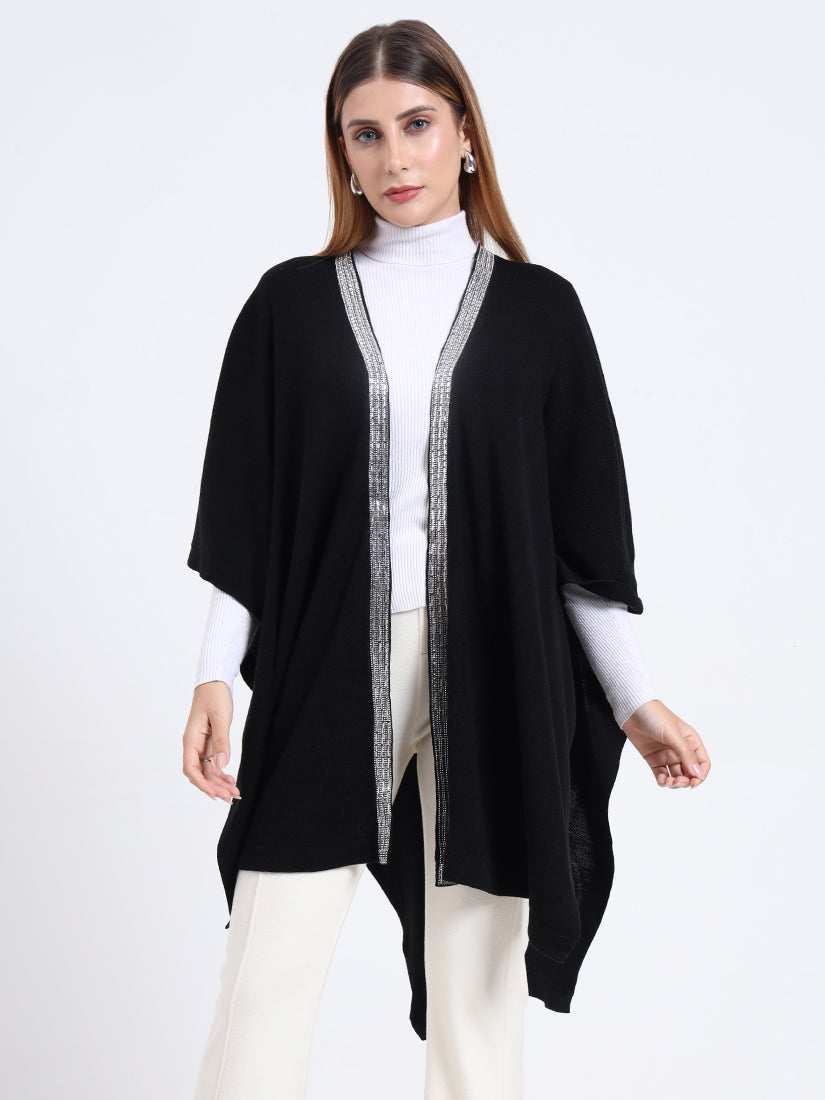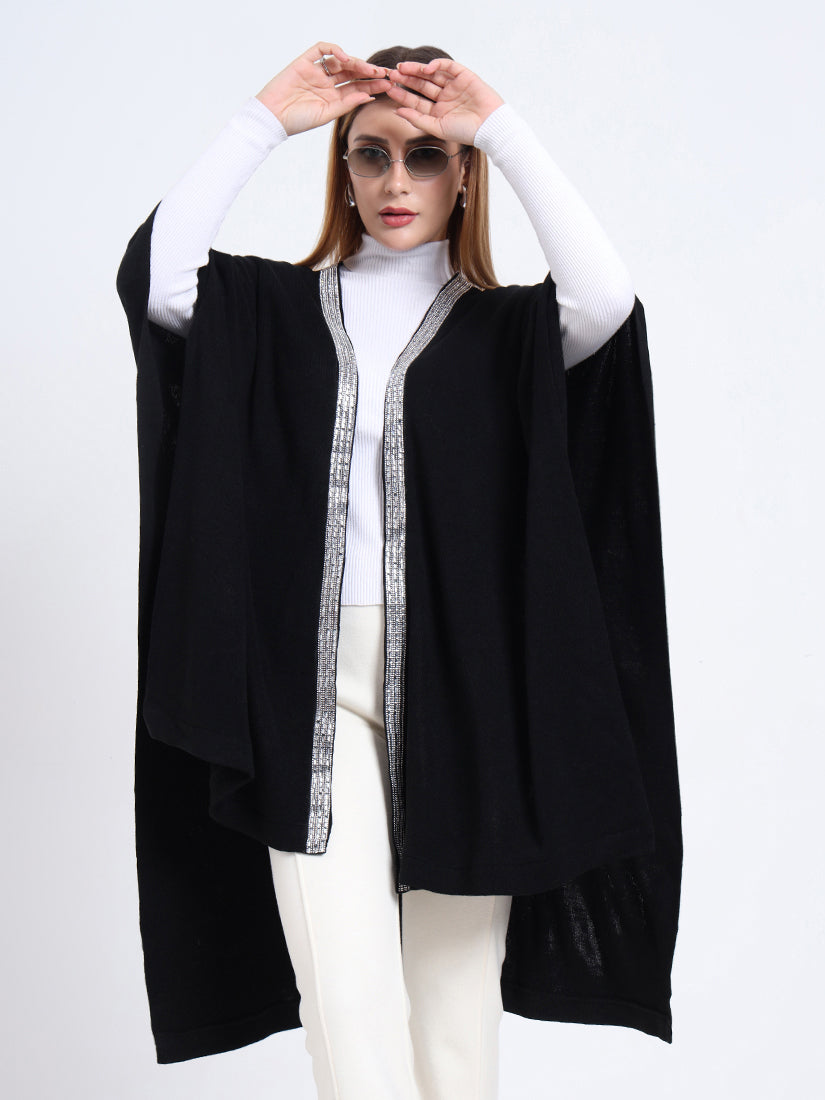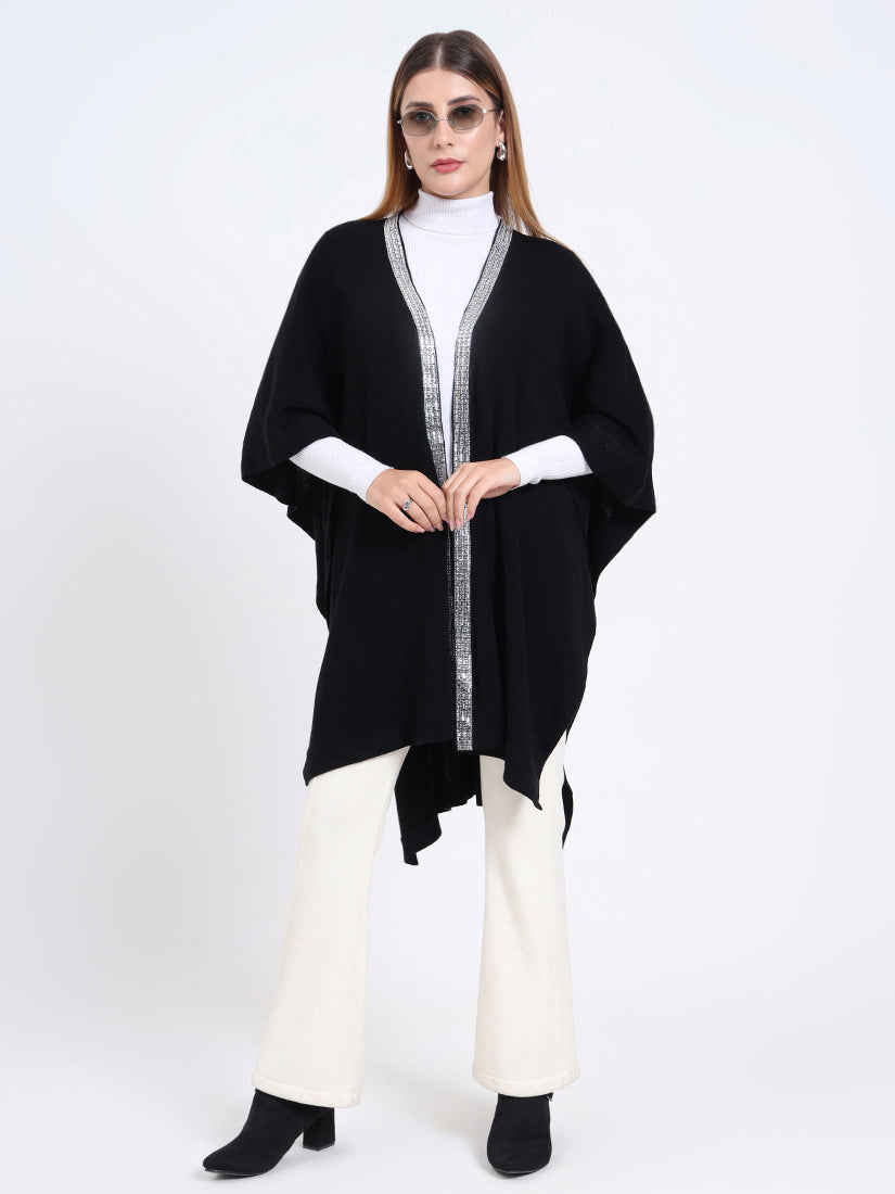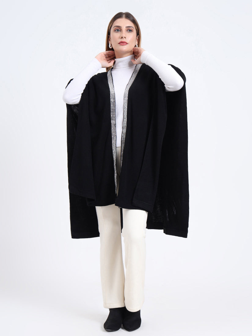 Sleek and timeless, the Onyx Silver Cape features a pure black canvas adorned with gleaming silver edges. Woven in soft wool blends, it reflects the quiet brilliance of moonlight against a night sky.