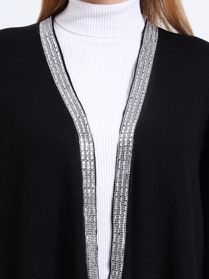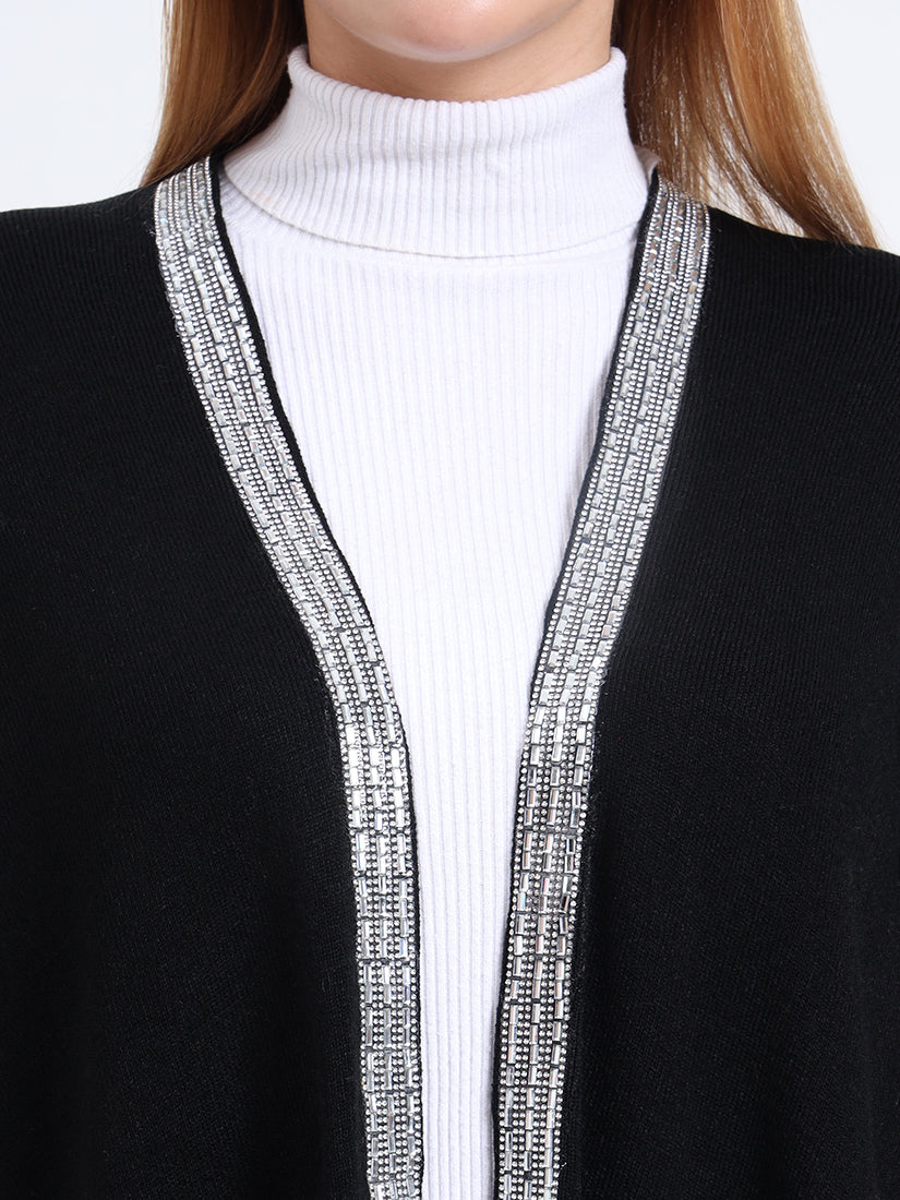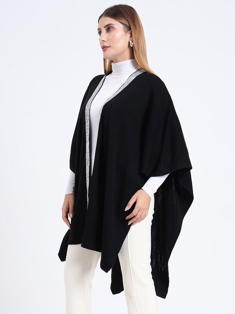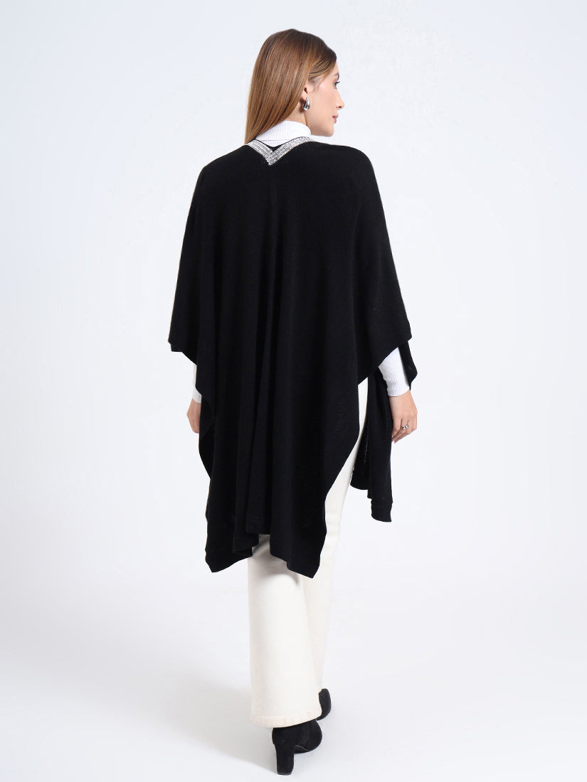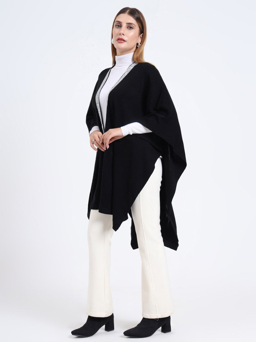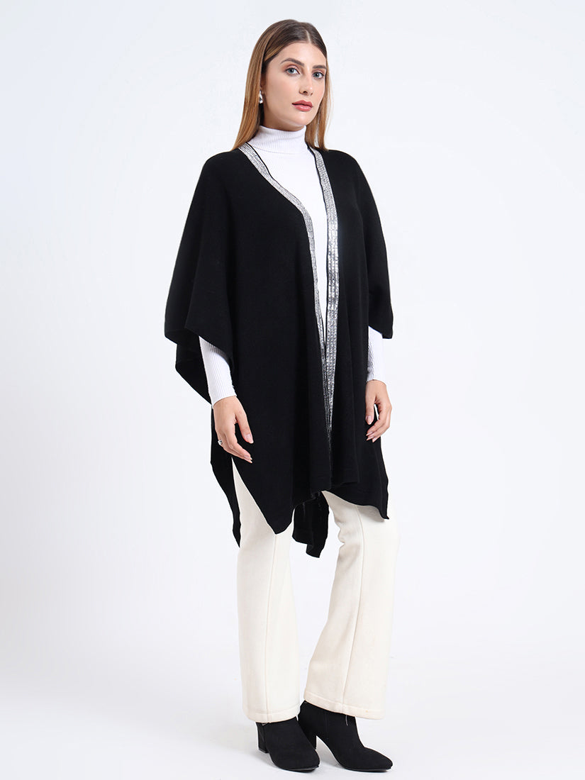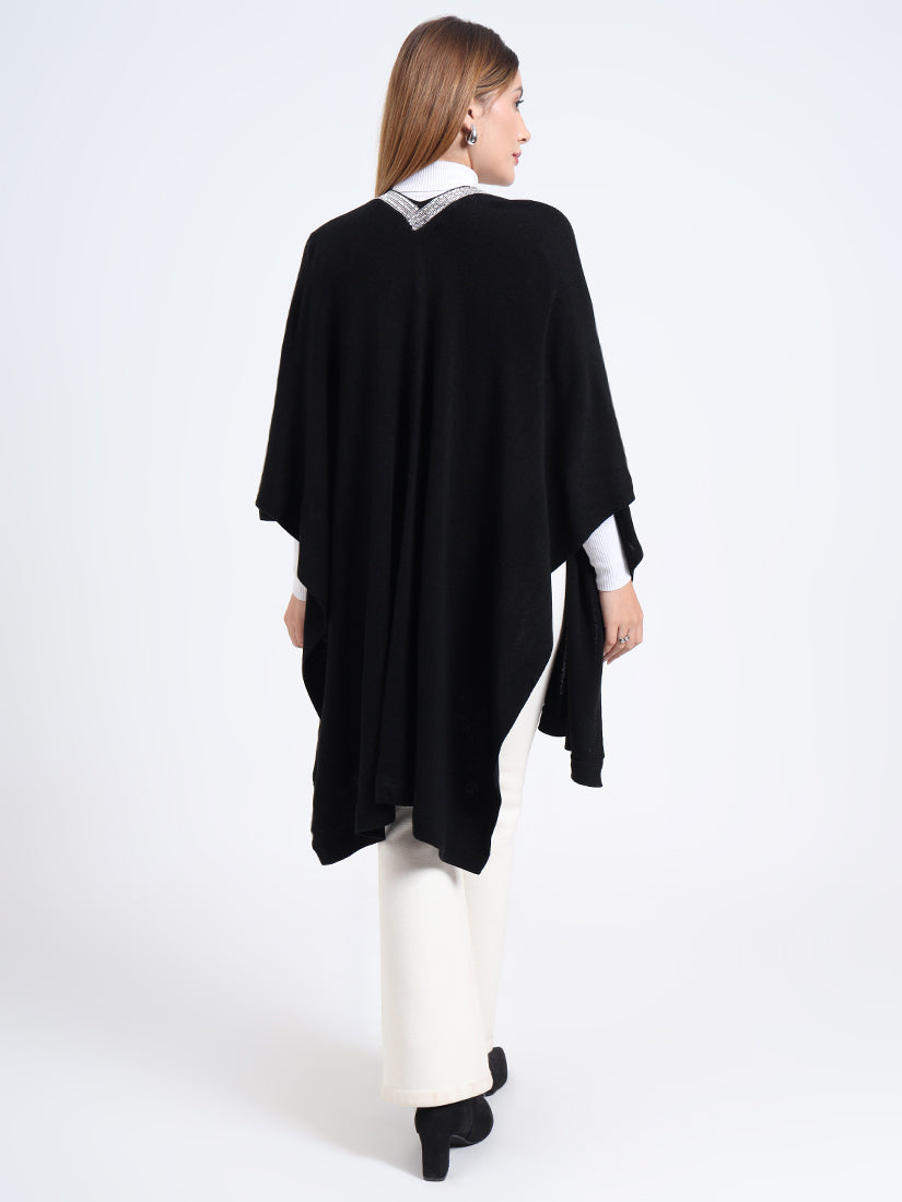 Sleek and timeless, the Onyx Silver Cape features a pure black canvas adorned with gleaming silver edges. Woven in soft wool blends, it reflects the quiet brilliance of moonlight against a night sky.