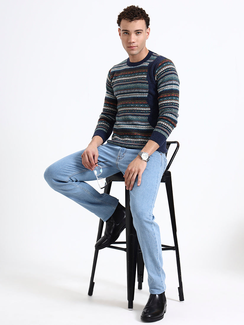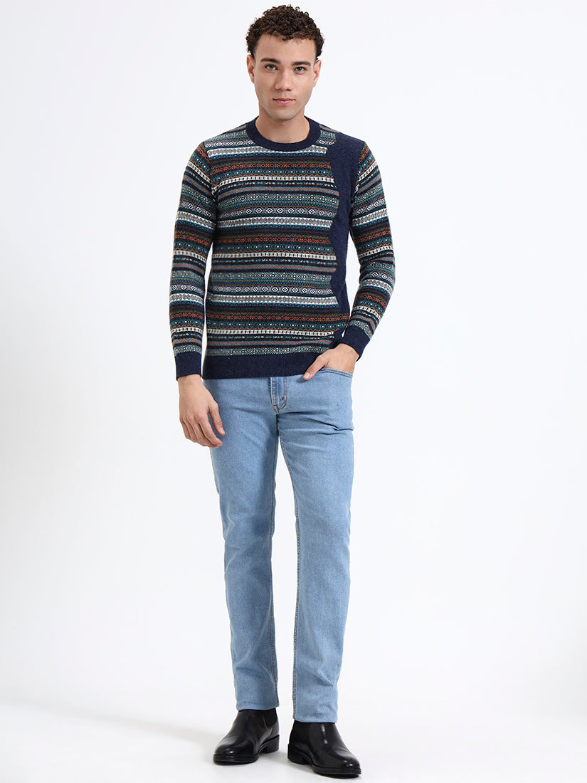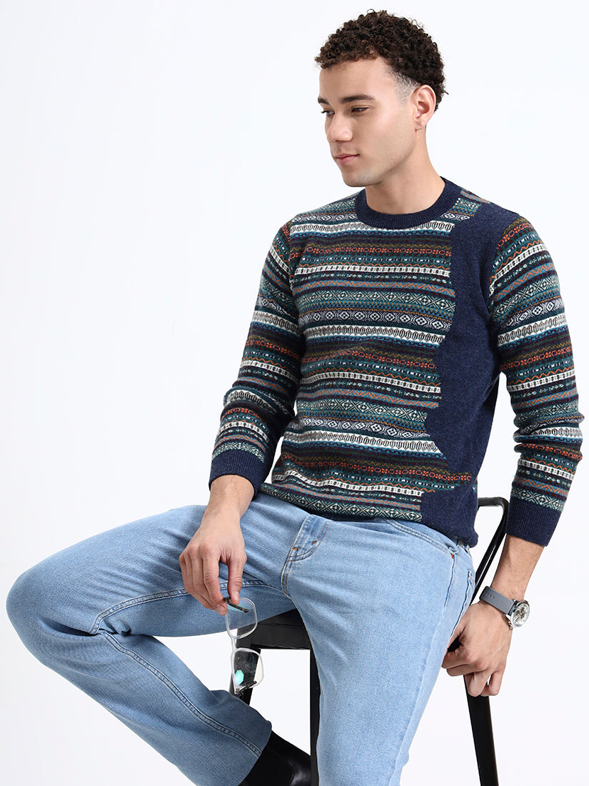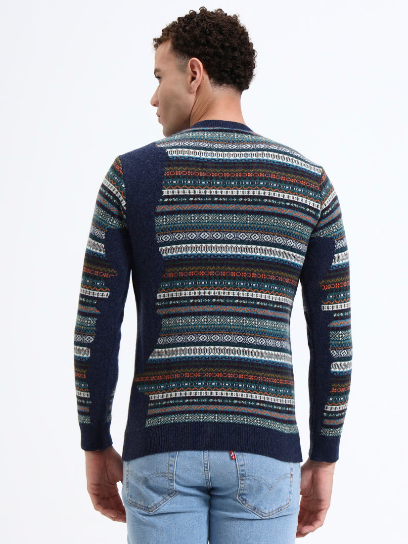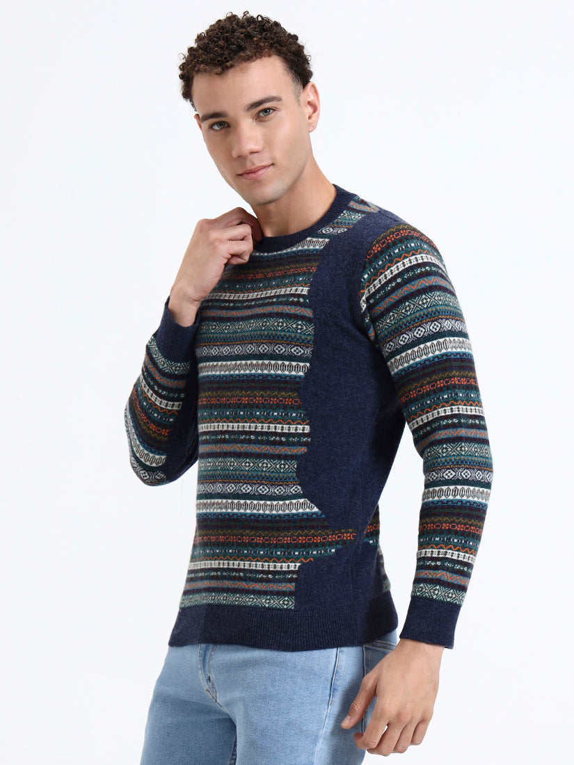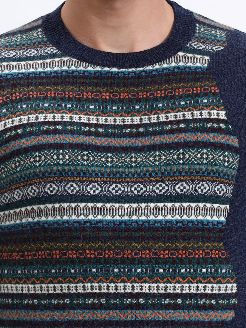 Drawing from Scotland’s Fair Isle tradition, this blue pullover features an all-over Fair Isle pattern with a subtle asymmetric design in warm, multicolour tones. Crafted from a soft Lamb’s Wool blend, it provides natural warmth and comfort with a touch of timeless style.