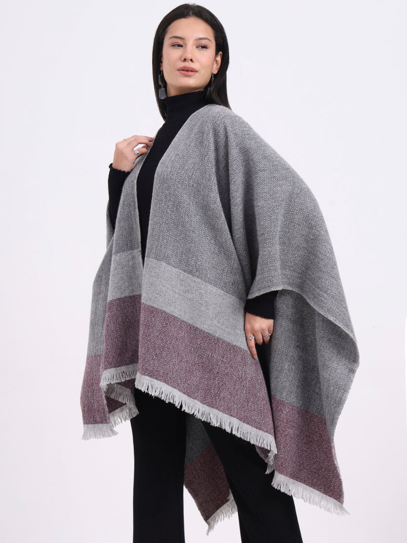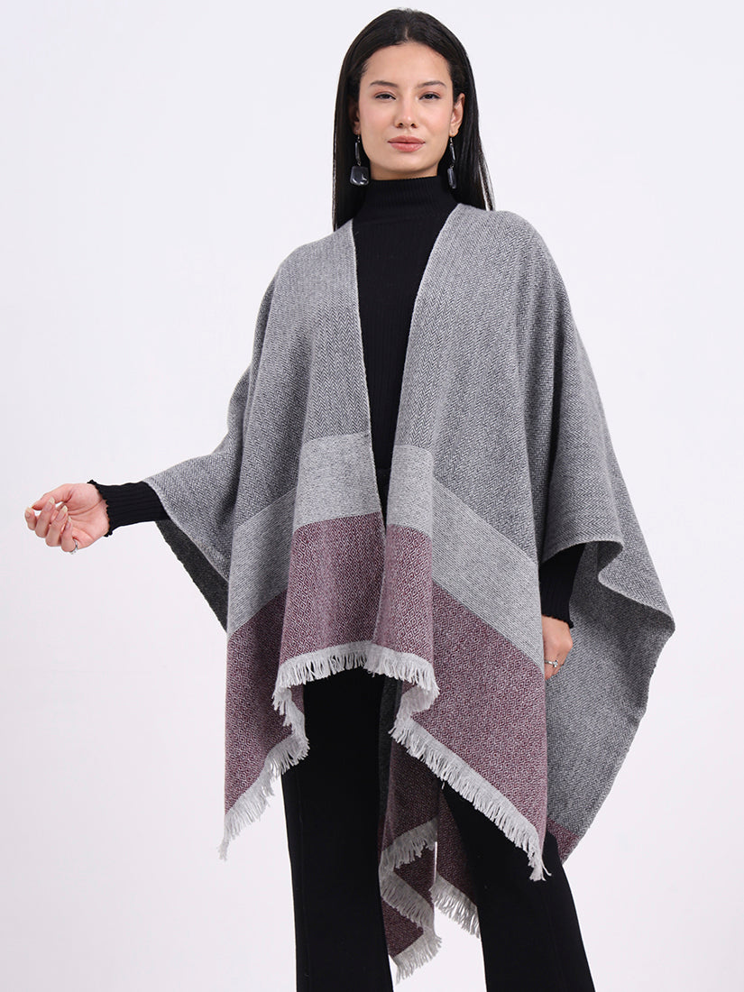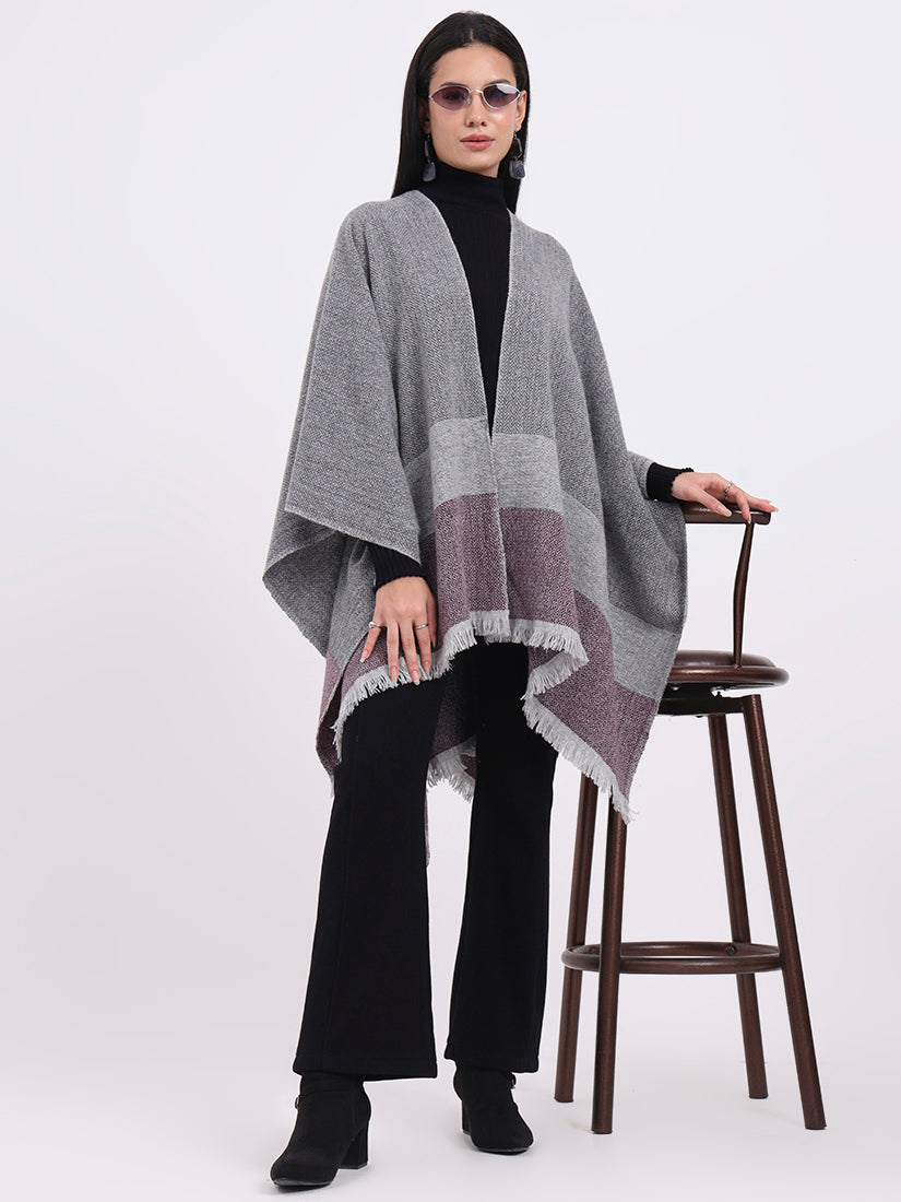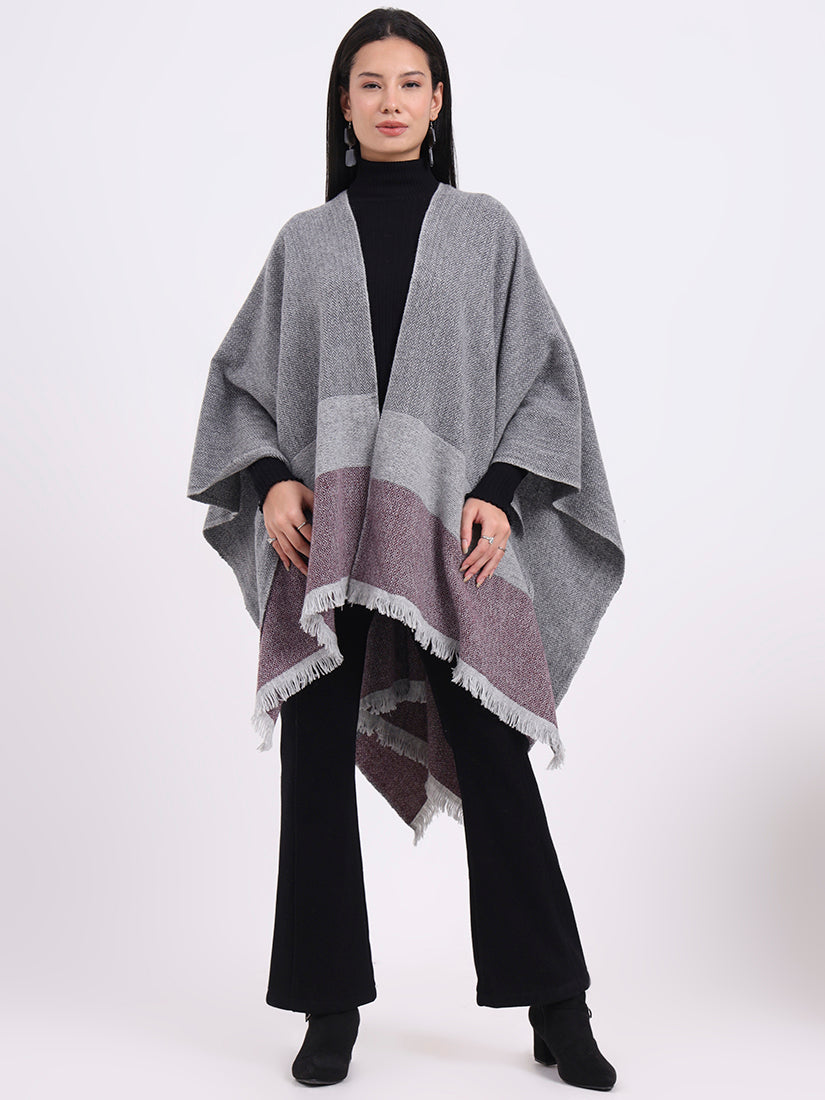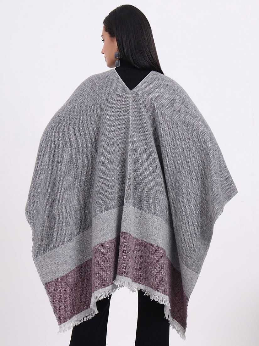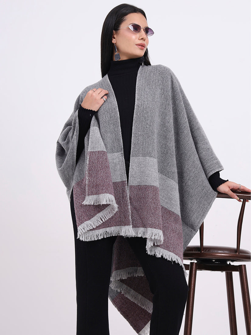 The Plumwood Herringbone Cape pairs classic grey with rich plum accents for a refined statement. Crafted in soft lambswool with subtle texture and finished with fringe edges, it drapes with ease, bringing warmth, elegance, and versatility to every season.