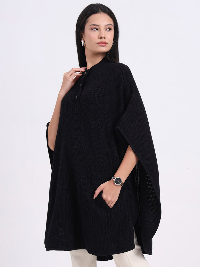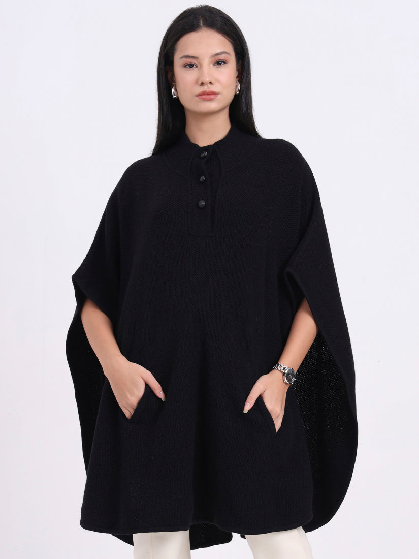 A deep navy poncho shaped with a cocoon-like drape and rolled collar for subtle structure. The knit’s fluid fall creates an elegant, elongated line. Effortless, warm, and refined—ideal for elevated everyday wear.