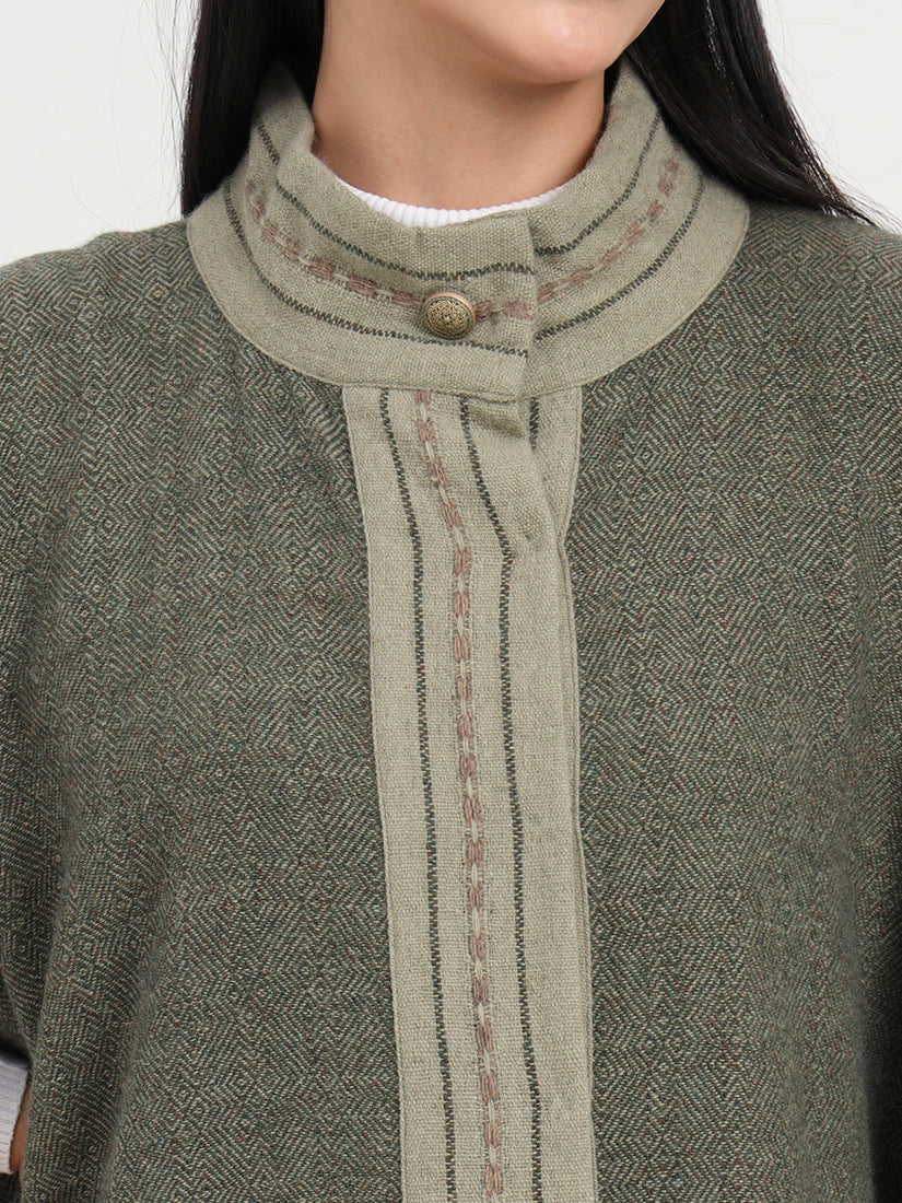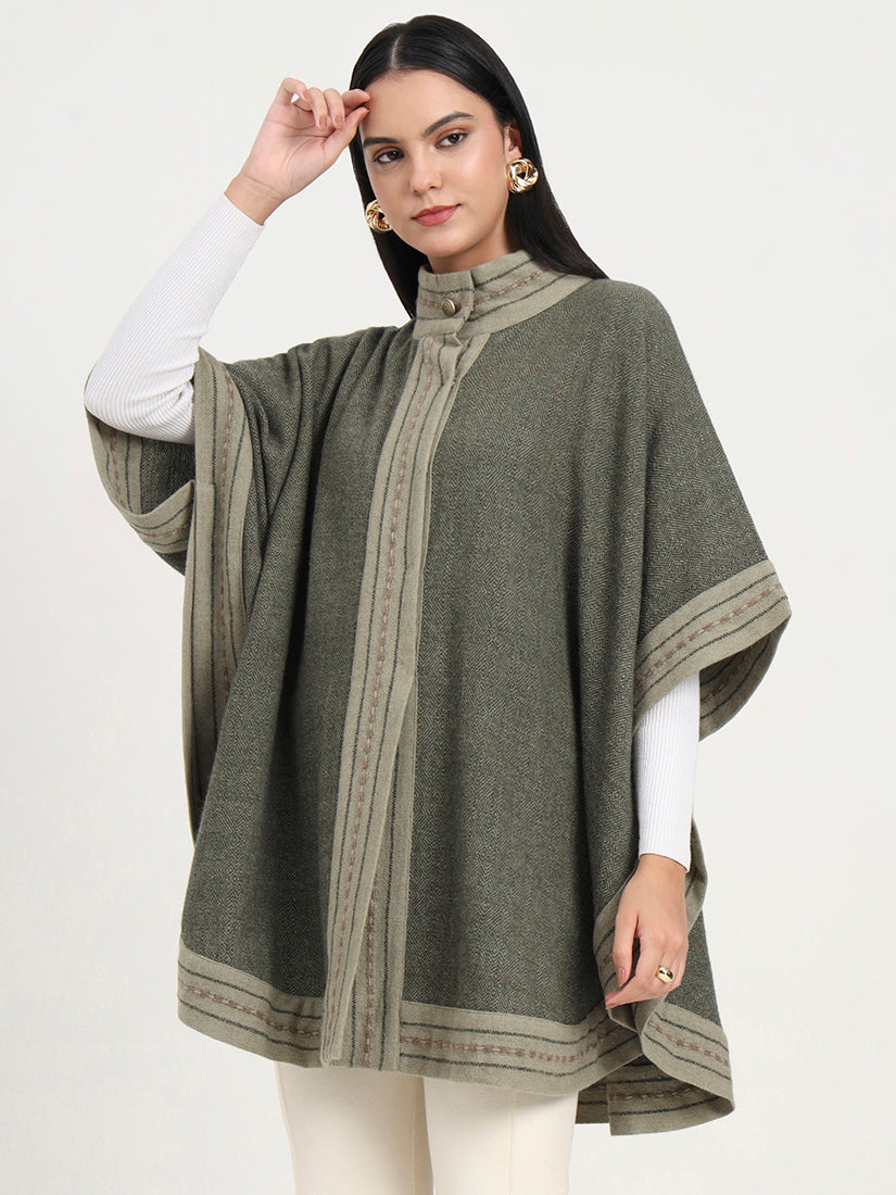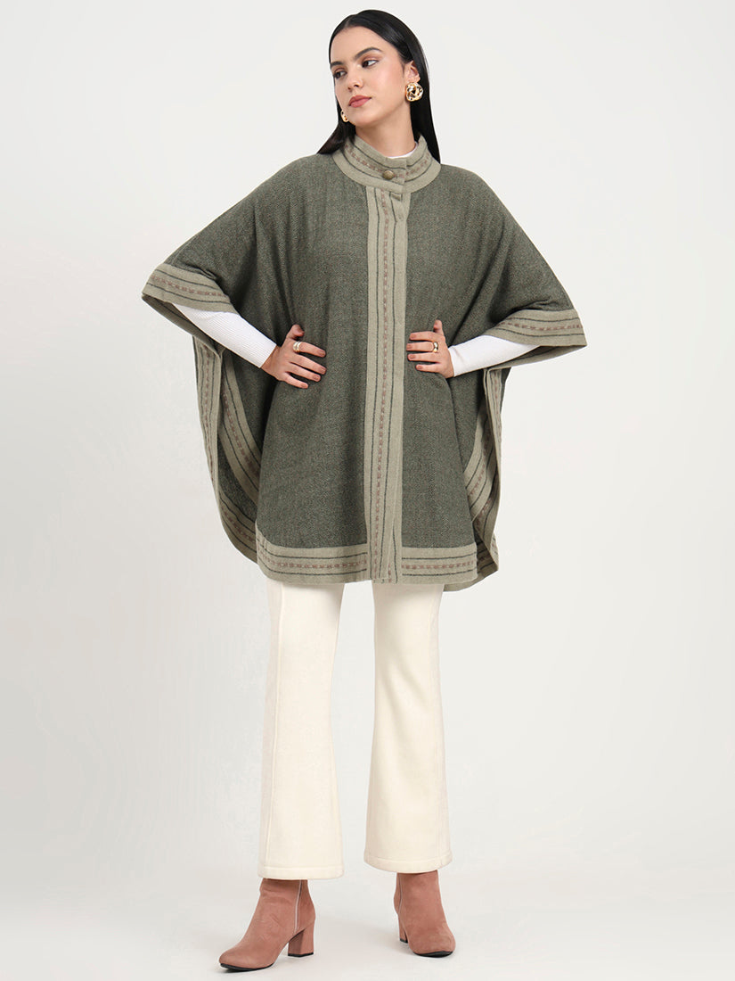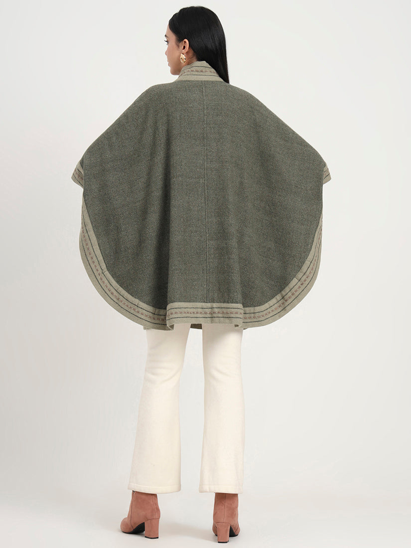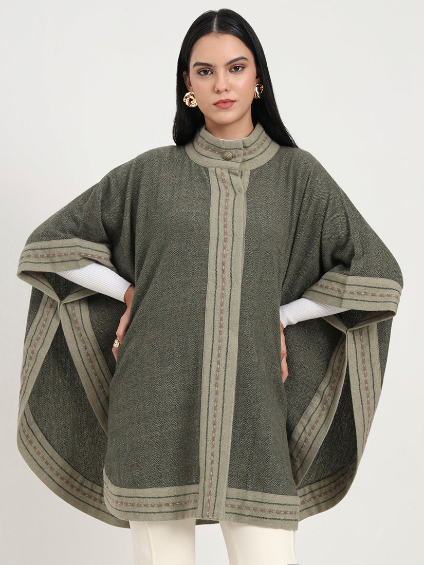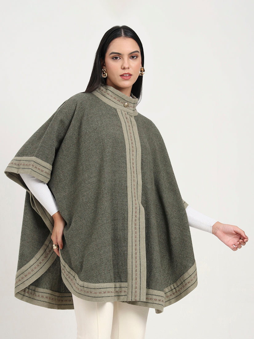 Crafted by hand in pure lambswool, the Rifle Moss Cape draws inspiration from rugged landscapes. Its muted green base and elegant trim capture grounded strength, translating into enduring sophistication.