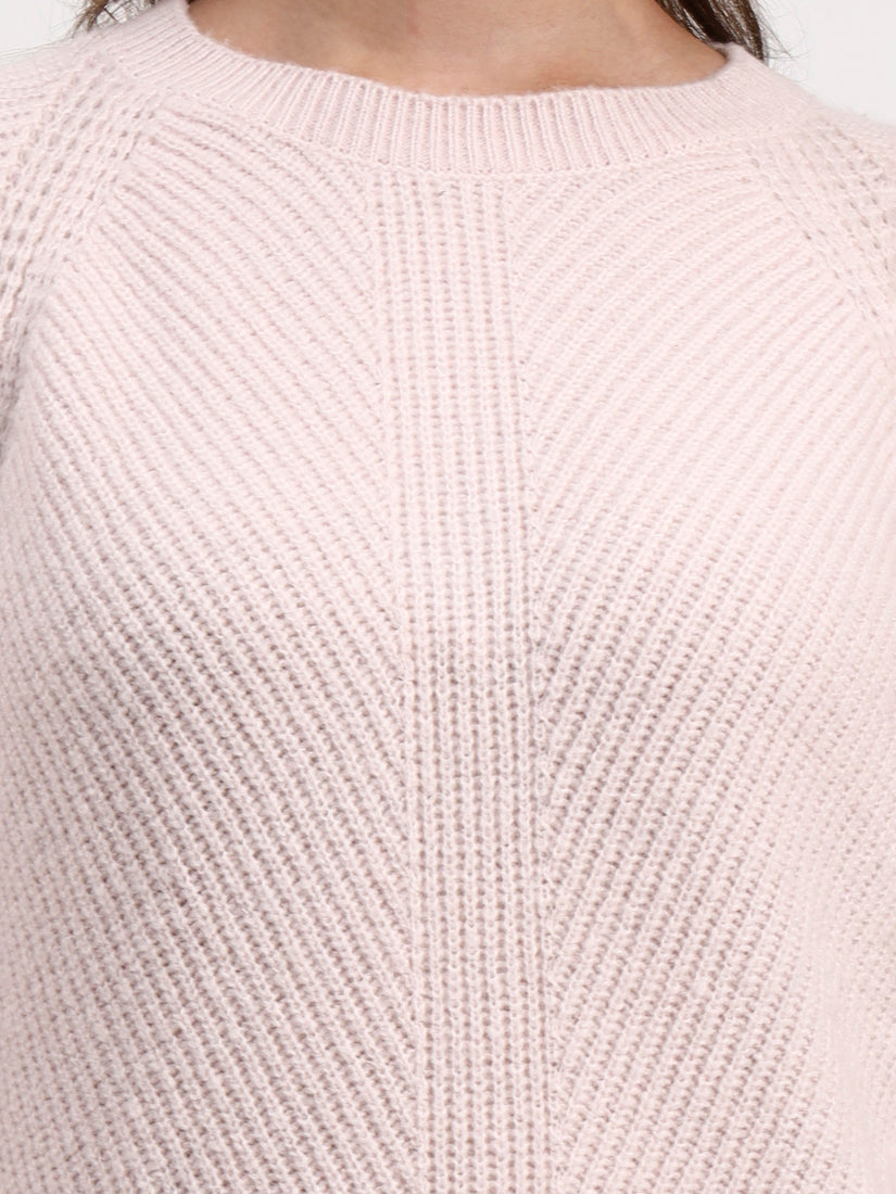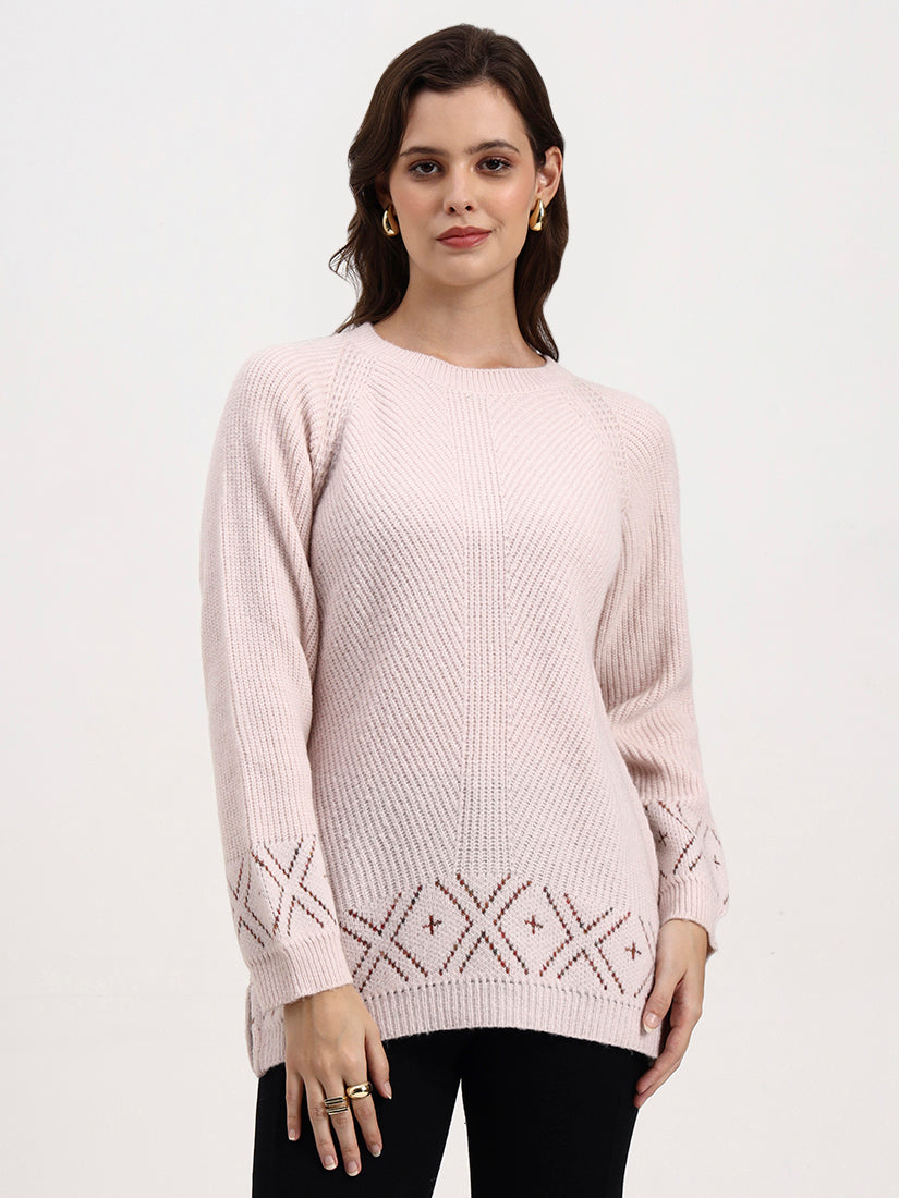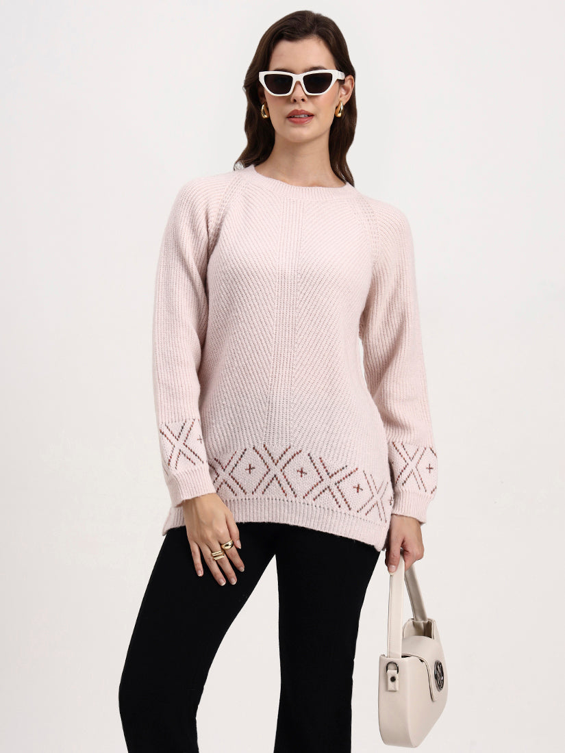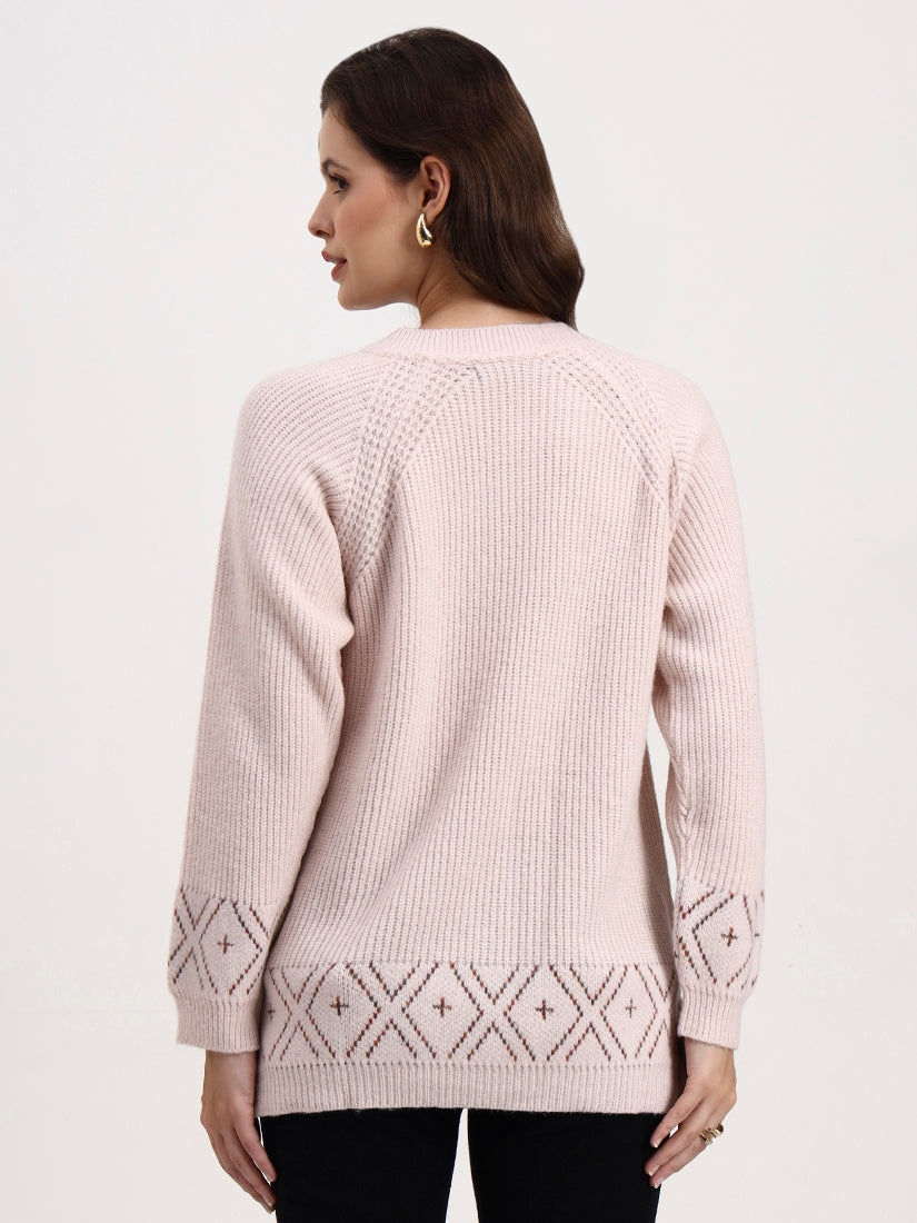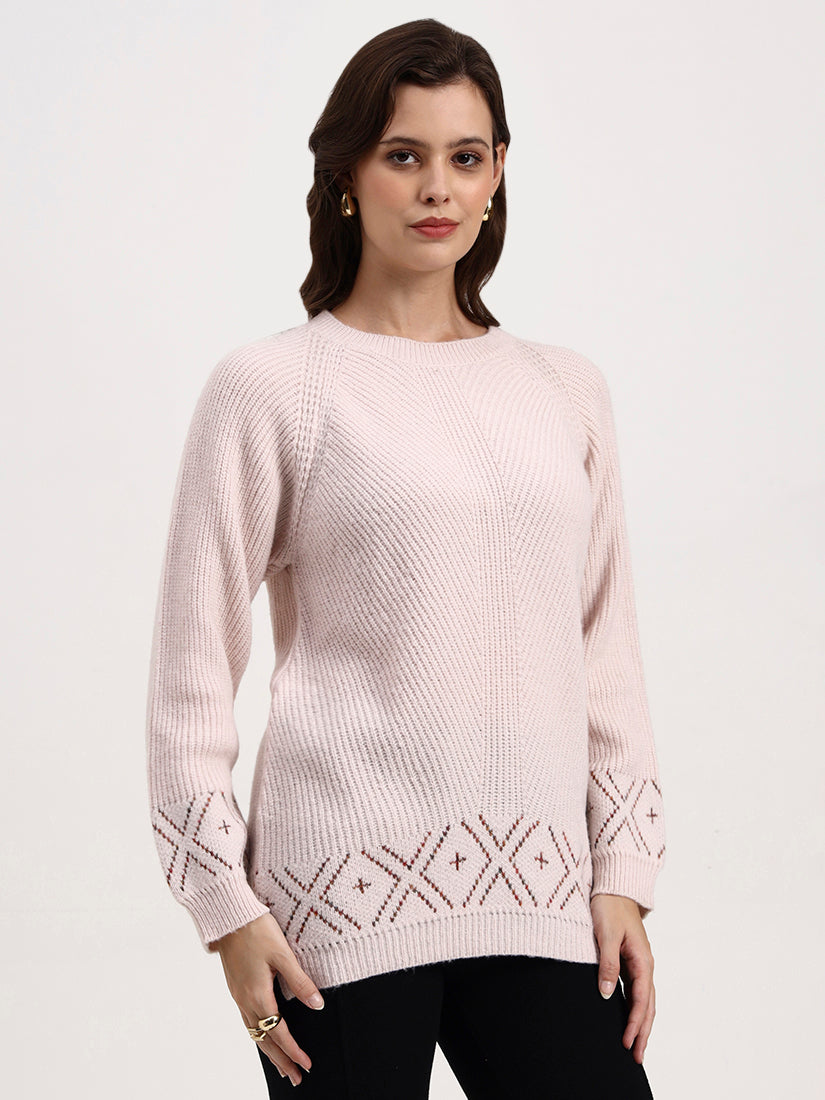 Soft rose dusk lends an air of understated romance, its gentle blush tone enriched with fine linear ribbing. Intricate cross-stitch motifs at the hem and cuffs add subtle heritage charm, balancing modern minimalism with quiet craft.