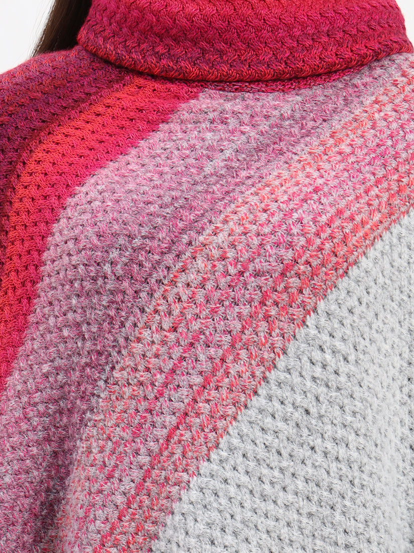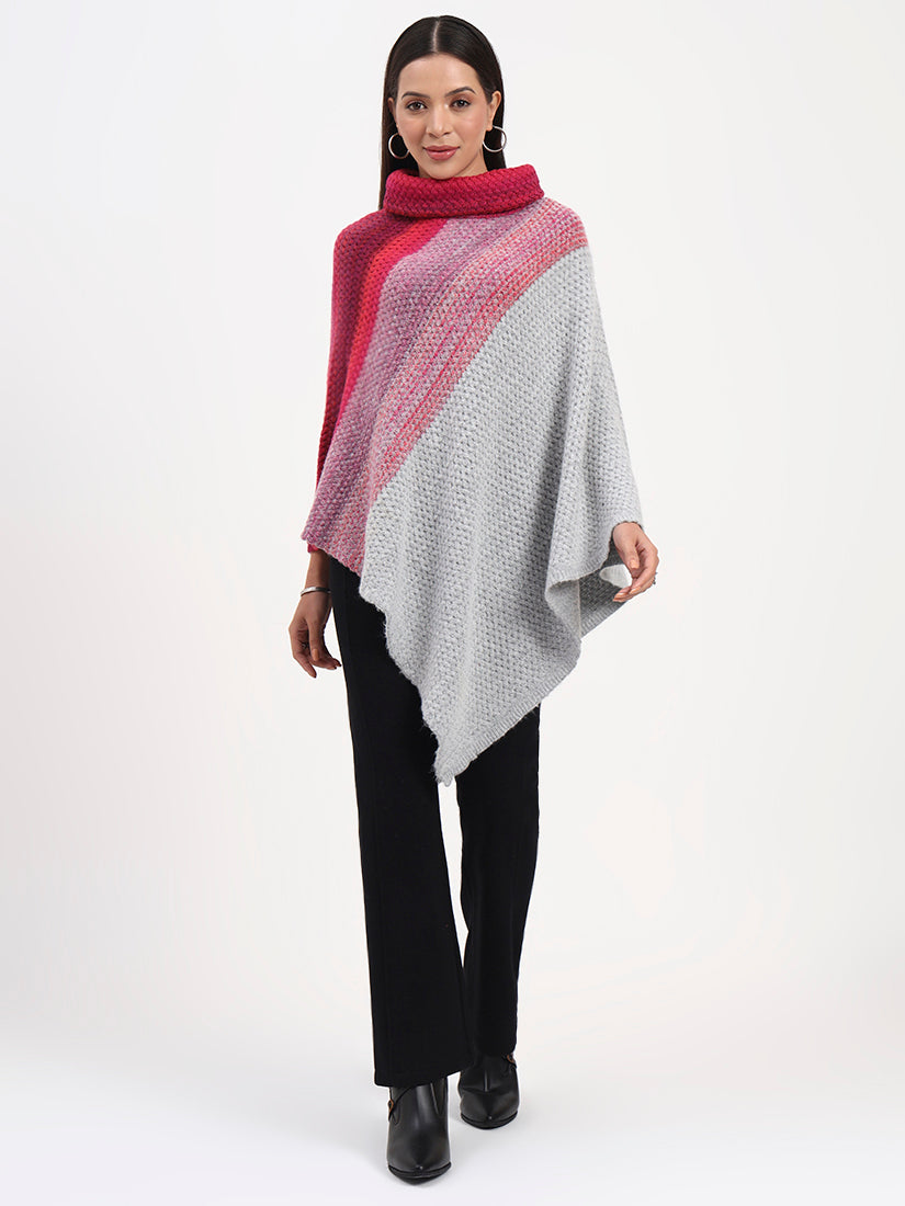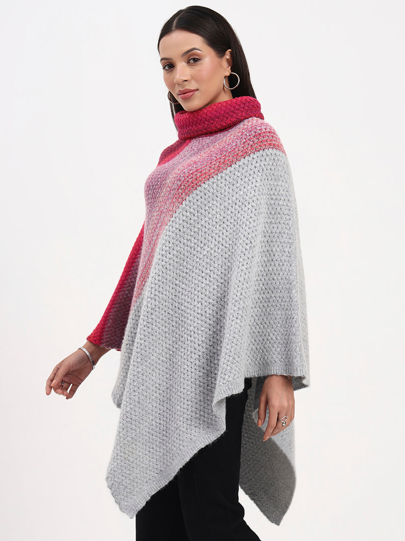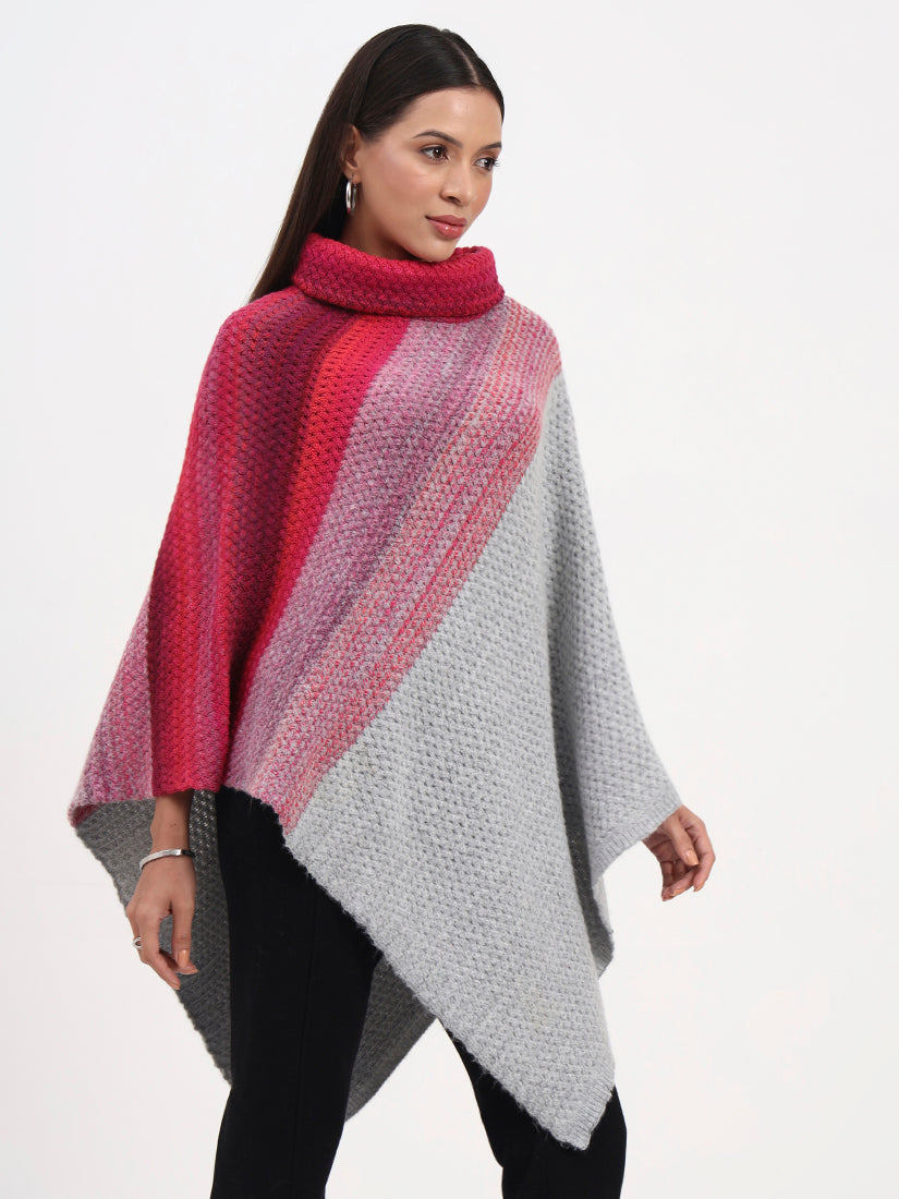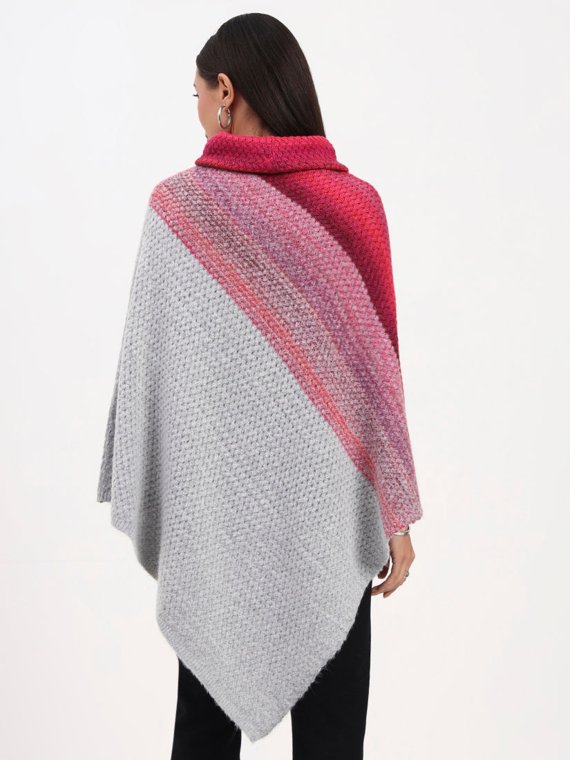 A beautifully textured poncho featuring a gentle ombre transition from rich berry tones to soft ash grey. Its plush, sculpted knit and relaxed drape create a cozy yet artistic winter layer that feels as warm as it looks striking.