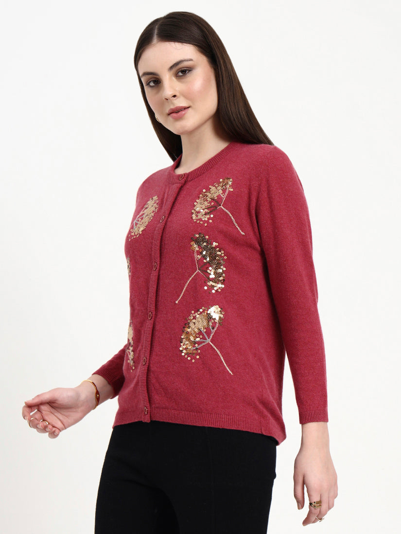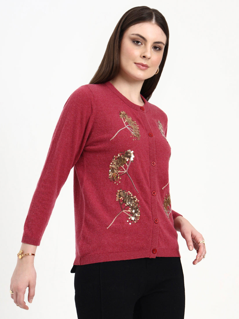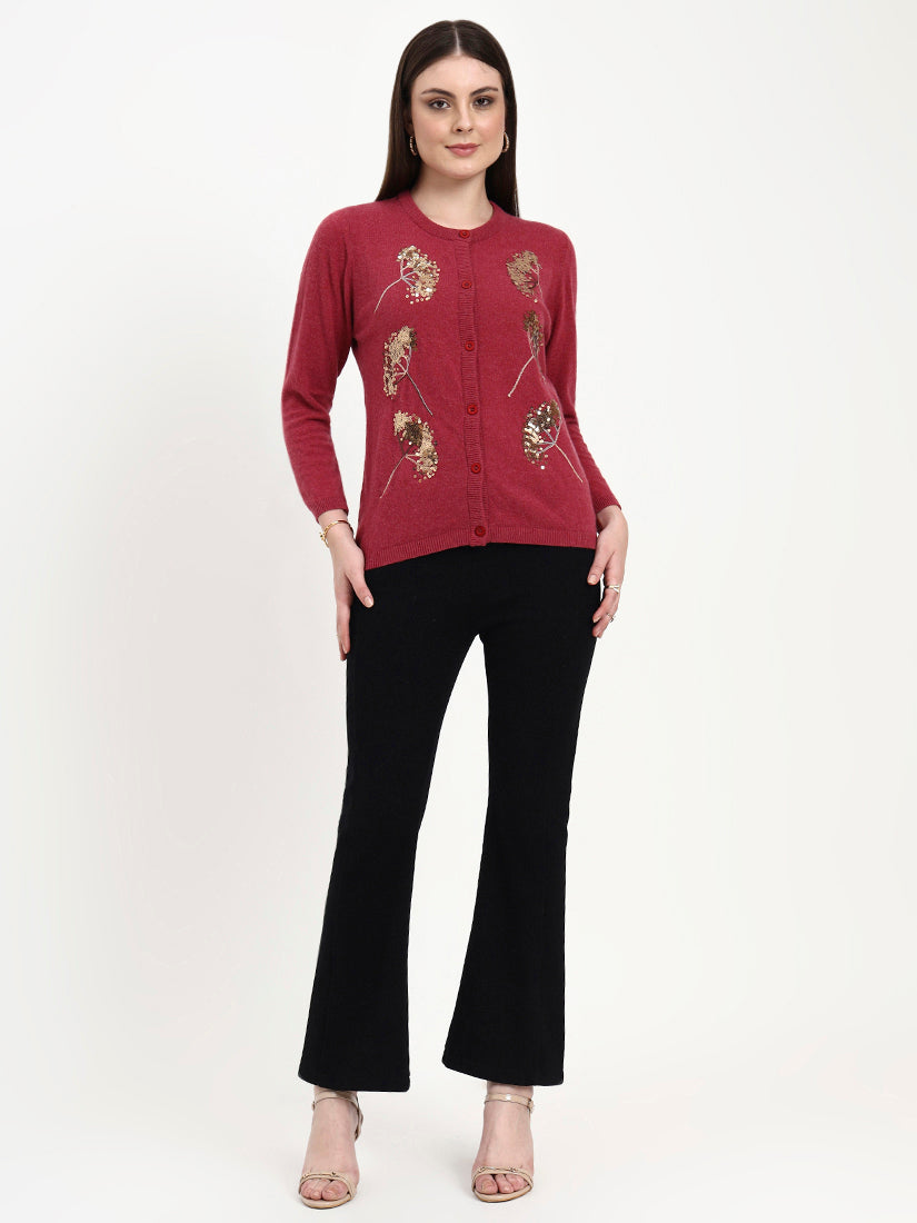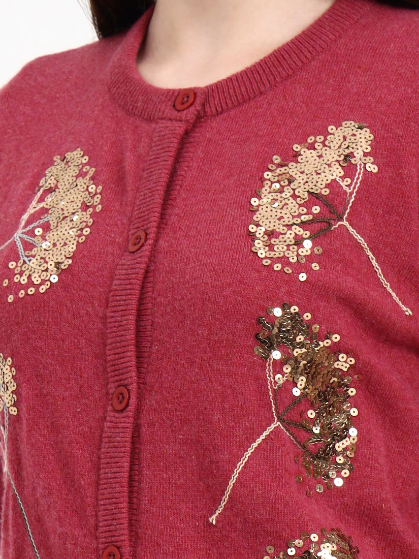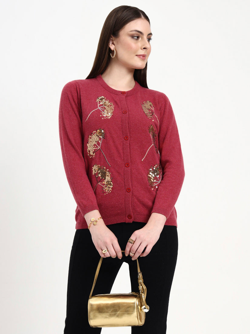 Rosewood Golden Fern Cardigan captures the charm of nature in motion, detailed with gold thread and sequins that shimmer softly with every glance. The rich red hue adds warmth and depth, making it a perfect piece for refined winter evenings.