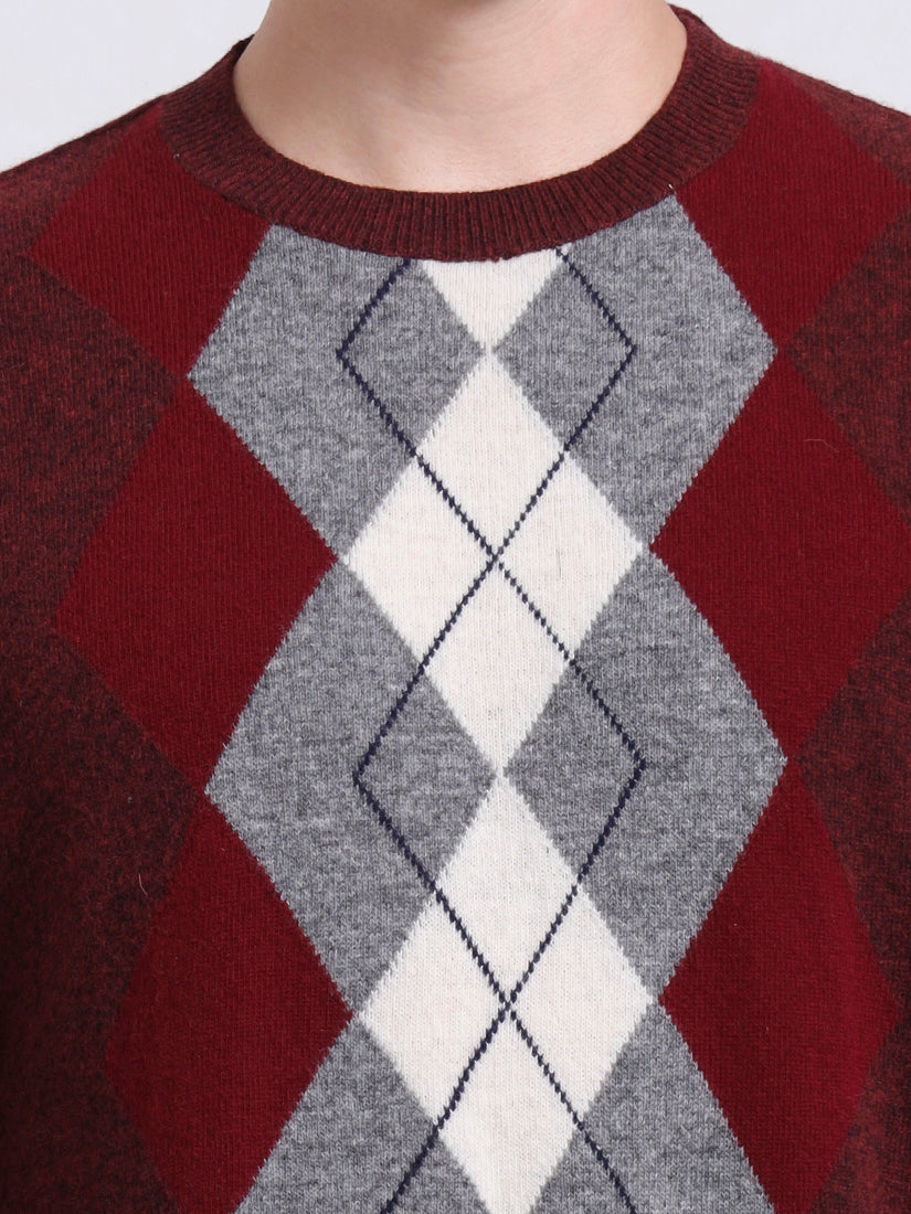 In rich rust garnet tones, this lambswool pullover revives the timeless Argyle pattern with a modern edge. The interplay of burgundy, grey, and ivory diamonds gives depth and sophistication, making it equally at home with casual denim or layered under a tailored jacket. A true expression of heritage reimagined for today.