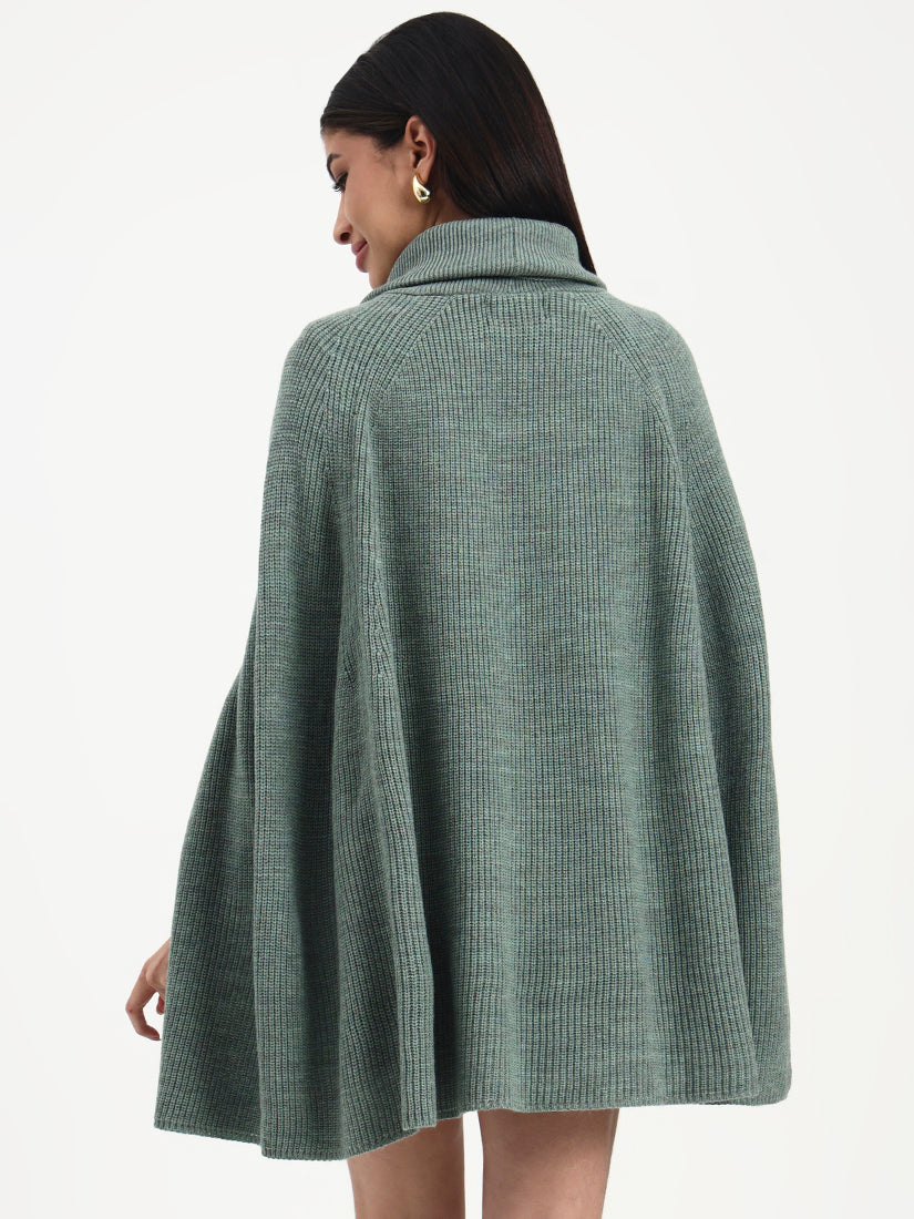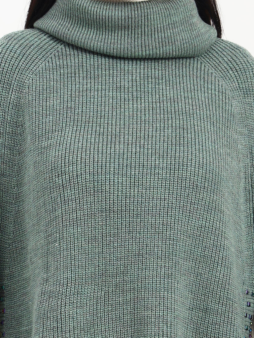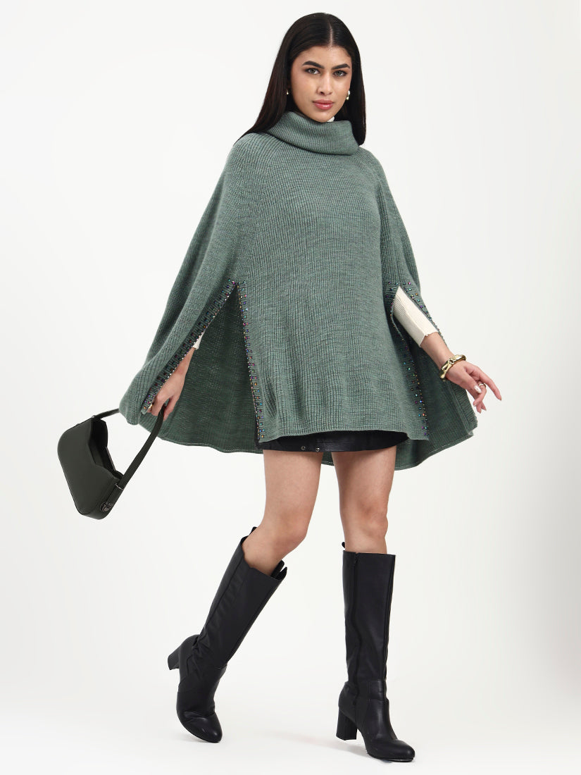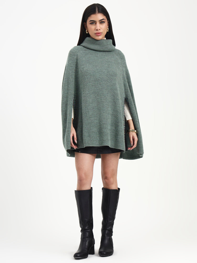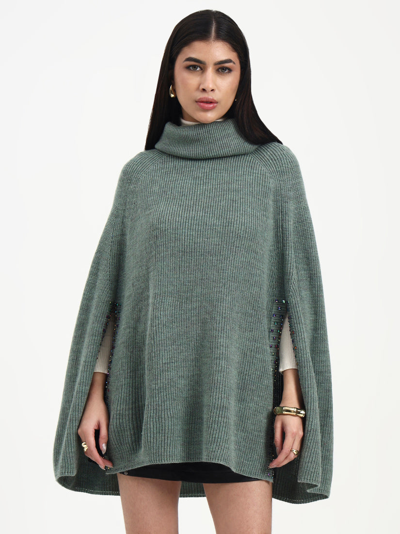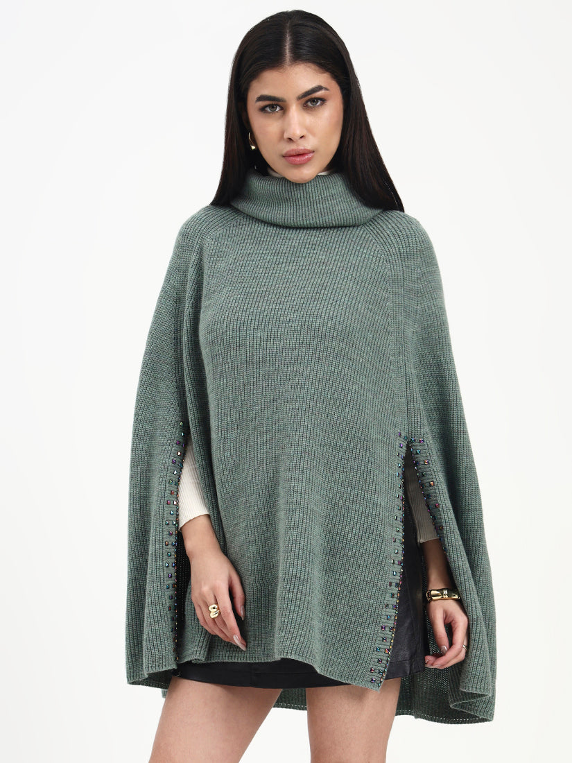 A soft sage tone paired with refined crystal accents creates a look that feels light, modern, and serene. The crystals add a graceful shimmer, enhancing the poncho’s fluid silhouette. A refined layering piece that feels calm, elevated, and timeless.