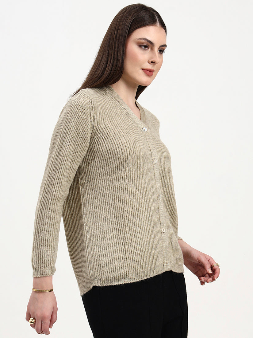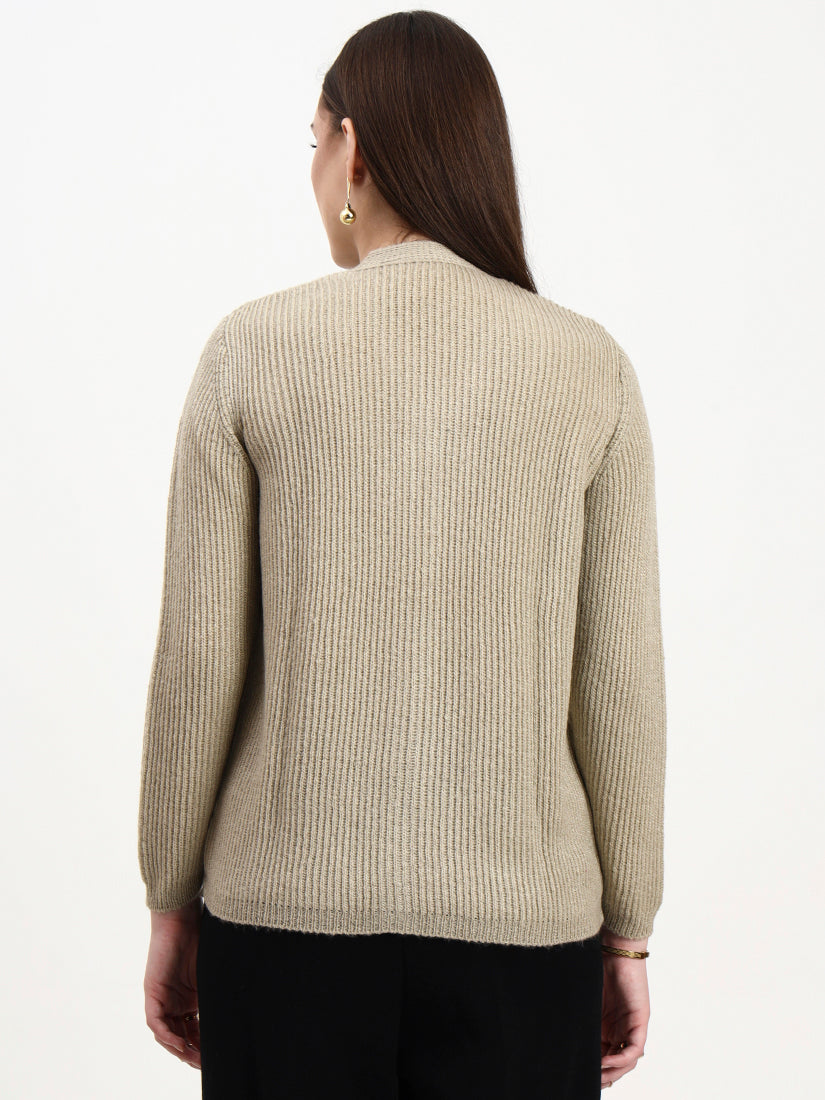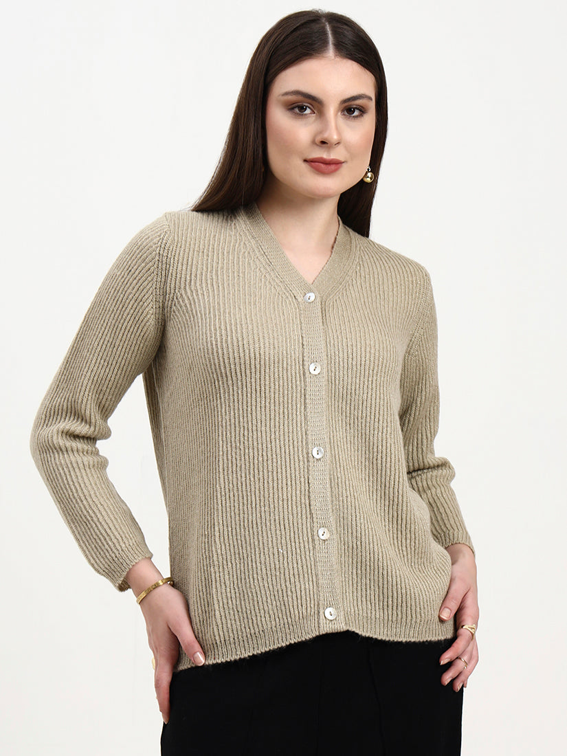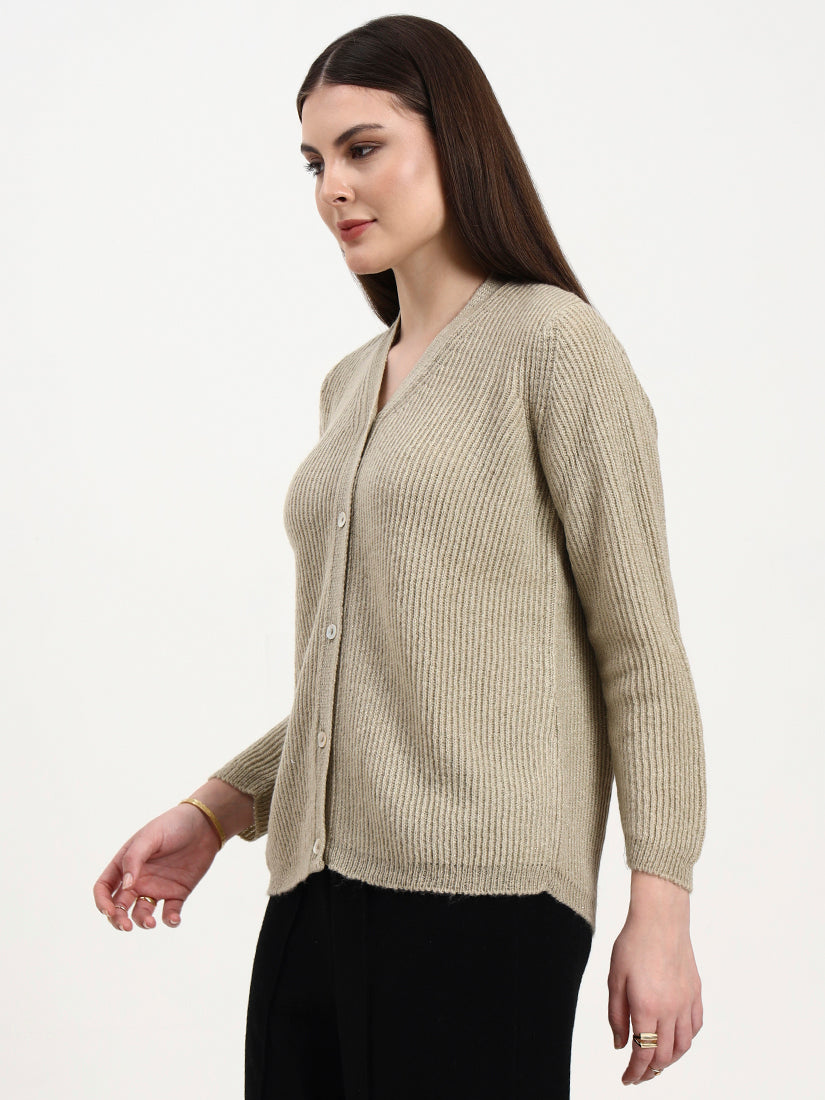 Softly ribbed and beautifully balanced, this sand beige cardigan combines warmth with simplicity. Designed for timeless layering, its natural hue and fine texture make it a wardrobe essential that transitions seamlessly from casual elegance to polished comfort.