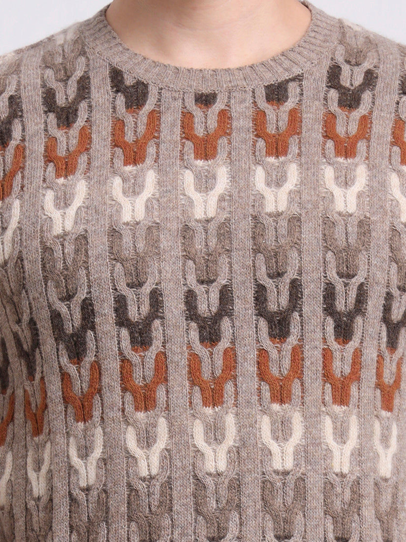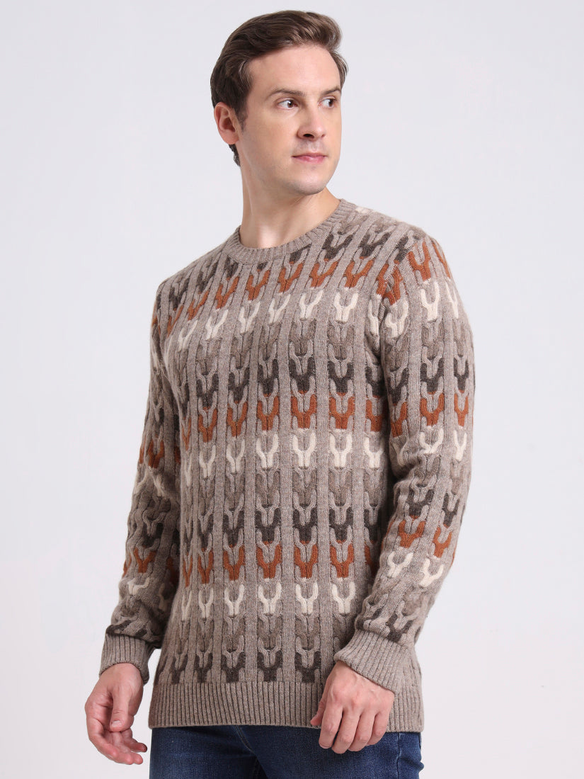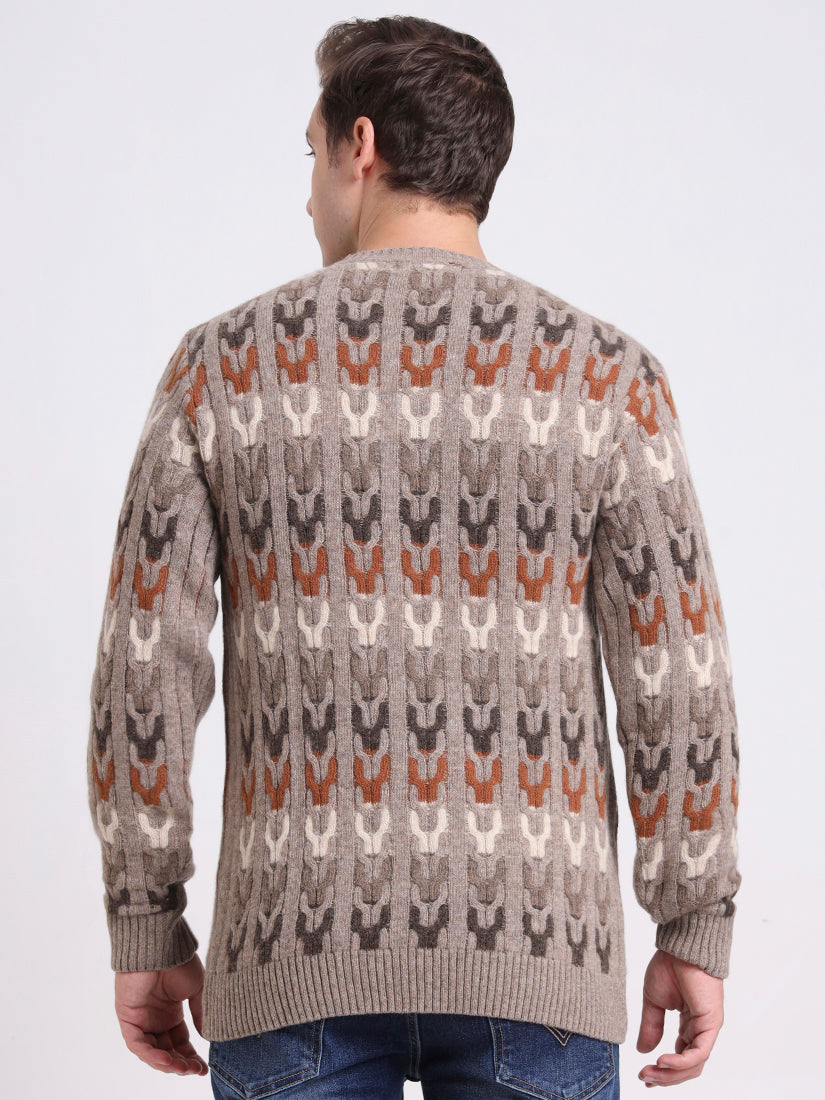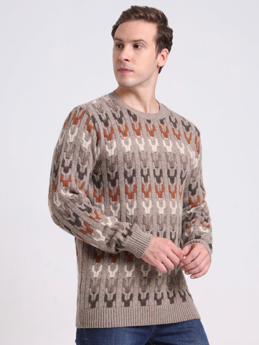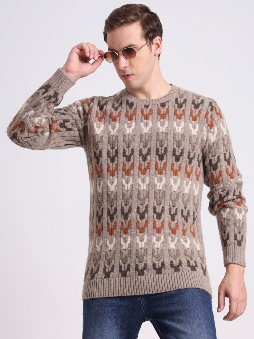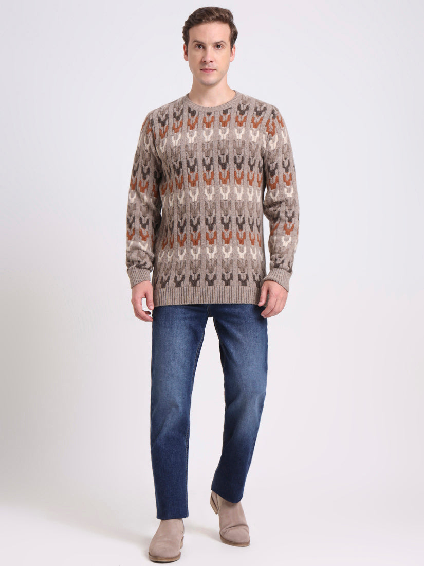 In warm sand beige with tonal contrasts, this lambswool pullover embodies relaxed refinement. The mosaic-inspired knit brings dimension and subtle artistry, while its neutral palette ensures effortless pairing. A versatile layer that elevates both laid-back and polished ensembles.