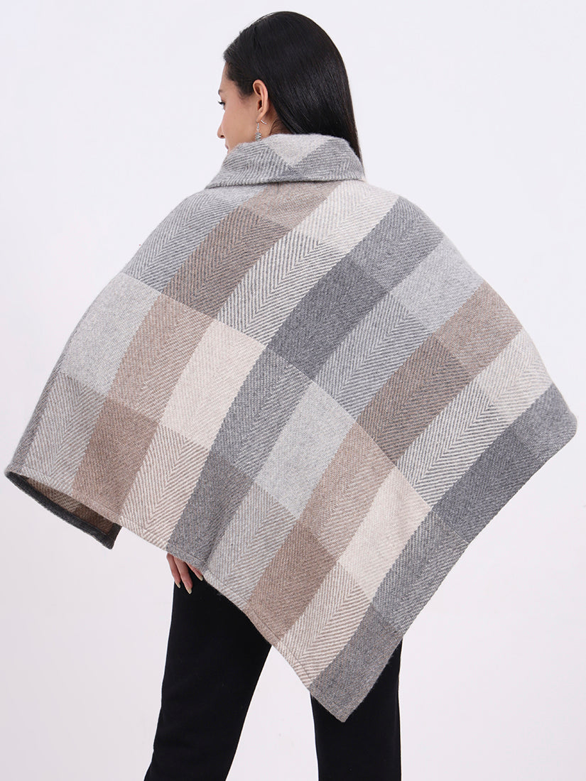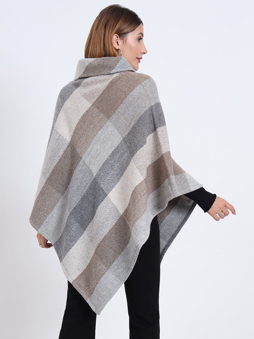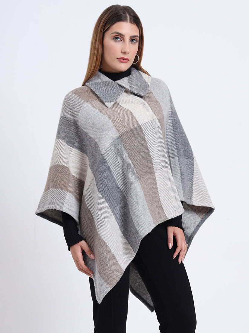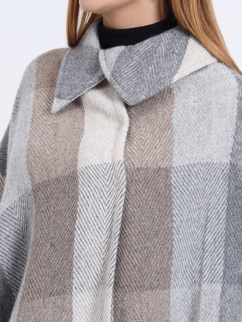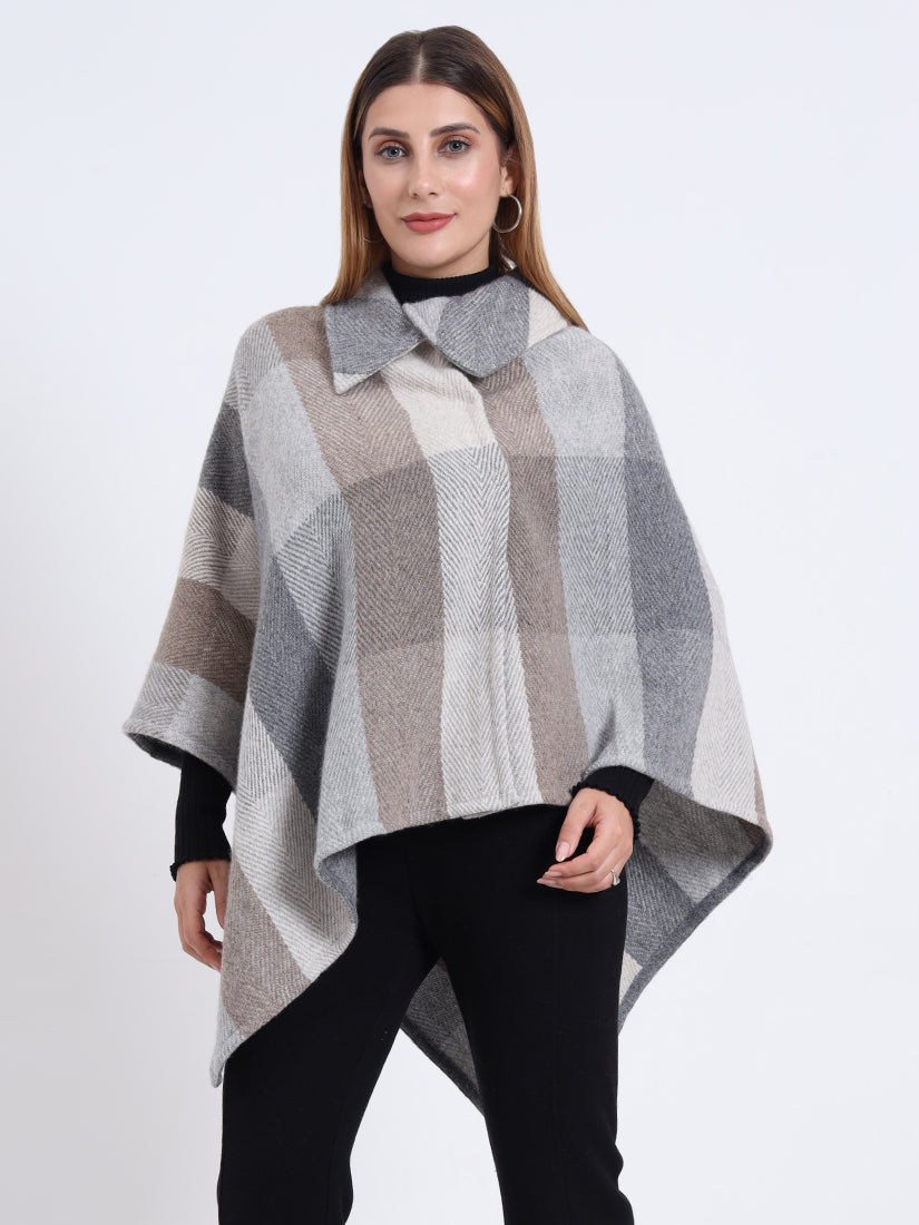 The Sandstone Check Poncho combines a classic check pattern in soft beige and neutral tones with a refined collar detail. Its structured yet fluid drape captures timeless elegance with a modern twist.