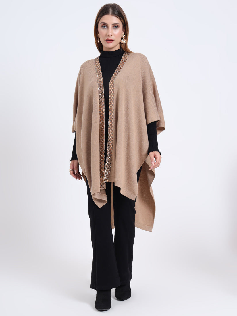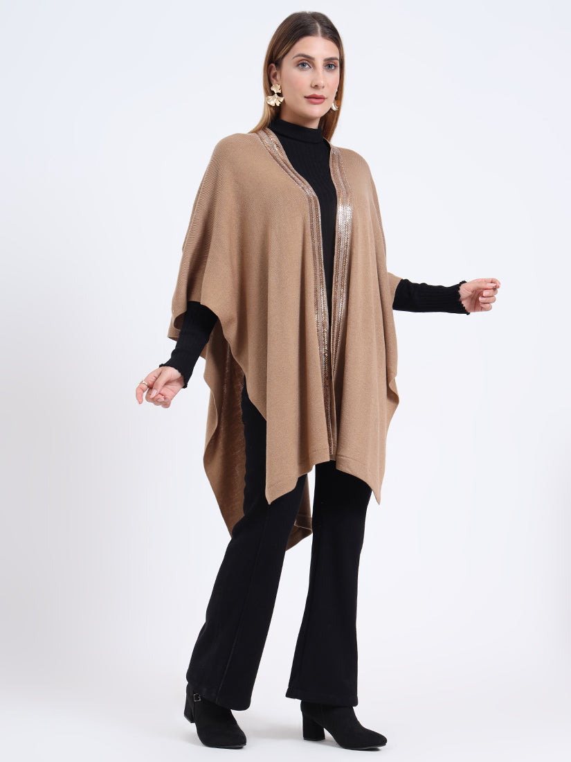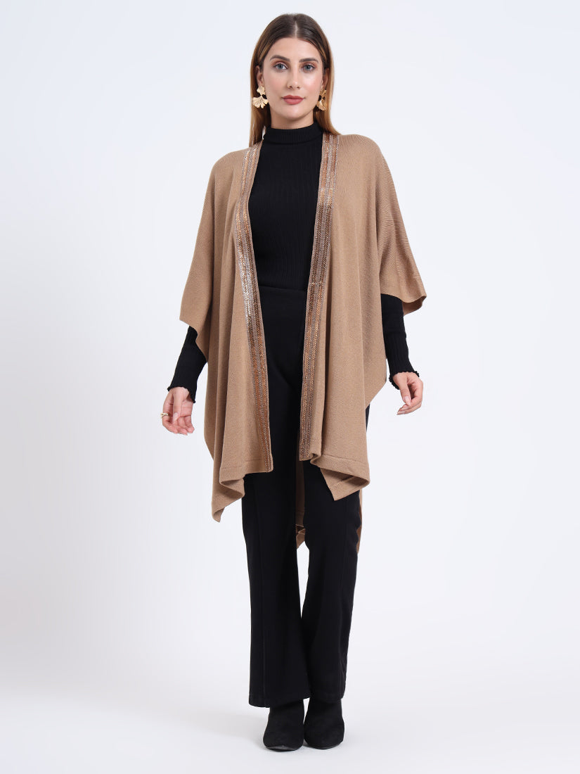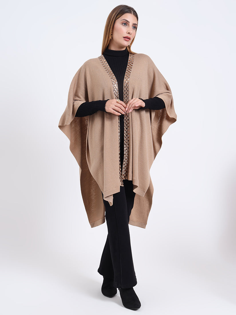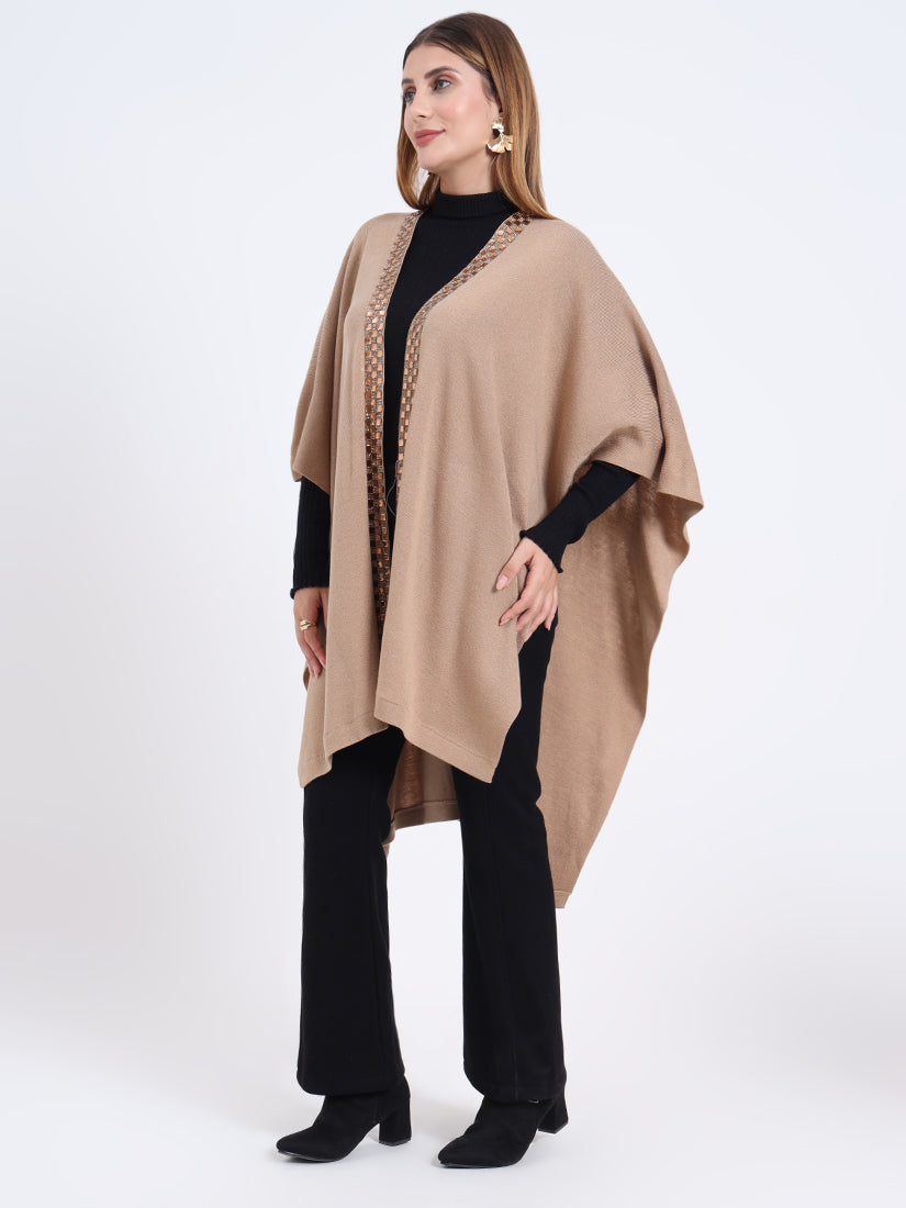 Inspired by earthy warmth, the Sandstone Gleam Cape in rich wool blends carries natural fawn tones elevated with metallic accents. A piece that grounds elegance with modern sophistication.