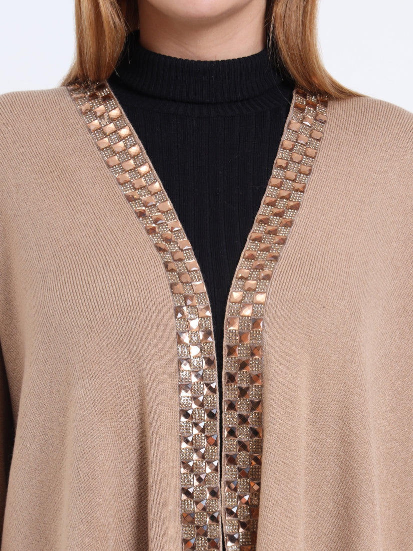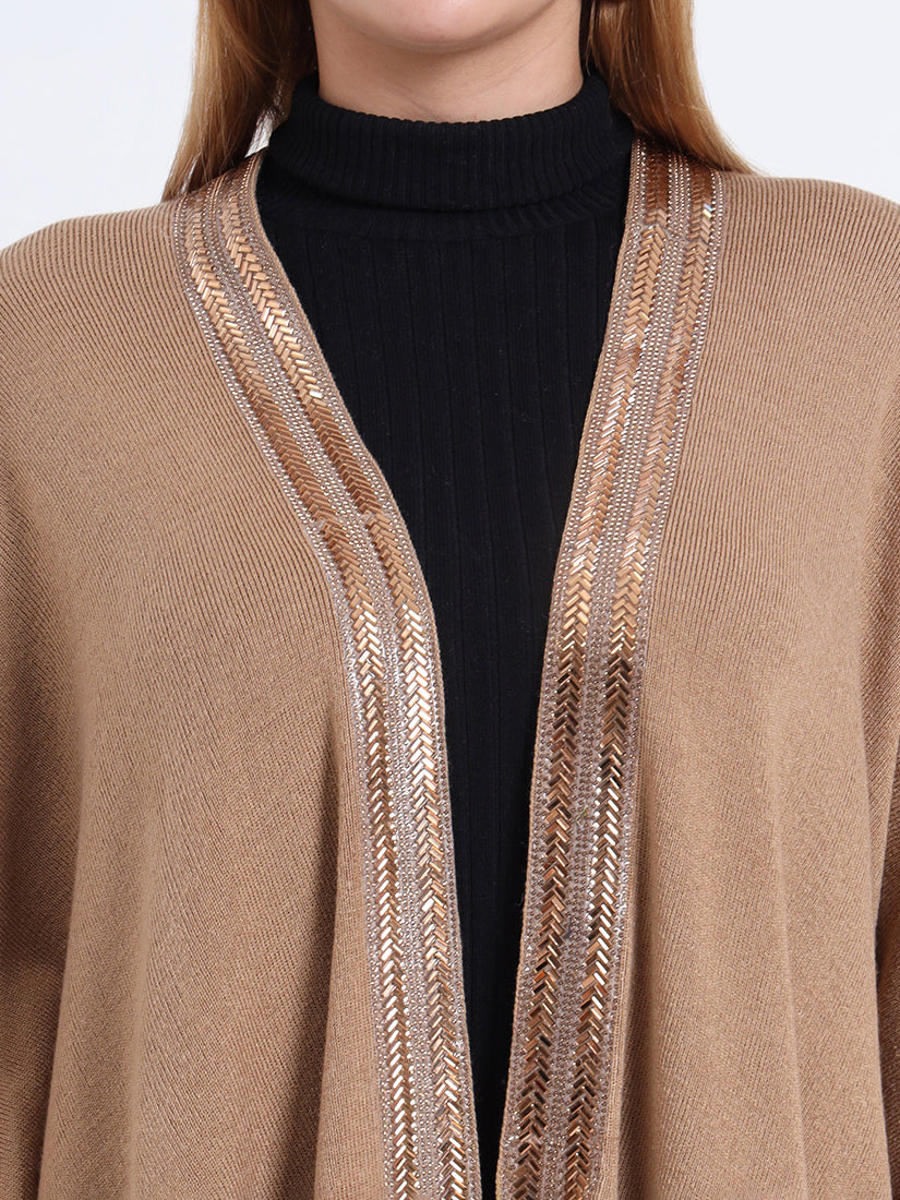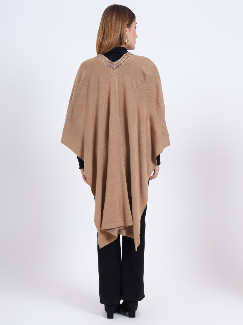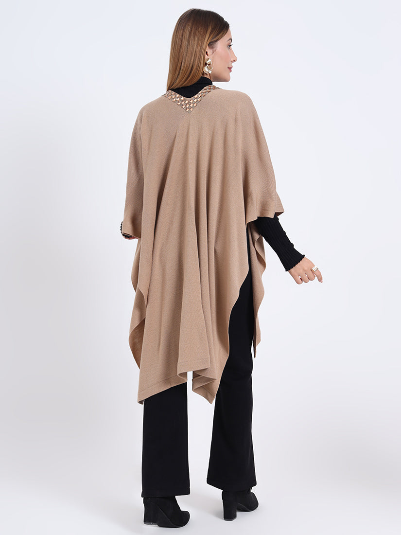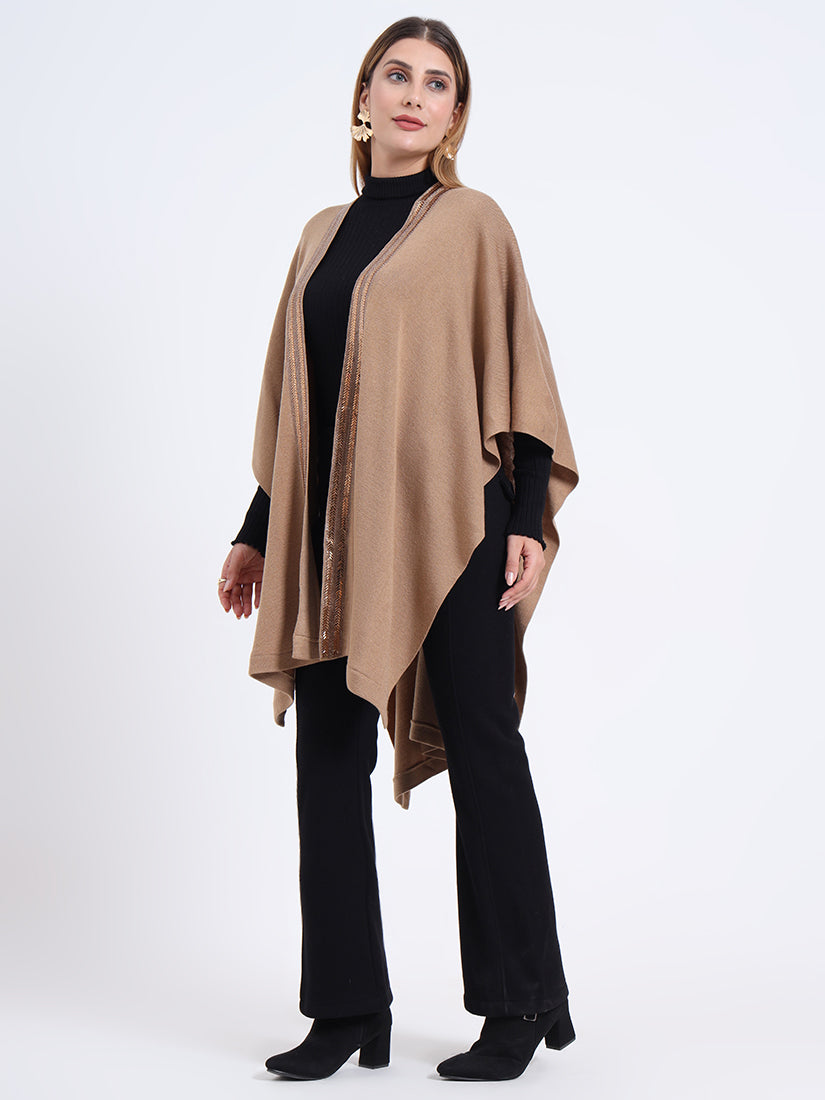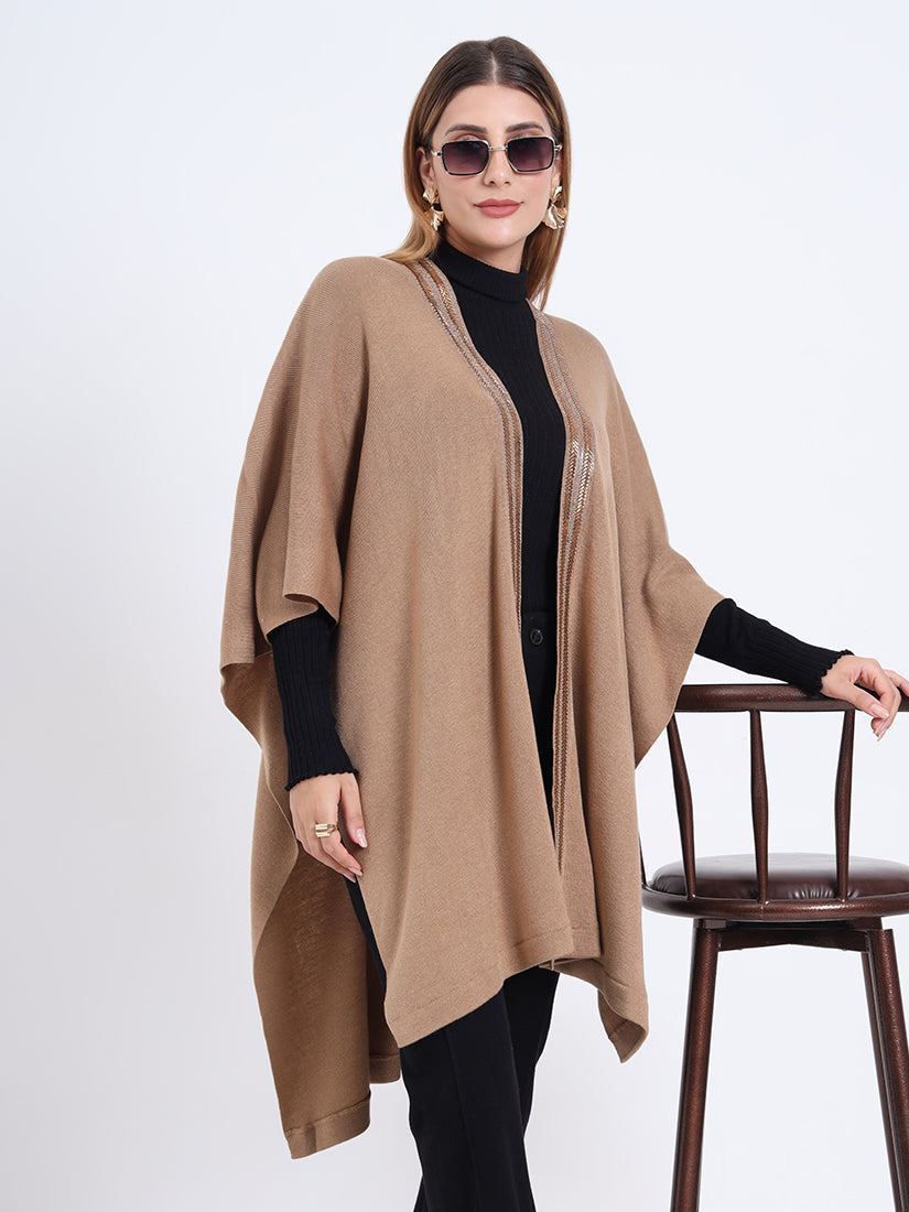 Inspired by earthy warmth, the Sandstone Gleam Cape in rich wool blends carries natural fawn tones elevated with metallic accents. A piece that grounds elegance with modern sophistication.