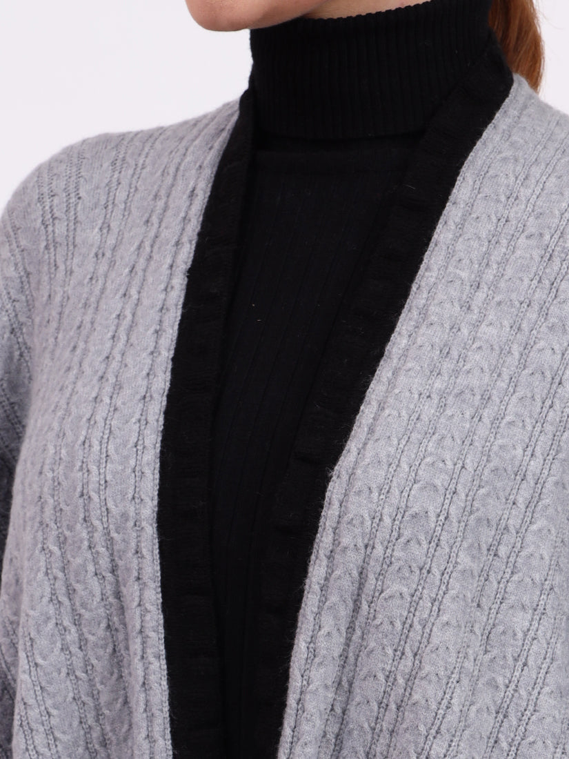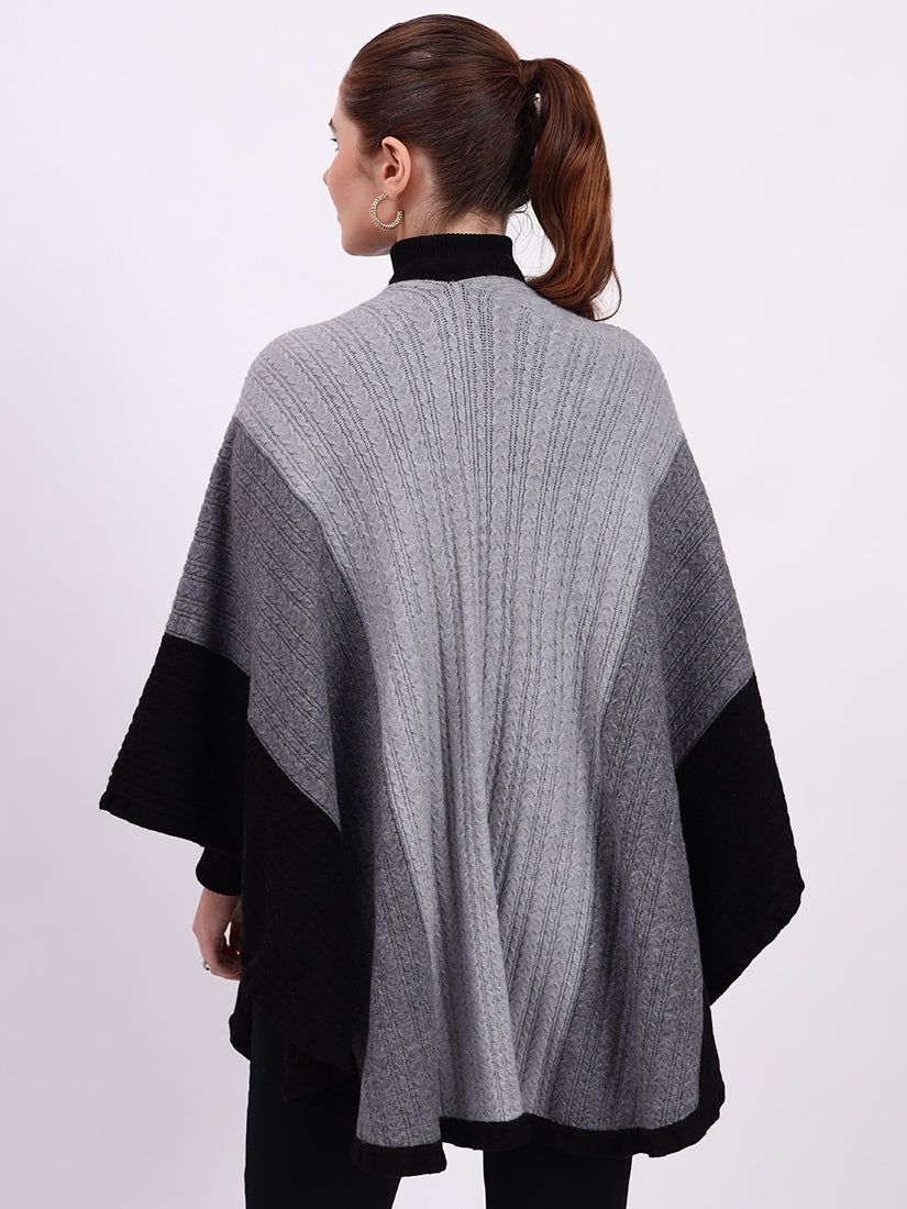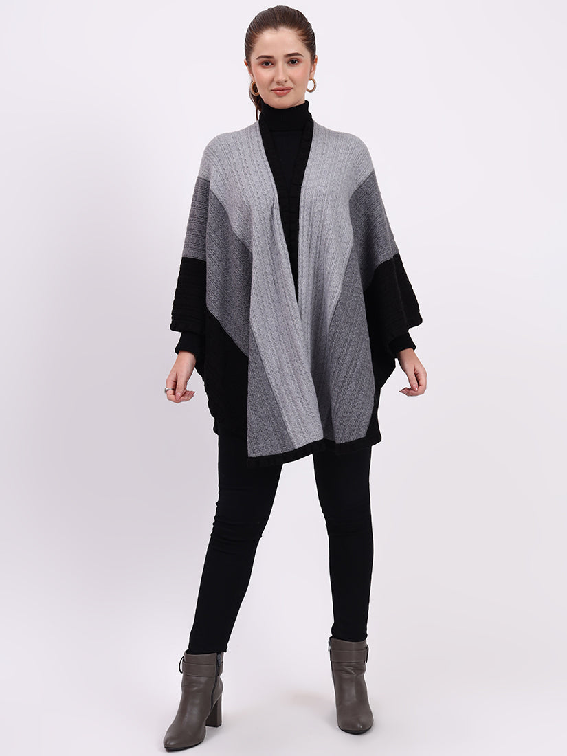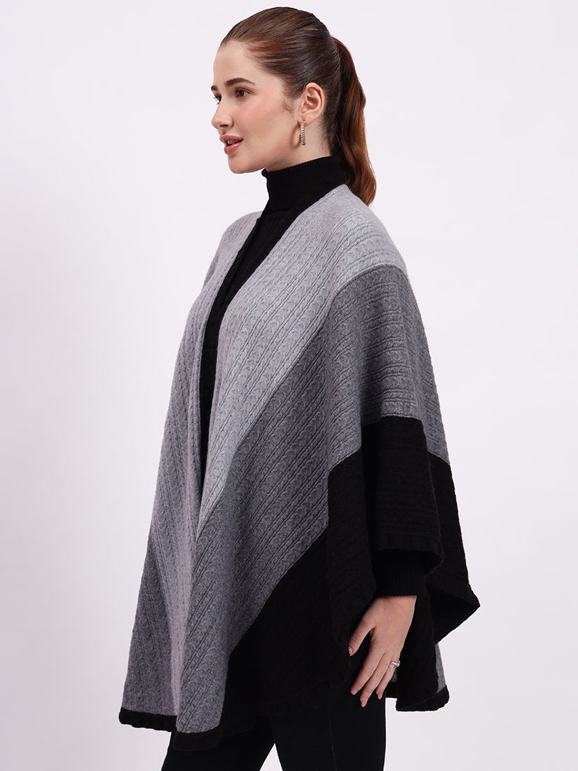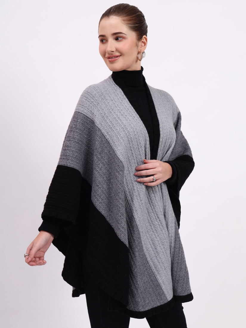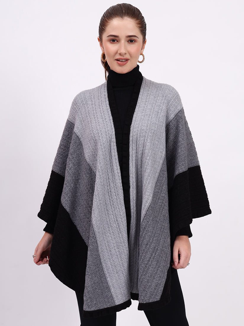 The Shadow Mosaic Cape blends shades of black and grey into a geometric flow, creating a refined visual rhythm. Its contemporary patterning is balanced by a soft drape, offering both warmth and a bold style statement.