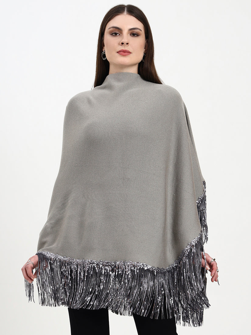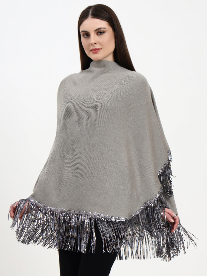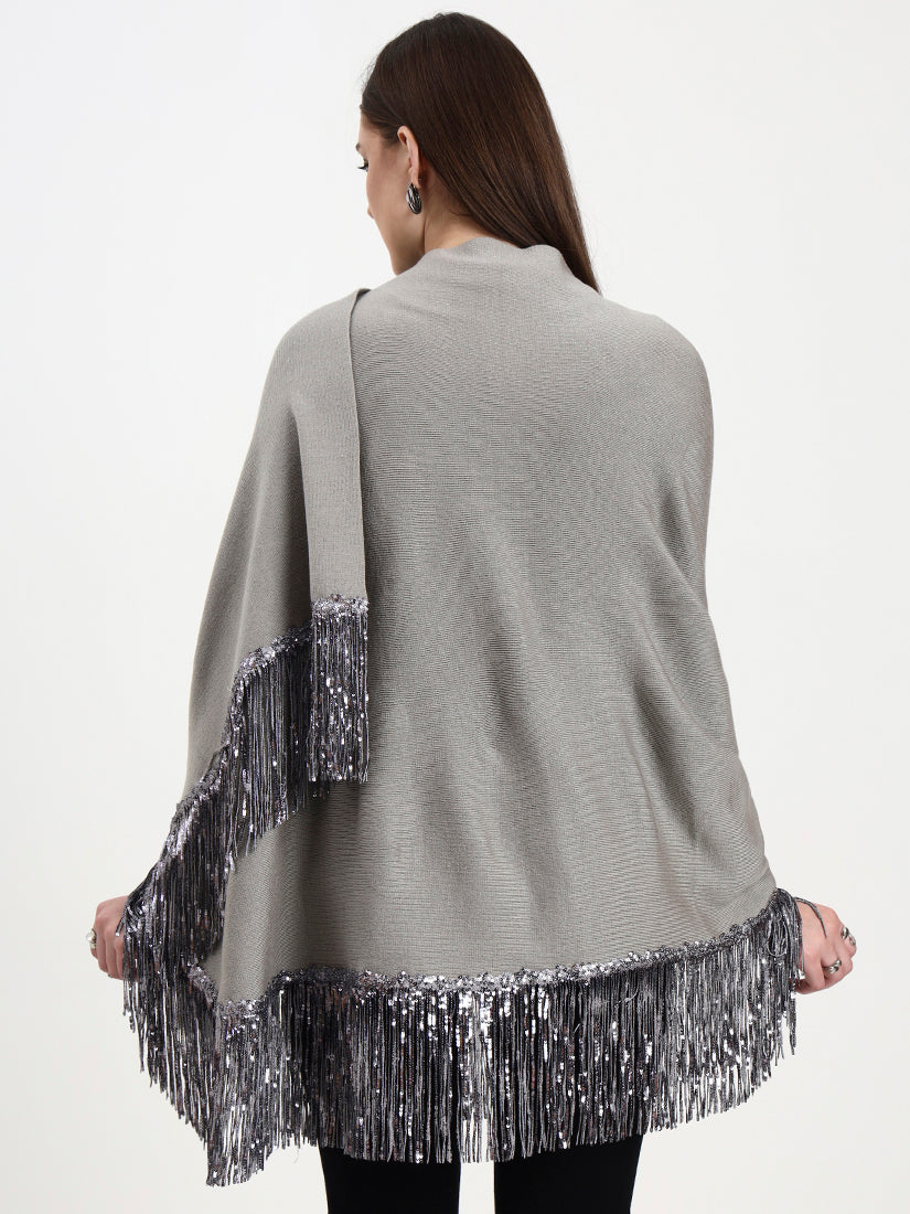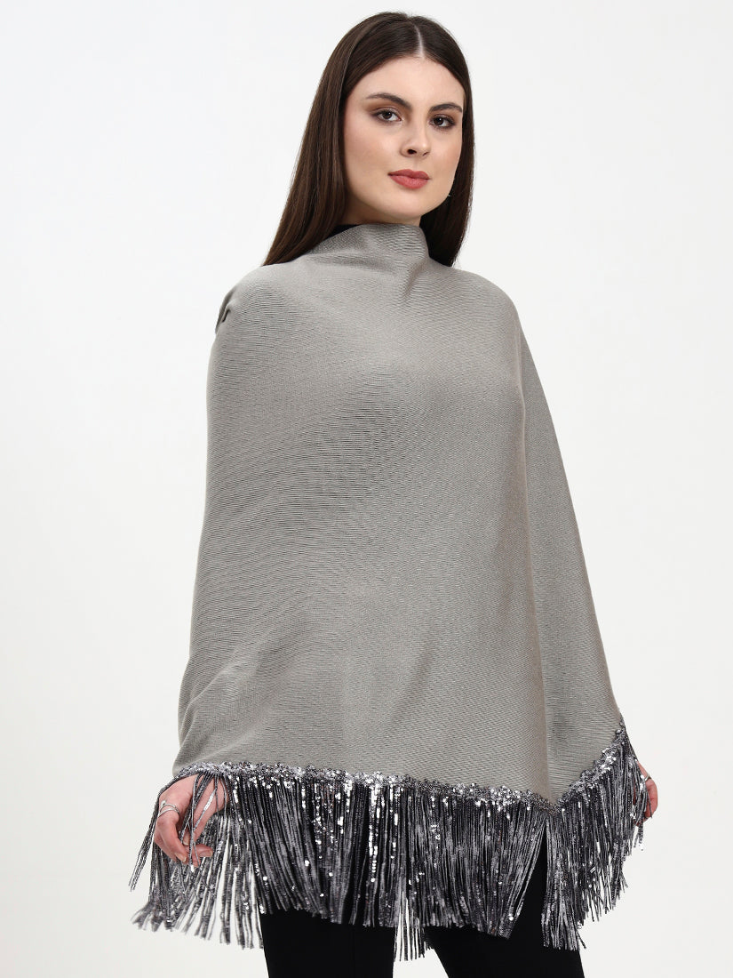 Soft heather-grey wool with silver-sequin fringes reminiscent of winter mist over a Highland valley. The neutral tone pairs effortlessly with both monochrome and jewel palettes, lending an ethereal, contemporary grace.