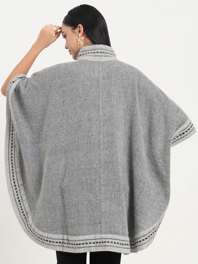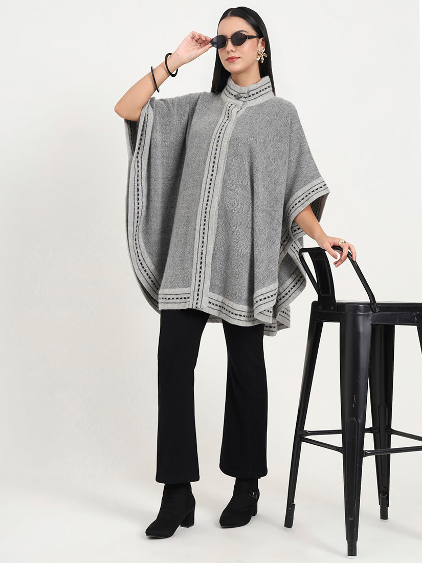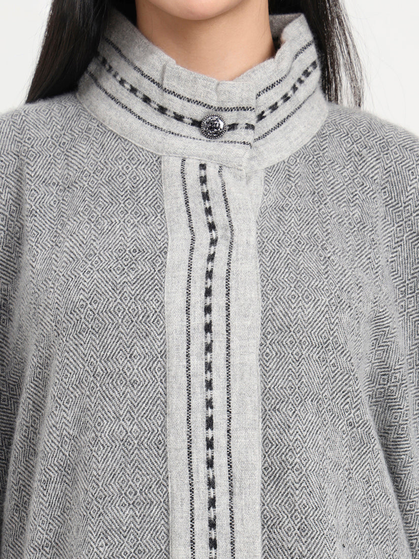 A sophisticated grey canvas defined by a delicate lattice weave, enriched with sleek black borders for a subtle contrast. The high neckline, secured with a single button, adds a structured elegance, making it a versatile layer that transitions seamlessly from daywear to evening refinement.