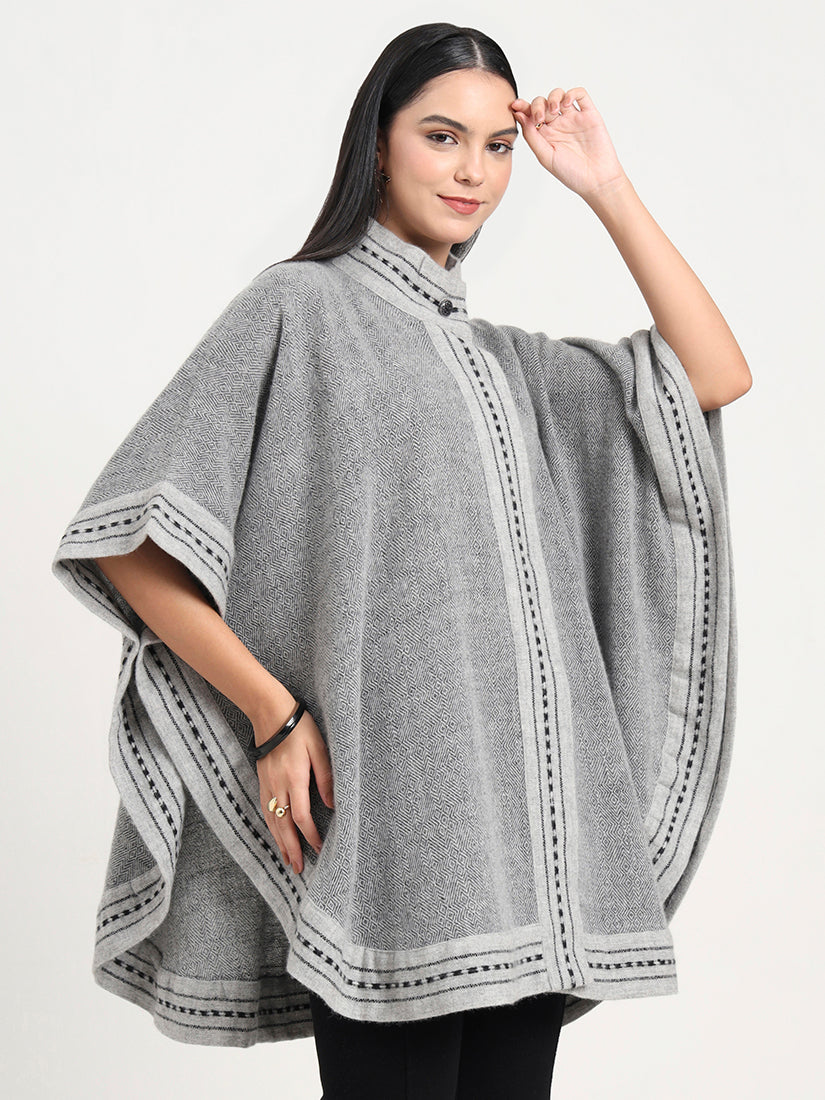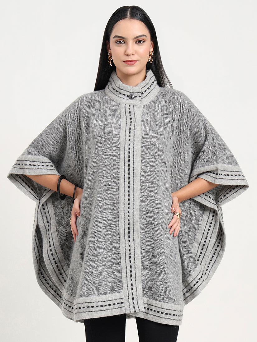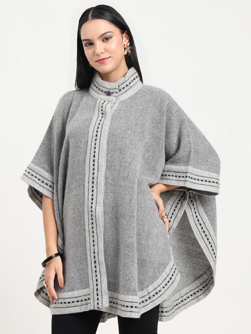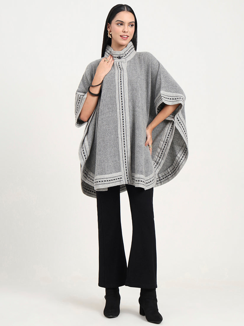 A sophisticated grey canvas defined by a delicate lattice weave, enriched with sleek black borders for a subtle contrast. The high neckline, secured with a single button, adds a structured elegance, making it a versatile layer that transitions seamlessly from daywear to evening refinement.