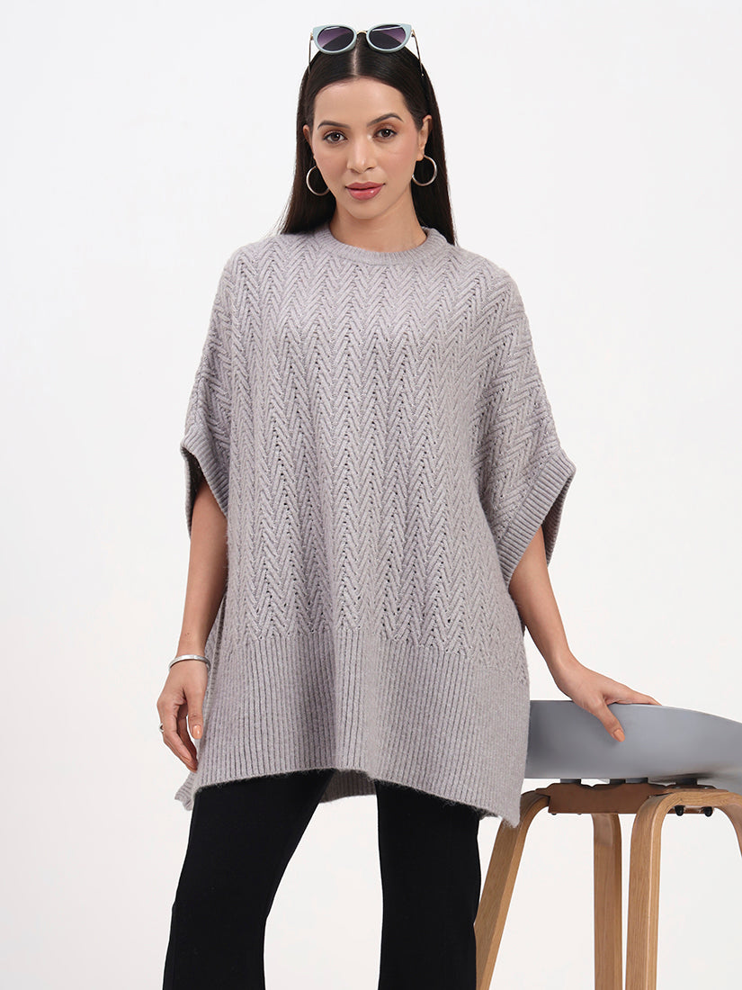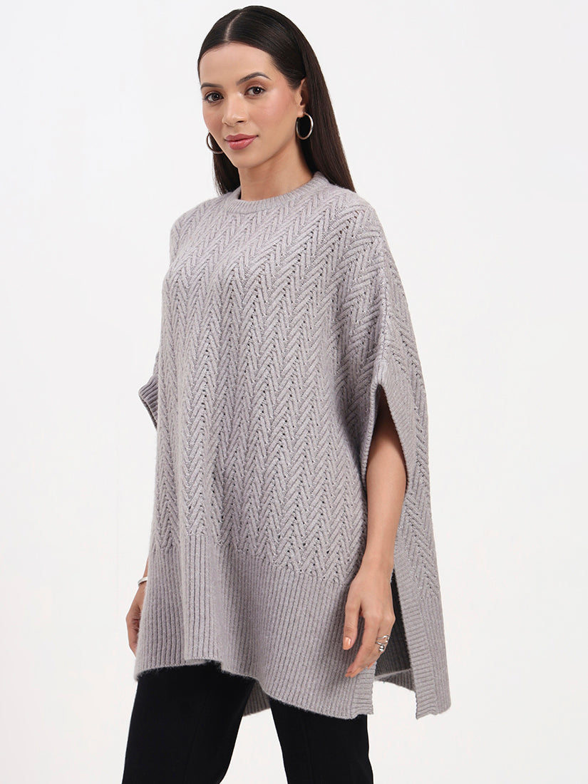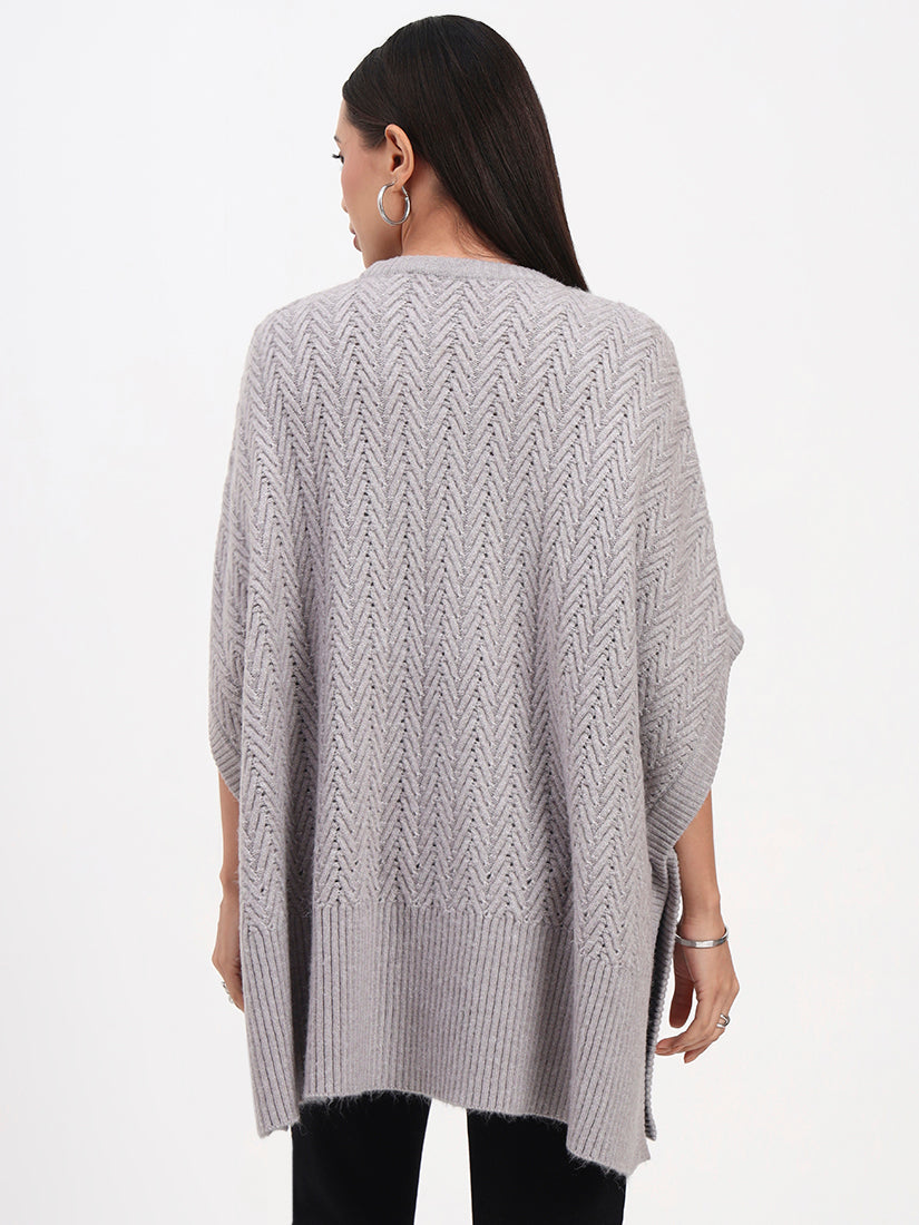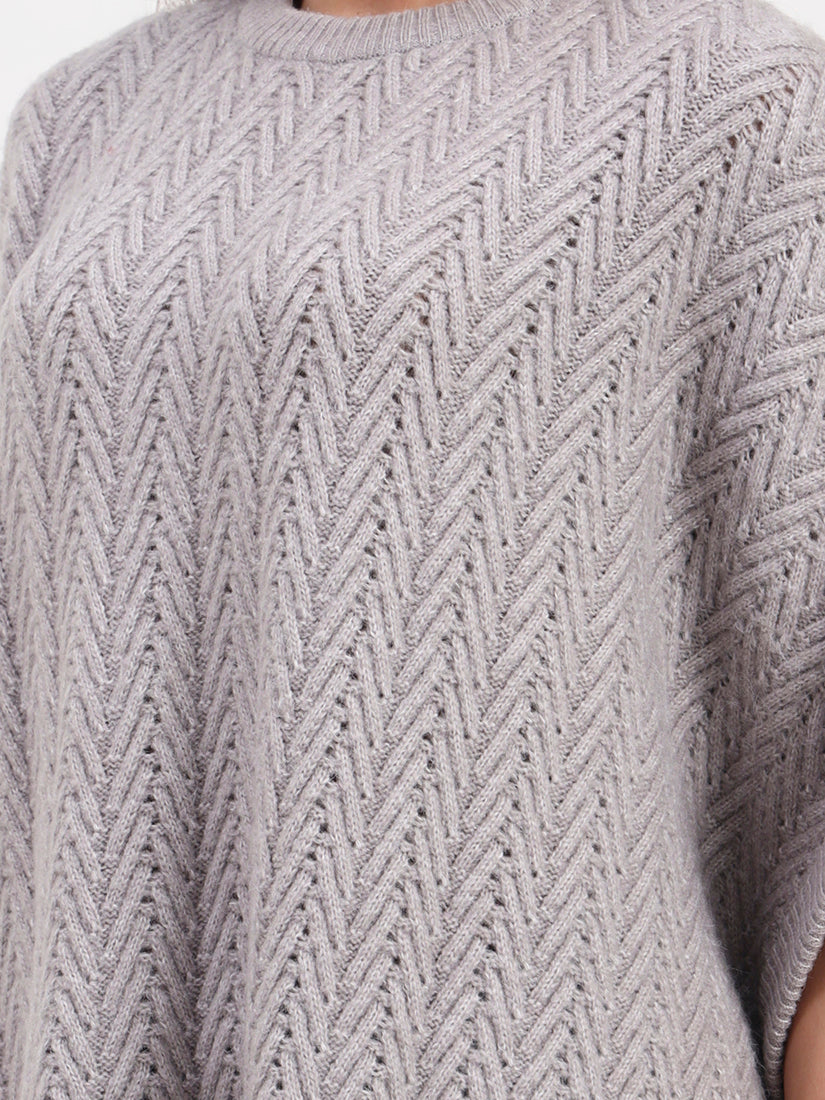 Crafted in a calming silver-grey tone, this cape showcases an intricate chevron knit that adds refined depth and texture to its silhouette. Designed to drape effortlessly with a soft ribbed hem, it offers an elevated winter layer that feels both cozy and timeless.