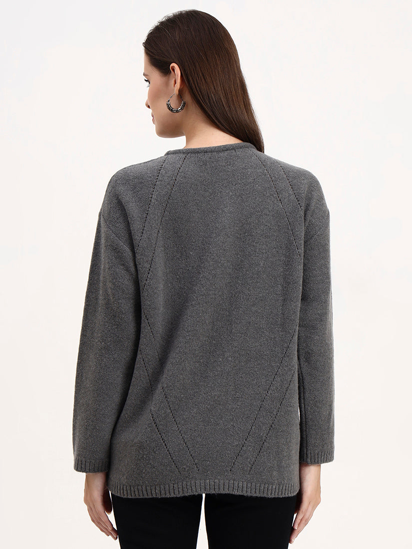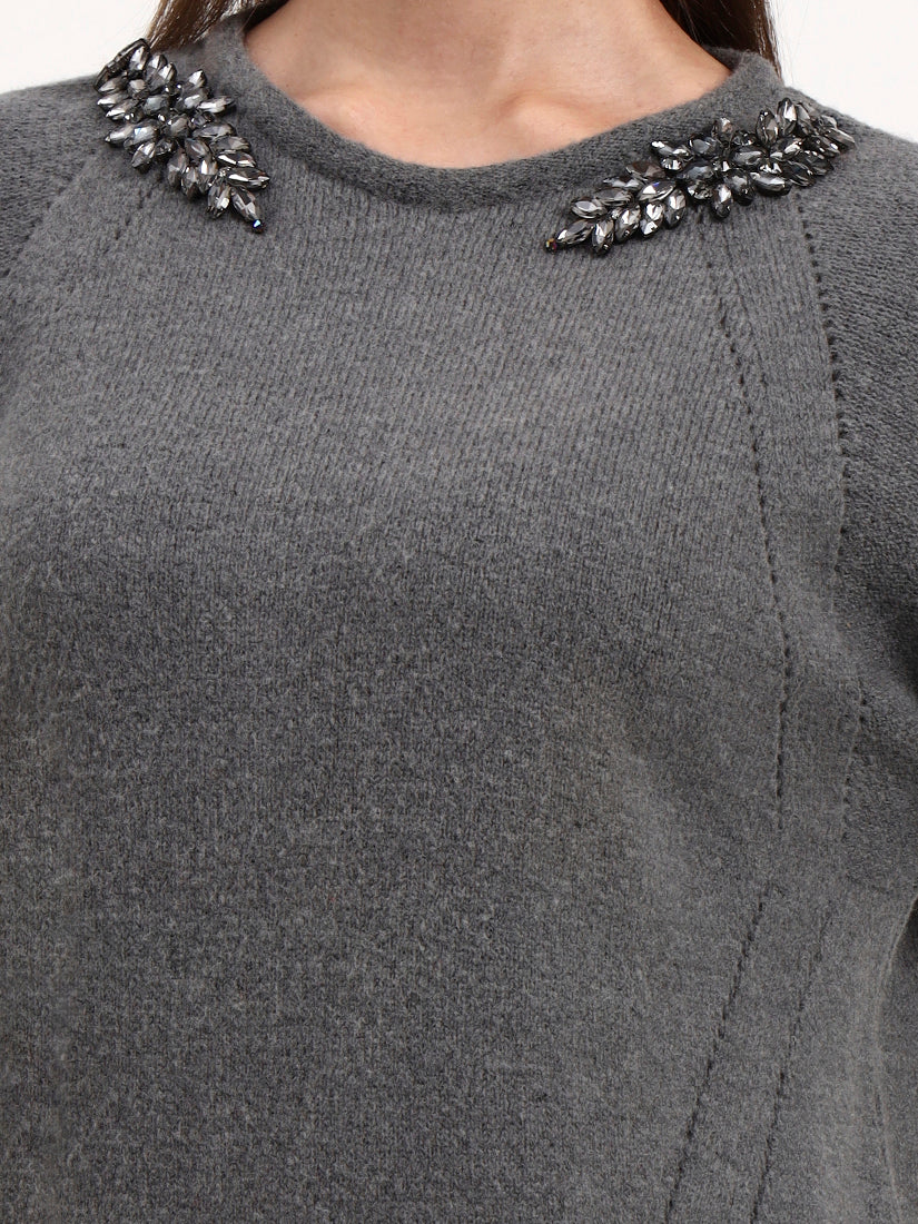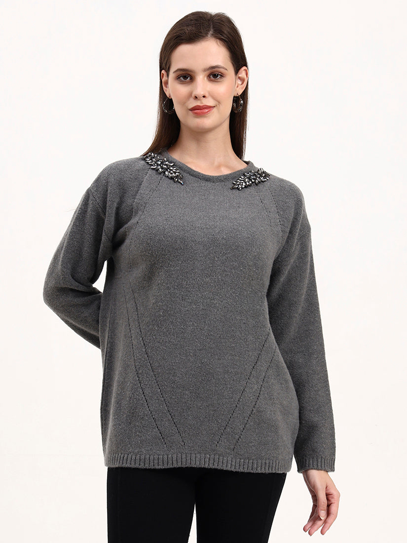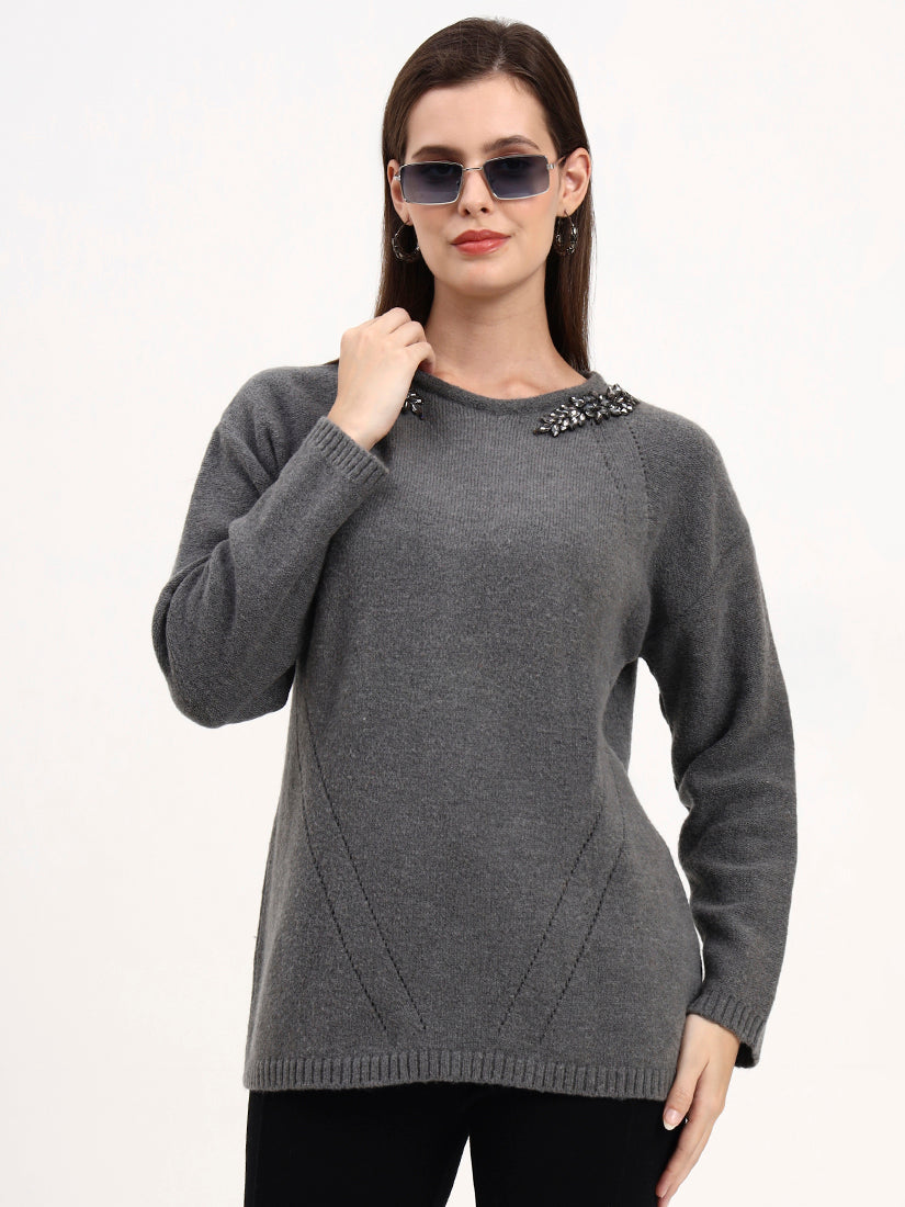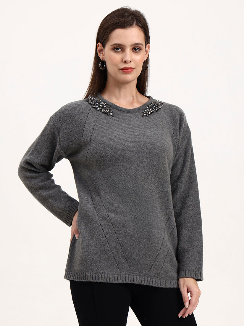 In a moody charcoal-grey palette, this piece brings subtle glamour through refined gemstone accents. Perfect for elevated layering, its quiet brilliance makes it ideal for evening refinement or winter-day polishing.