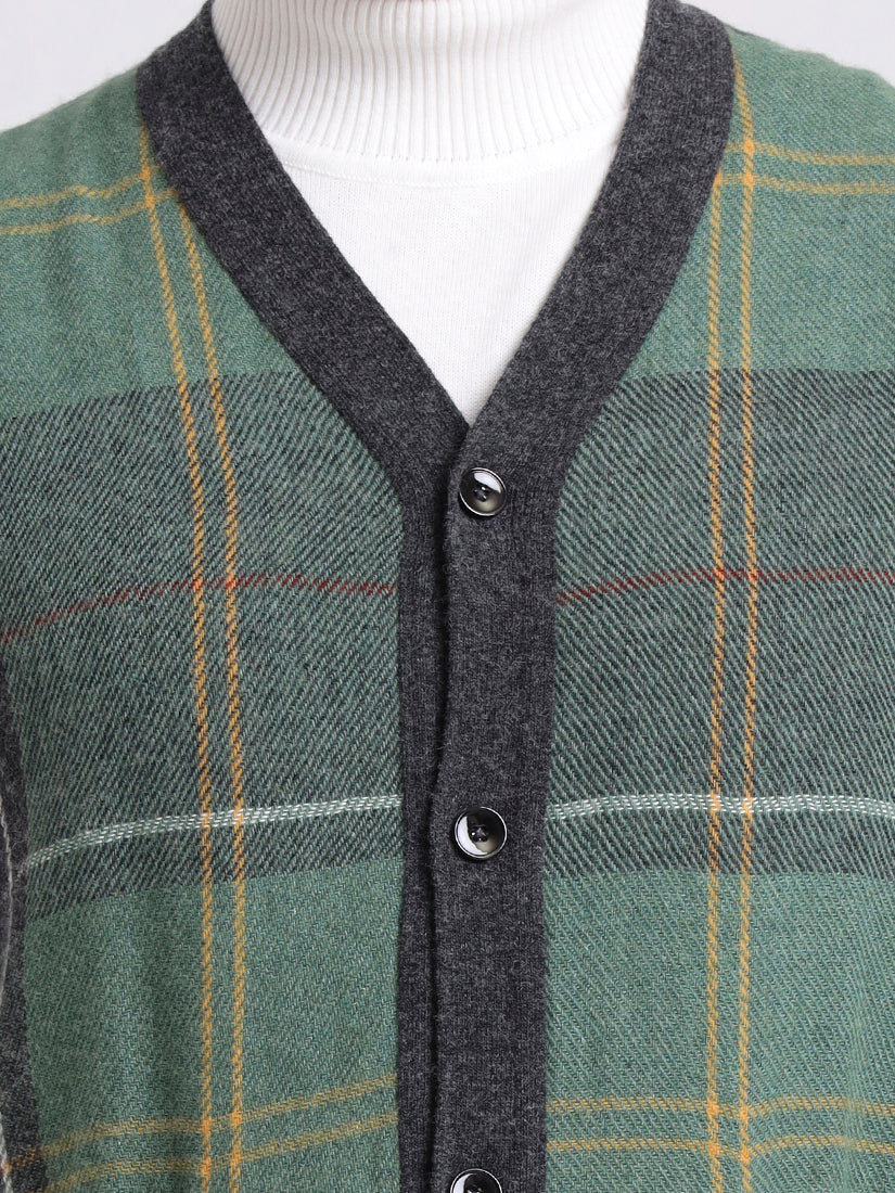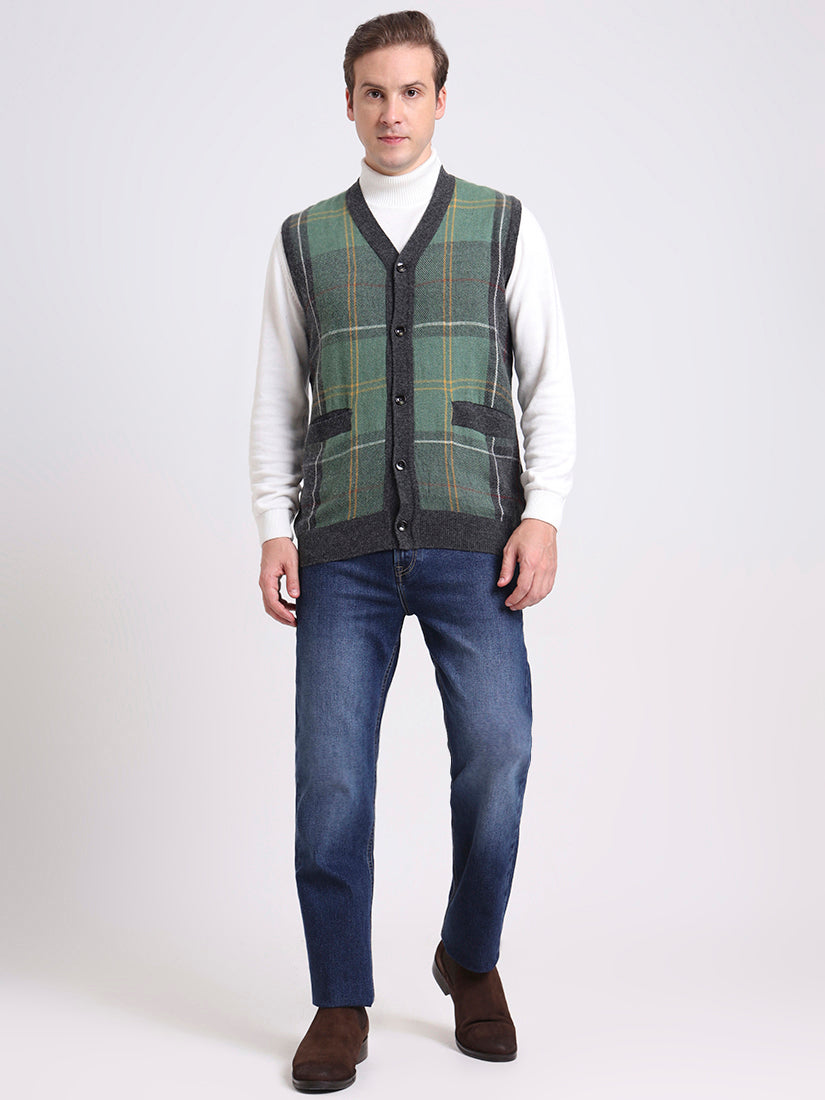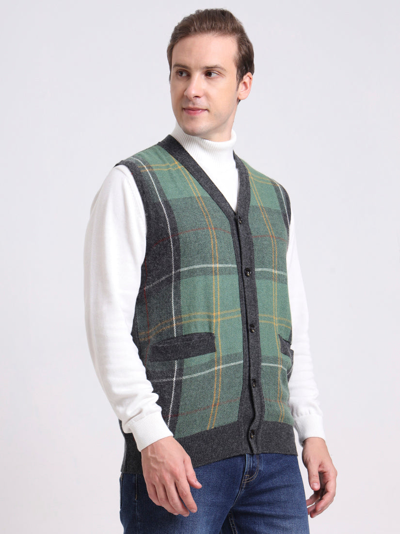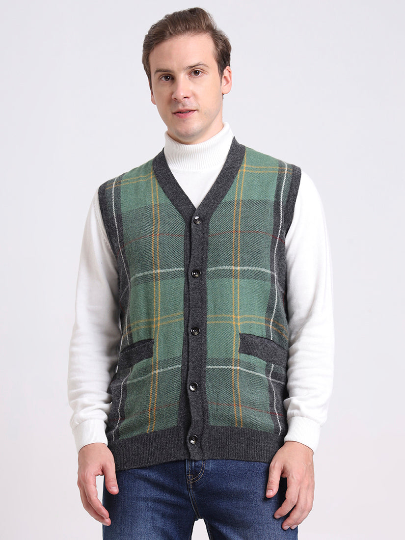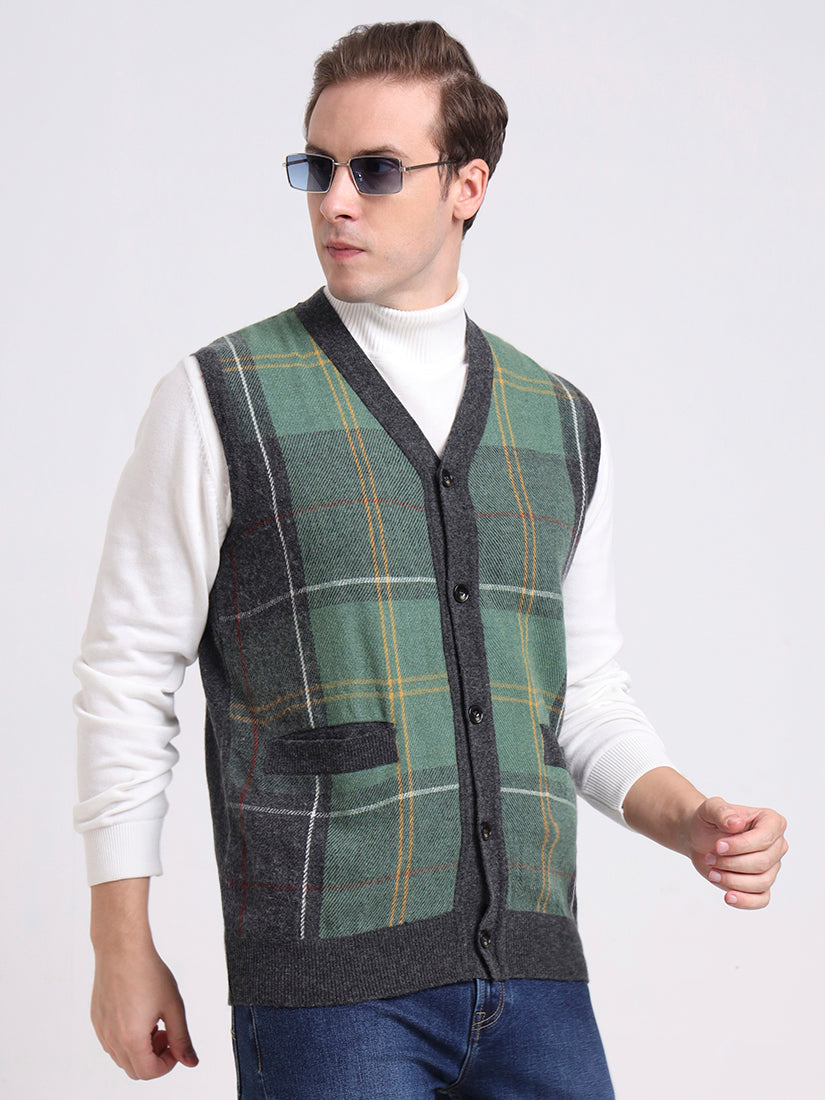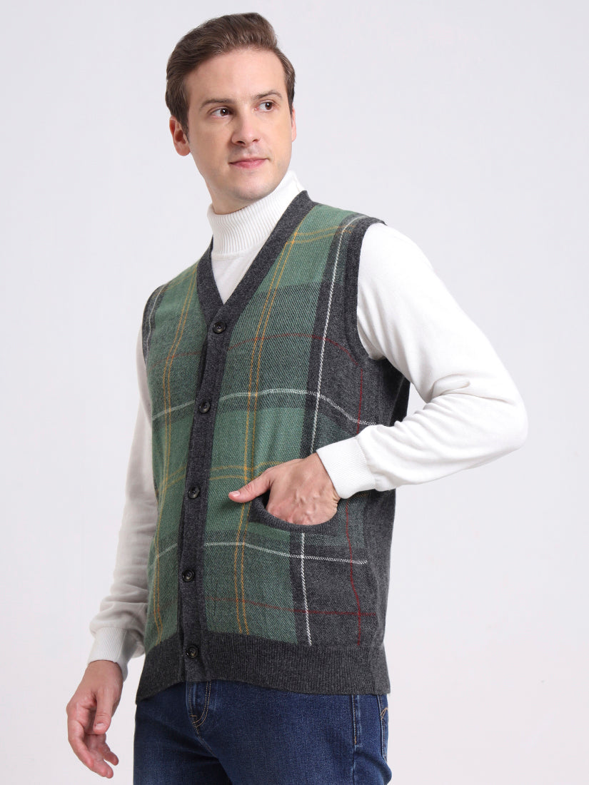 A versatile grey plaid vest that captures quiet sophistication. The sleeveless design with button-down front and pockets makes it an ideal transitional piece — from polished office wear to relaxed weekend dressing.
