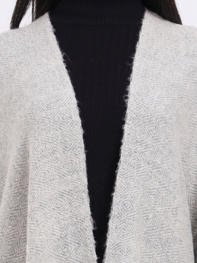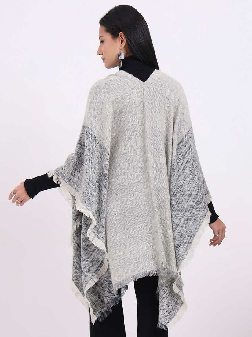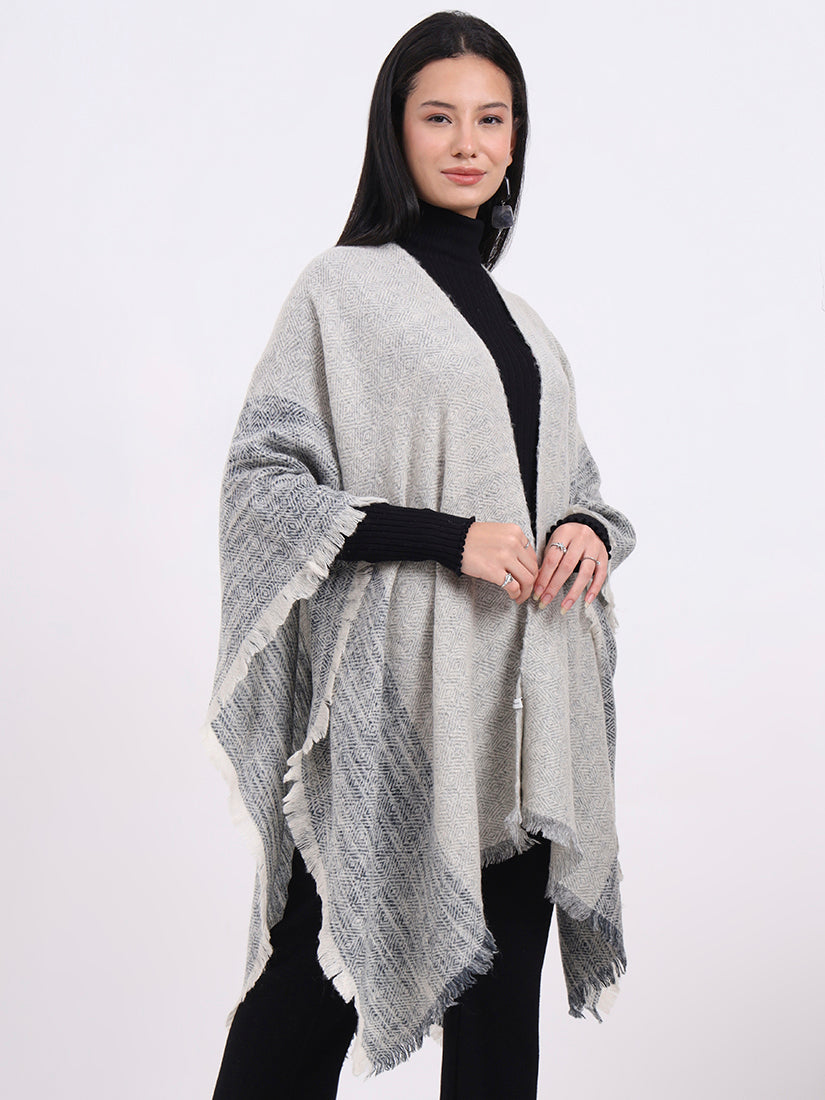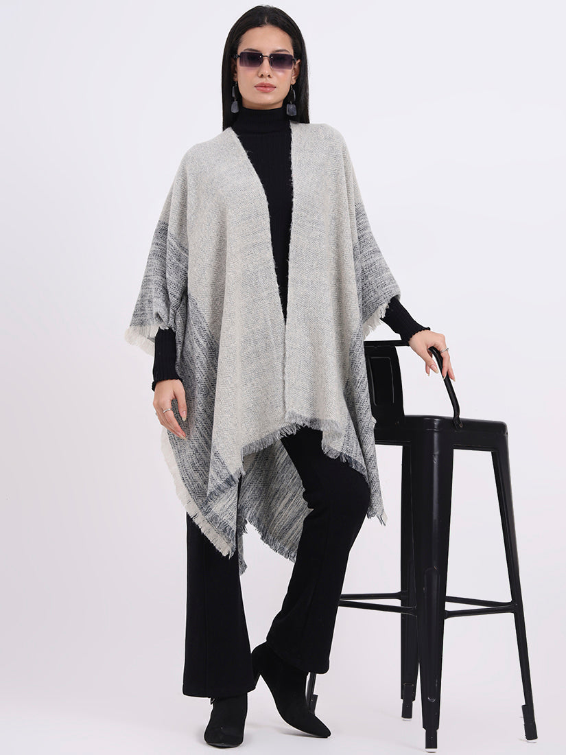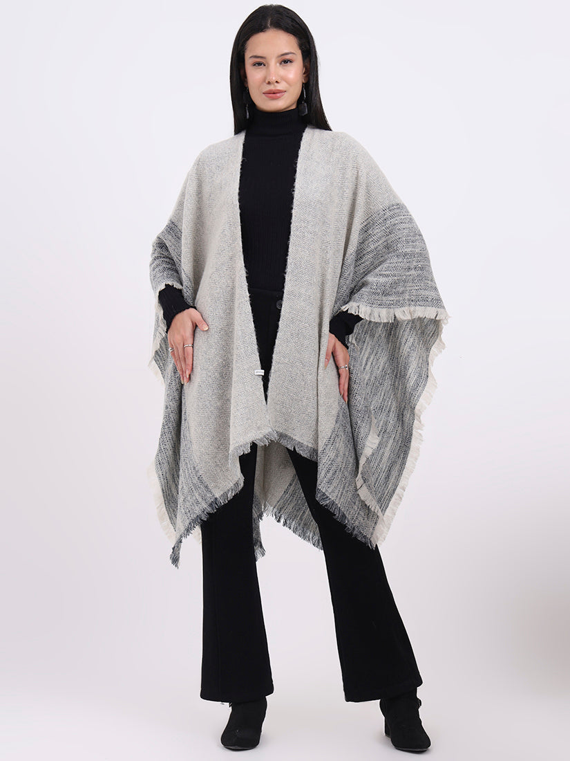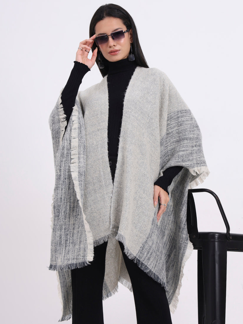 In a muted grey palette, the Stone Mist Cape embodies quiet sophistication. Its handwoven surface carries an artisanal tactility, designed for those who value timeless ease and soft structure.