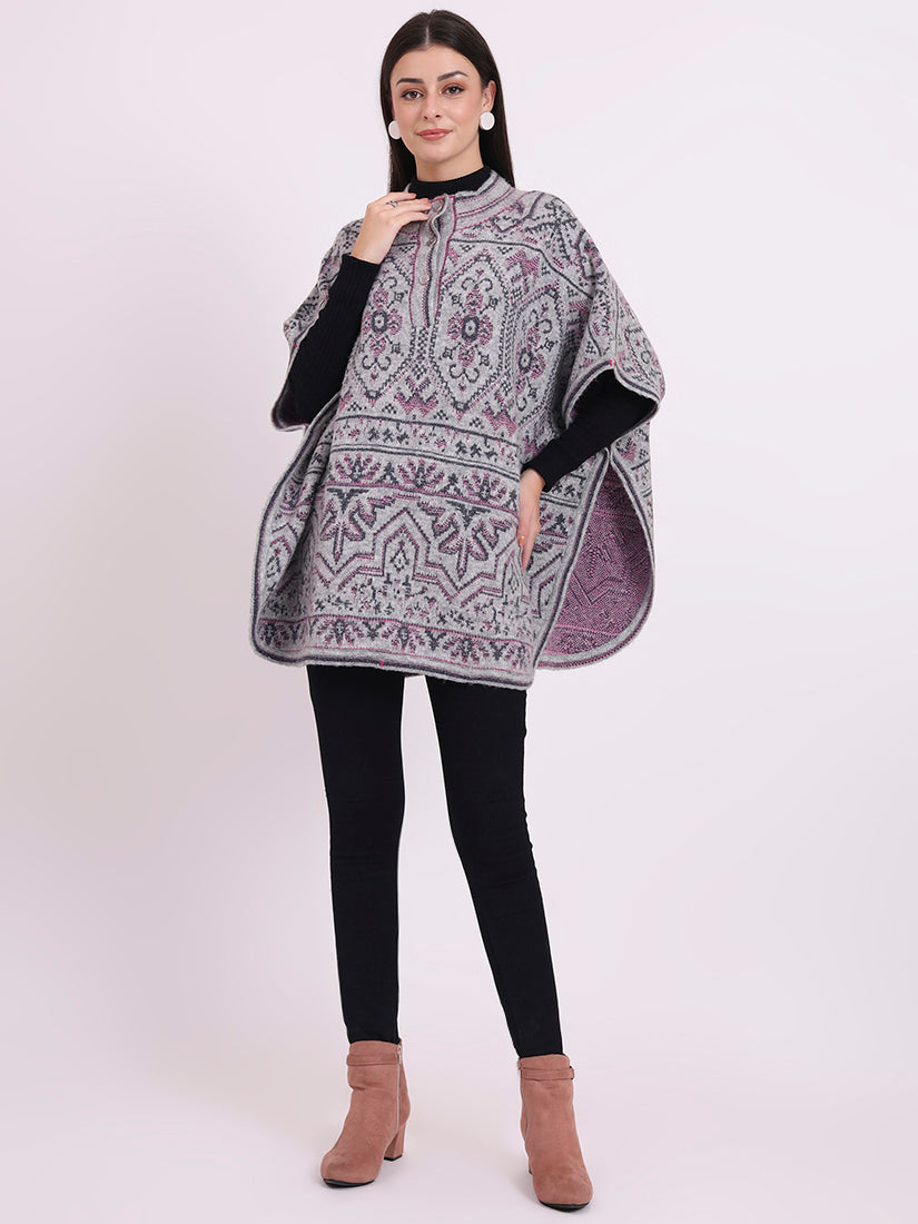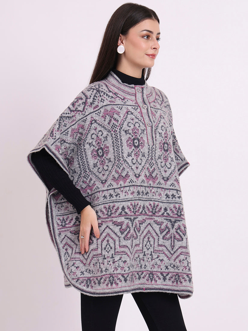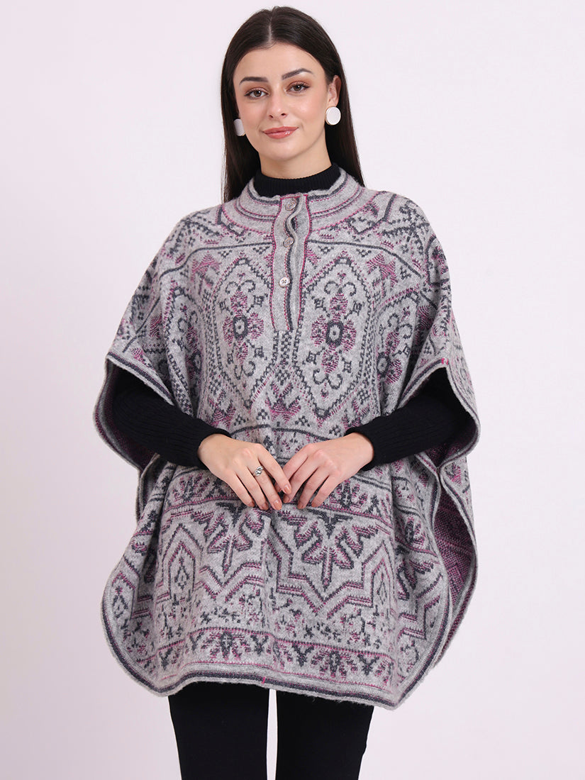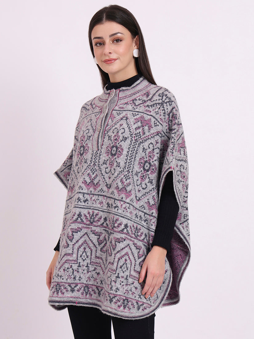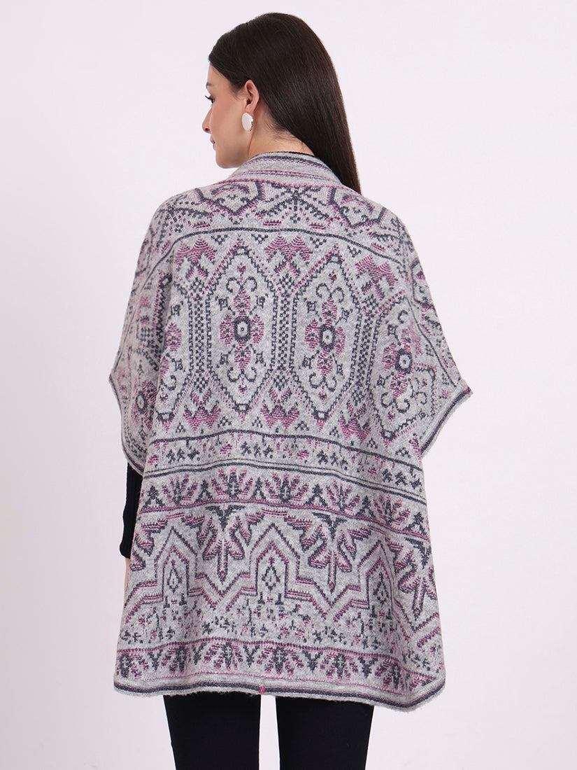 Intricate jacquard motifs give this grey poncho the aura of sculpted stonework. Refined yet strong, it’s an heirloom piece for modern wardrobes.