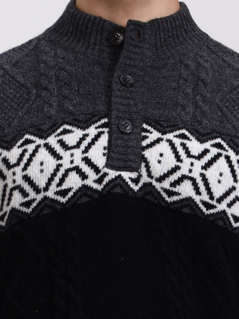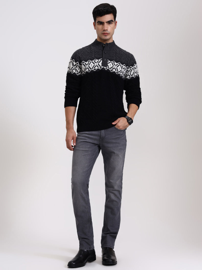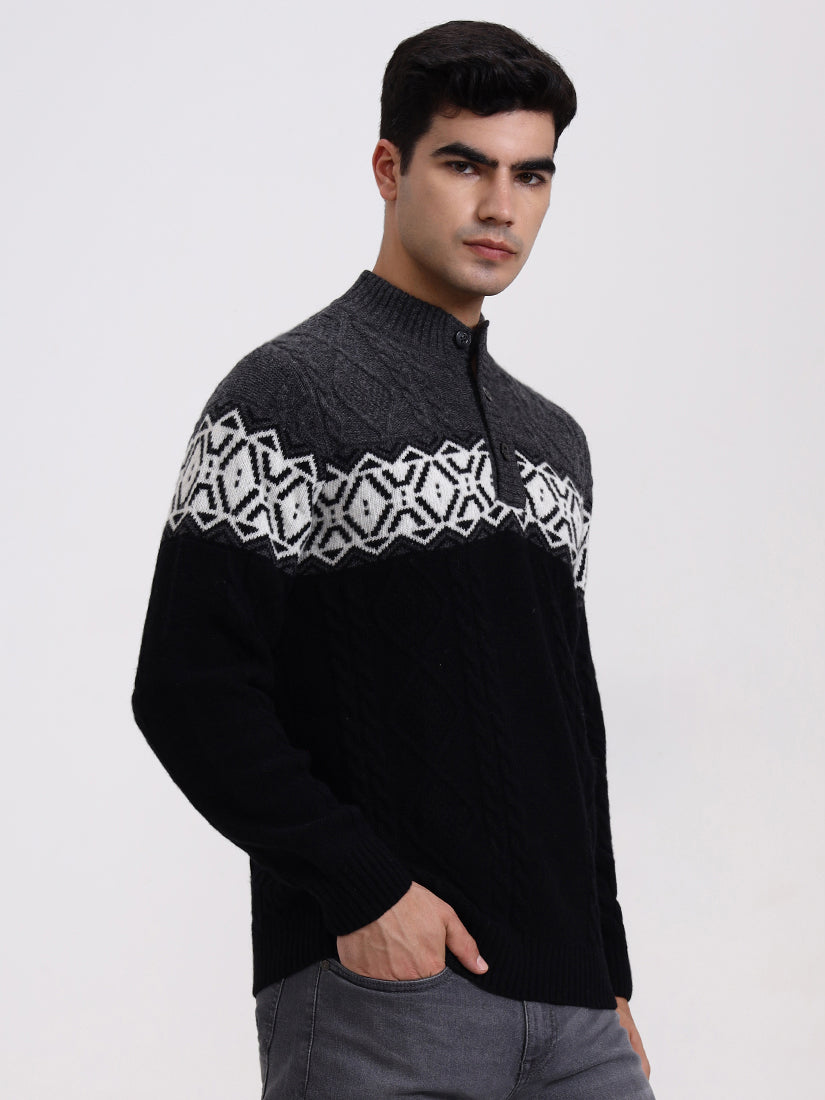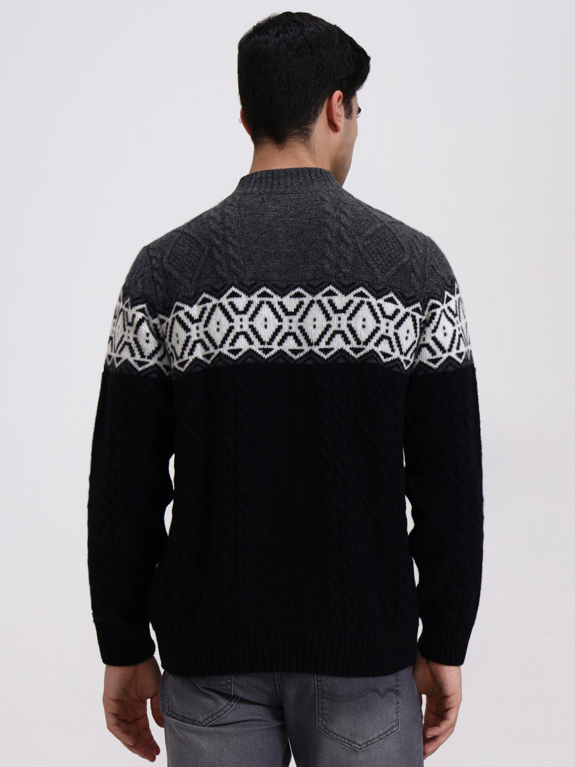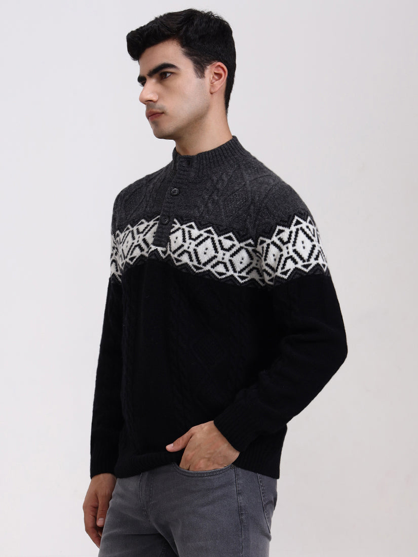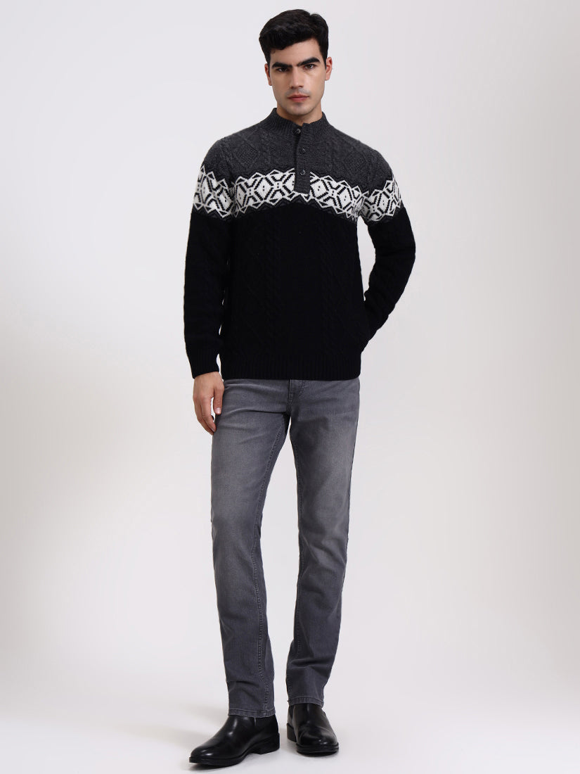 A striking grey and black combination with crisp Nordic-inspired motifs across the chest. Balanced and bold, it’s a modern cold-weather staple with heritage knitting techniques and a contemporary silhouette.