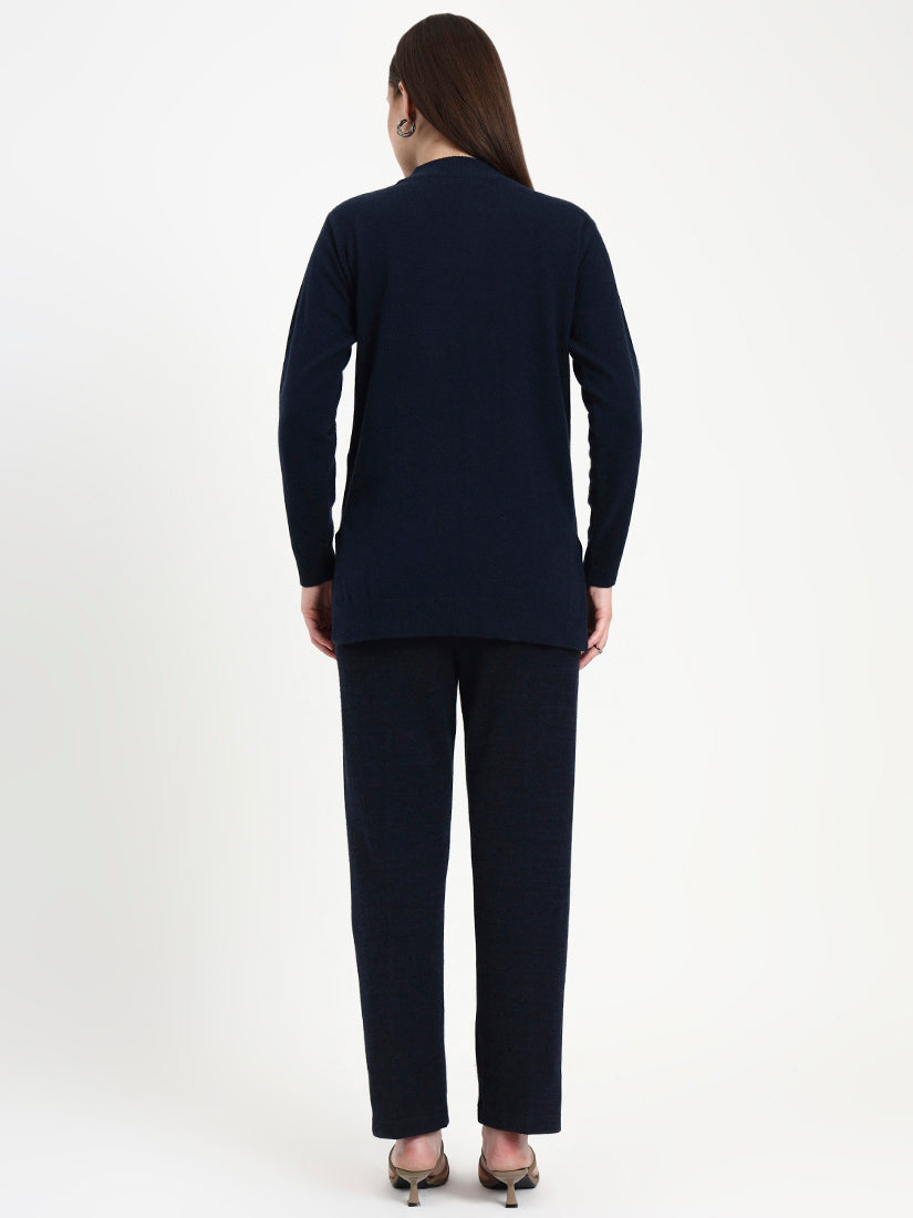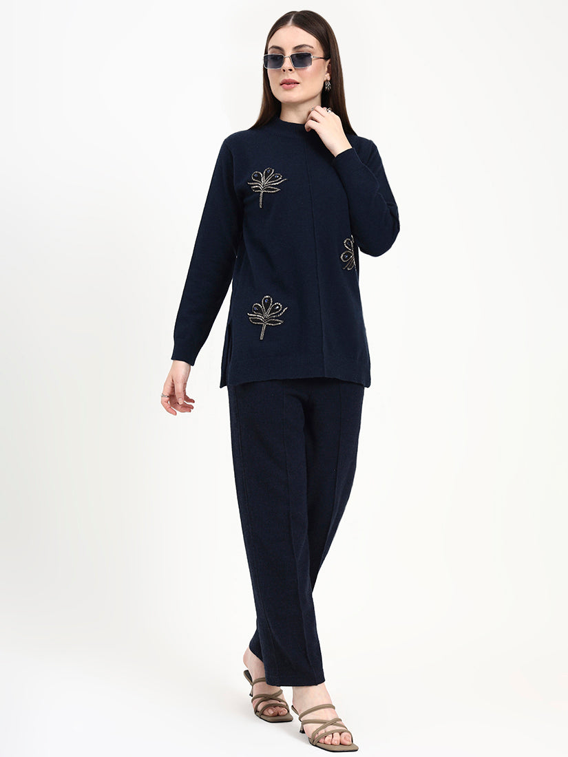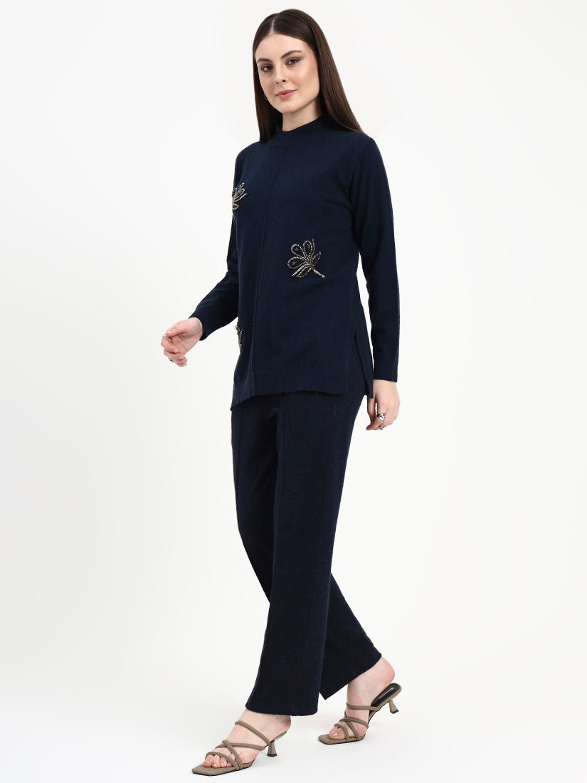 Polished yet effortless, the Celeste Co-ord glows with understated elegance. Embellished floral motifs trace across a deep blue base, offering subtle brilliance against the softness of the finest wool. A timeless piece for day-to-dusk sophistication.