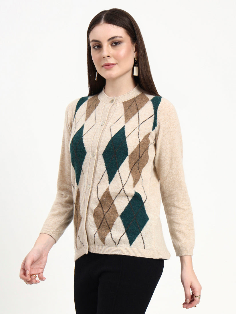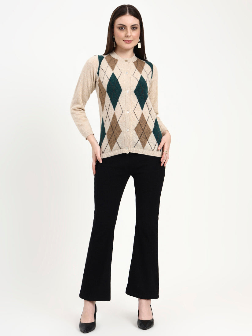 Tonal Diamond Knit Cardigan brings a touch of classic patterning to modern sophistication. The muted tones and diamond motif evoke timeless charm, while the fine knit and tailored fit lend effortless grace to both day and evening dressing.