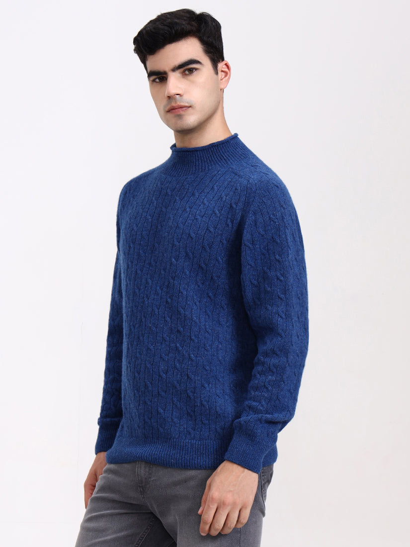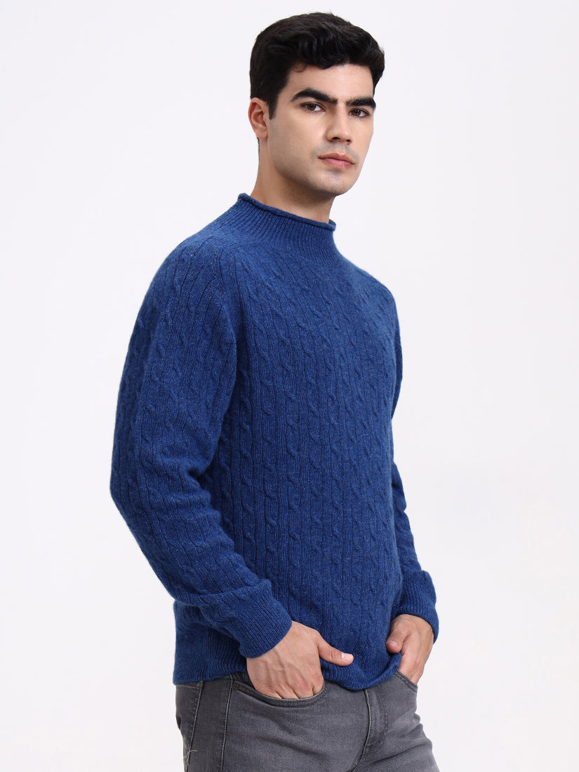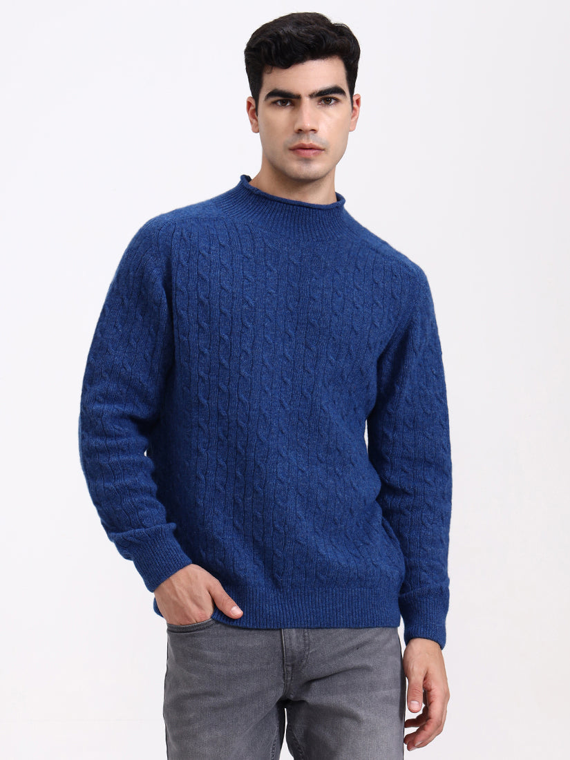 An understated blue-grey, evocative of coastal skies at dusk. The elevated neckline and structured cables lend a quiet masculinity, ideal for smart winter layering.